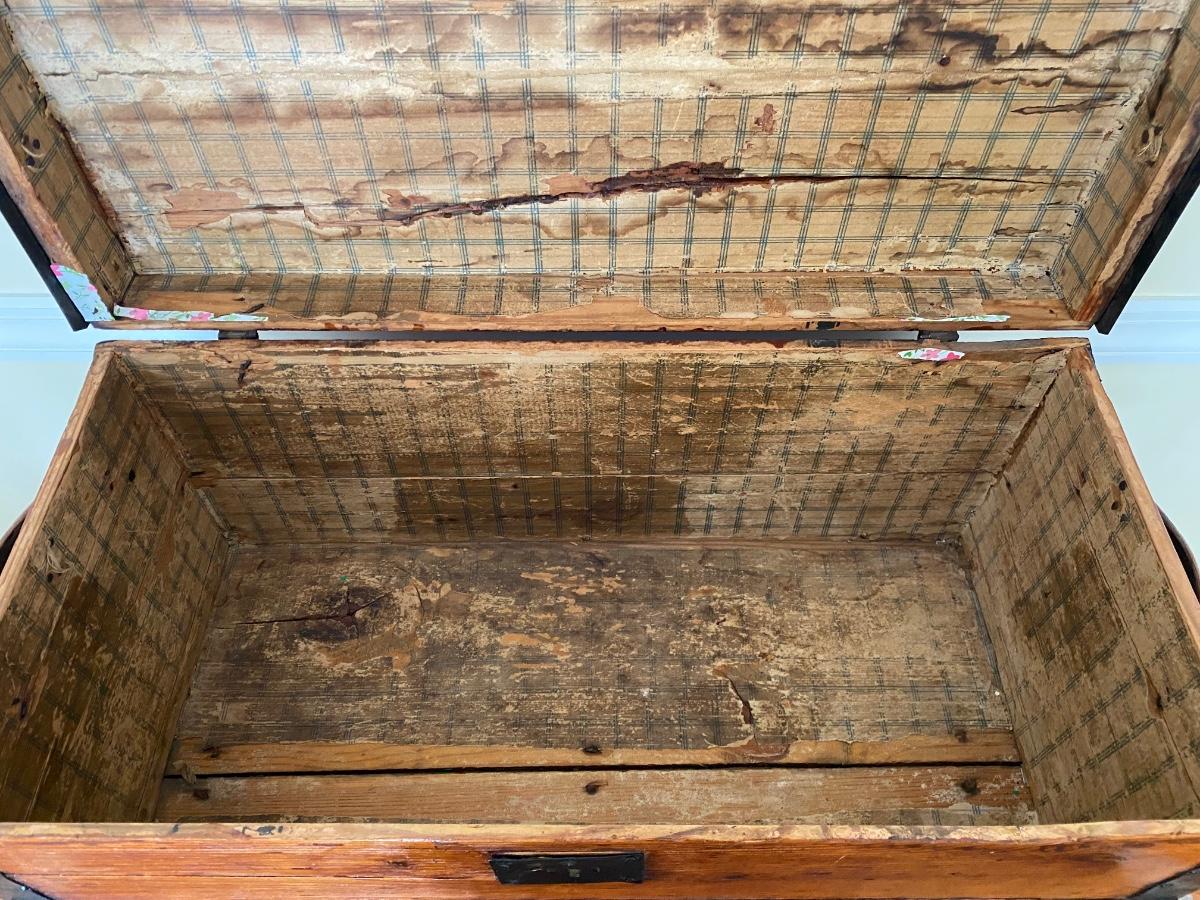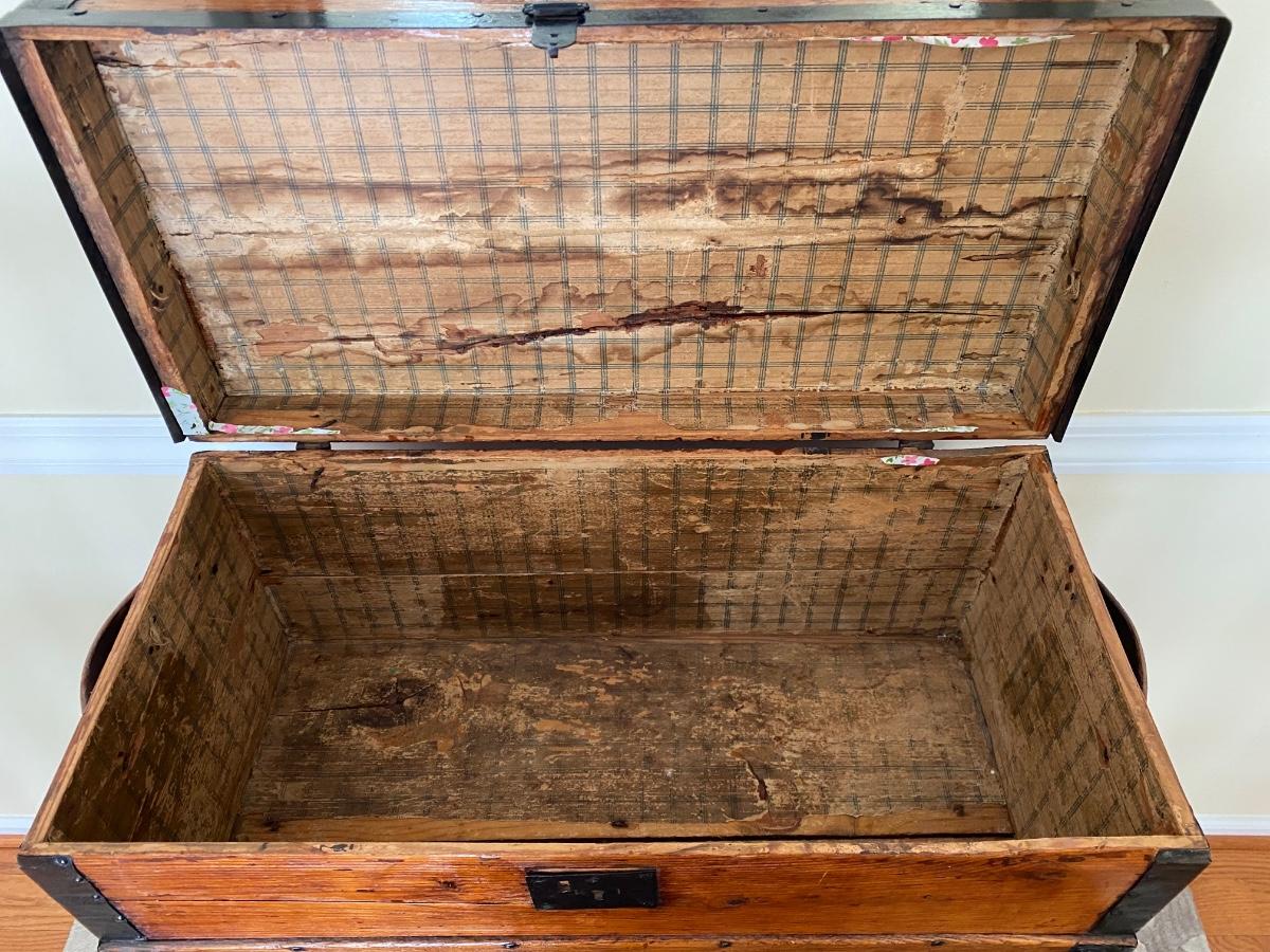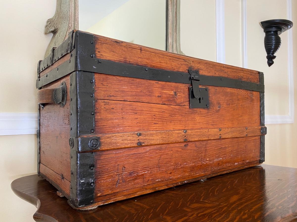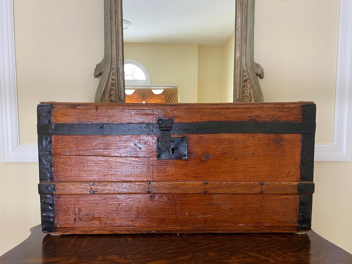 26x13x12 Antique trunk. Perfect size for smaller storage or stacking. Lock has been removed. This was used as an accent piece in a room. Please see all pictures as they are the best representation of the items. The pictures show condition, measurements if taken, and what is included in the lot. Due to the large amount that we photograph and the time frame, we are not always able to take measurements. All items unless noted, are pre-owned and have been used. If you purchased furniture, you must bring help. We do not allow one person to carry large furniture out on their own. Bring help, tools and a truck for the safety of our client’s homes, and your personal safety. Any damages that result to the property including walls, and floors due to moving of the furniture will be charged to the buyer. Company policy. Thank you.