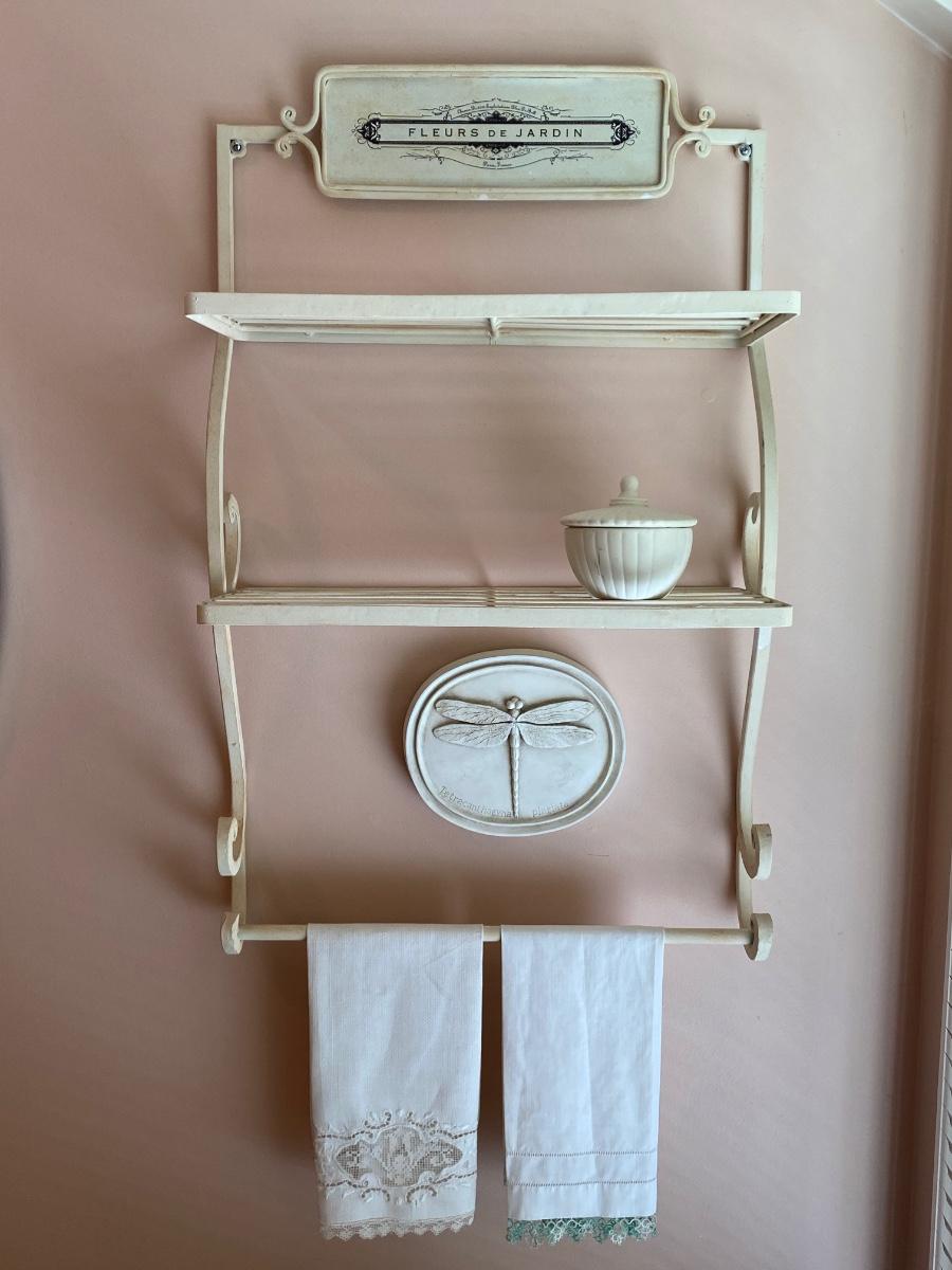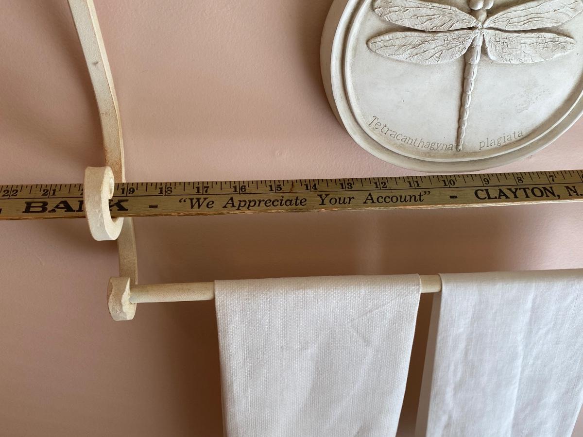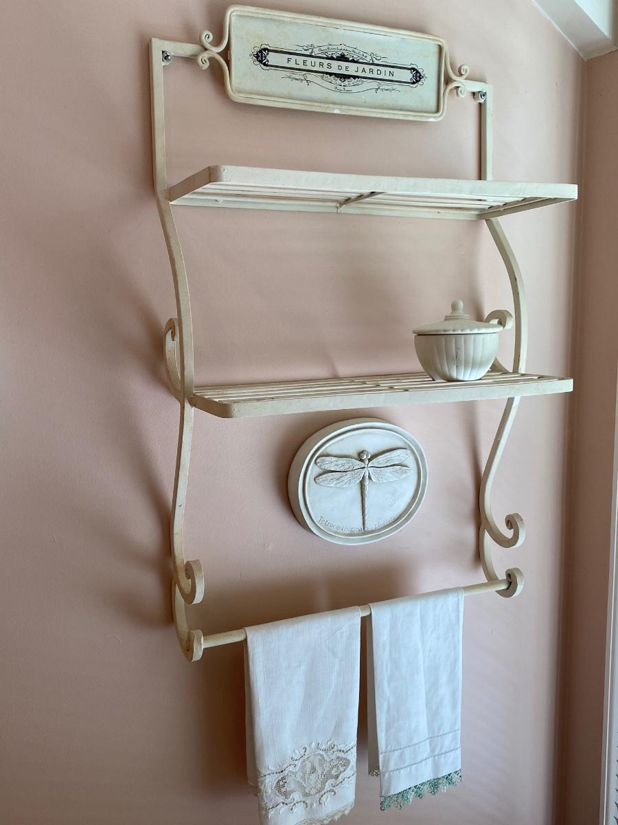 Metal hanging towel rack. Rack includes candle, dragonfly art and decorative hand towels. Please see all pictures as they are the best representation of the items. The pictures show condition, measurements if taken, and what is included in the lot. Due to the large amount that we photograph and the time frame, we are not always able to take measurements. All items unless noted, are pre-owned and have been used. If you purchased furniture, you must bring help. We do not allow one person to carry large furniture out on their own. Bring help, tools and a truck for the safety of our client’s homes, and your personal safety. Any damages that result to the property including walls, and floors due to moving of the furniture will be charged to the buyer. Company policy. Thank you.