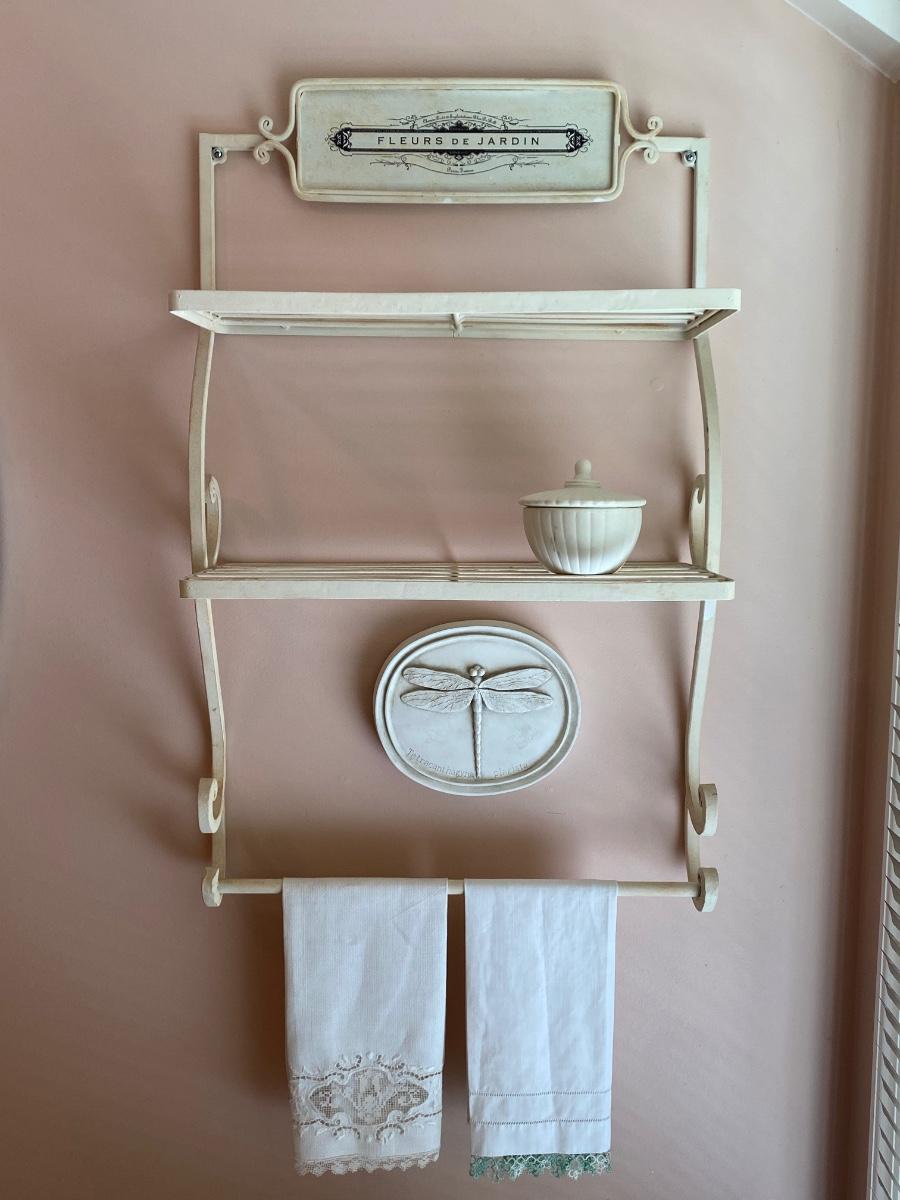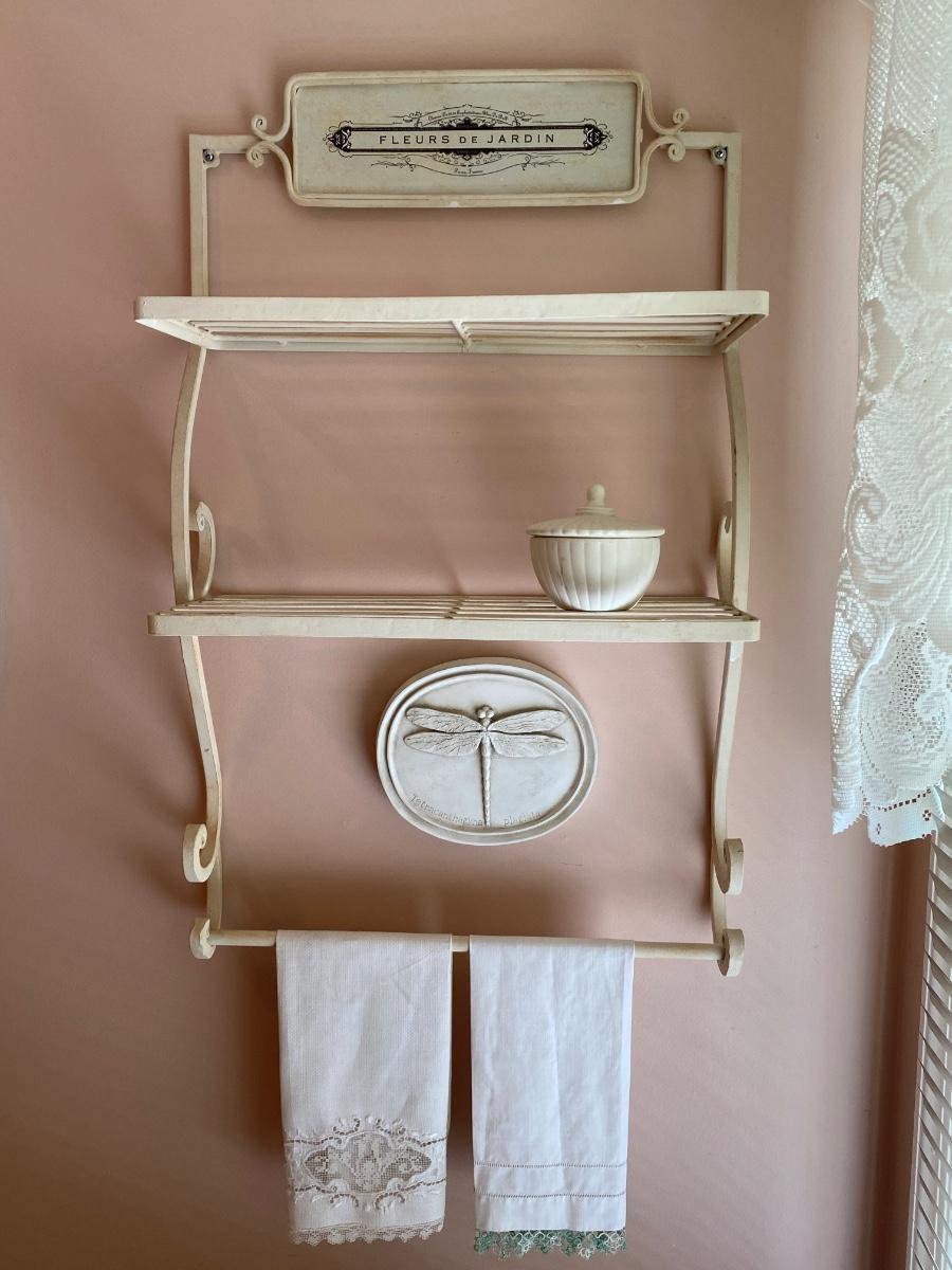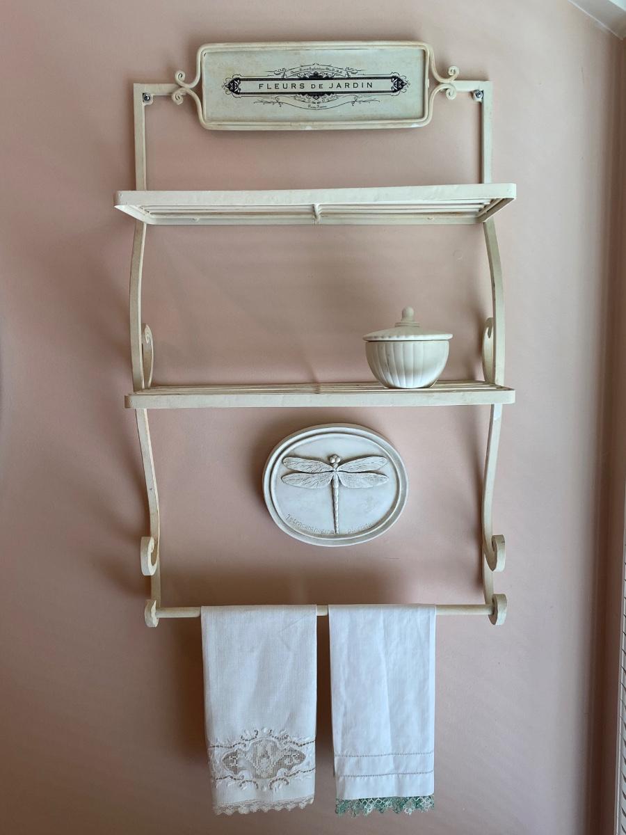 Metal hanging towel rack. Rack includes candle, dragonfly art and decorative hand towels. Please see all pictures as they are the best representation of the items. The pictures show condition, measurements if taken, and what is included in the lot. Due to the large amount that we photograph and the time frame, we are not always able to take measurements. All items unless noted, are pre-owned and have been used. If you purchased furniture, you must bring help. We do not allow one person to carry large furniture out on their own. Bring help, tools and a truck for the safety of our client’s homes, and your personal safety. Any damages that result to the property including walls, and floors due to moving of the furniture will be charged to the buyer. Company policy. Thank you.
