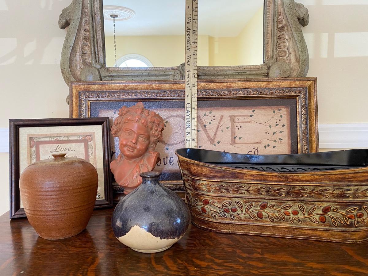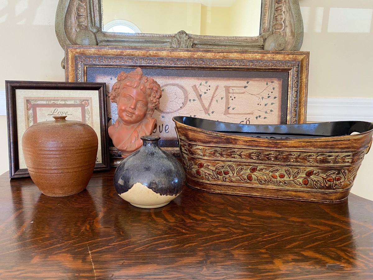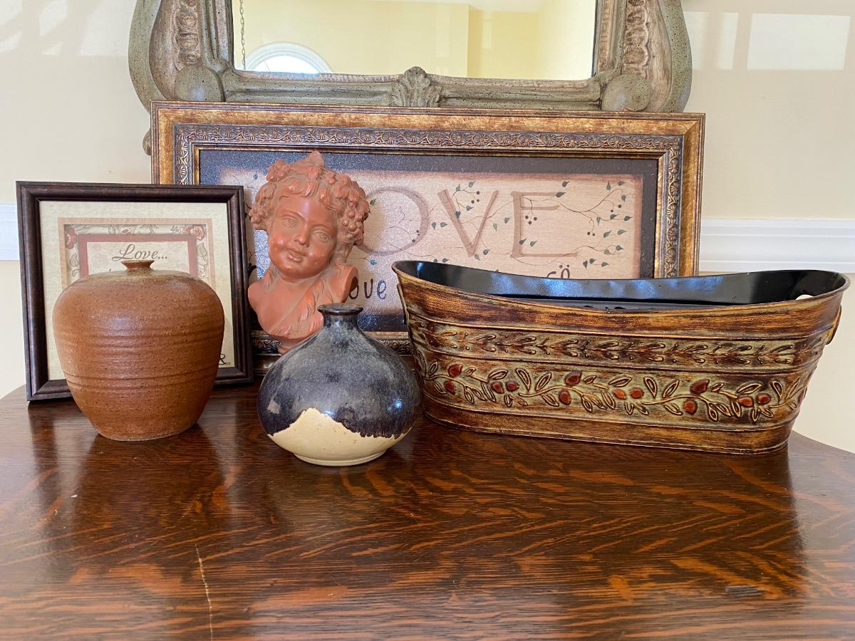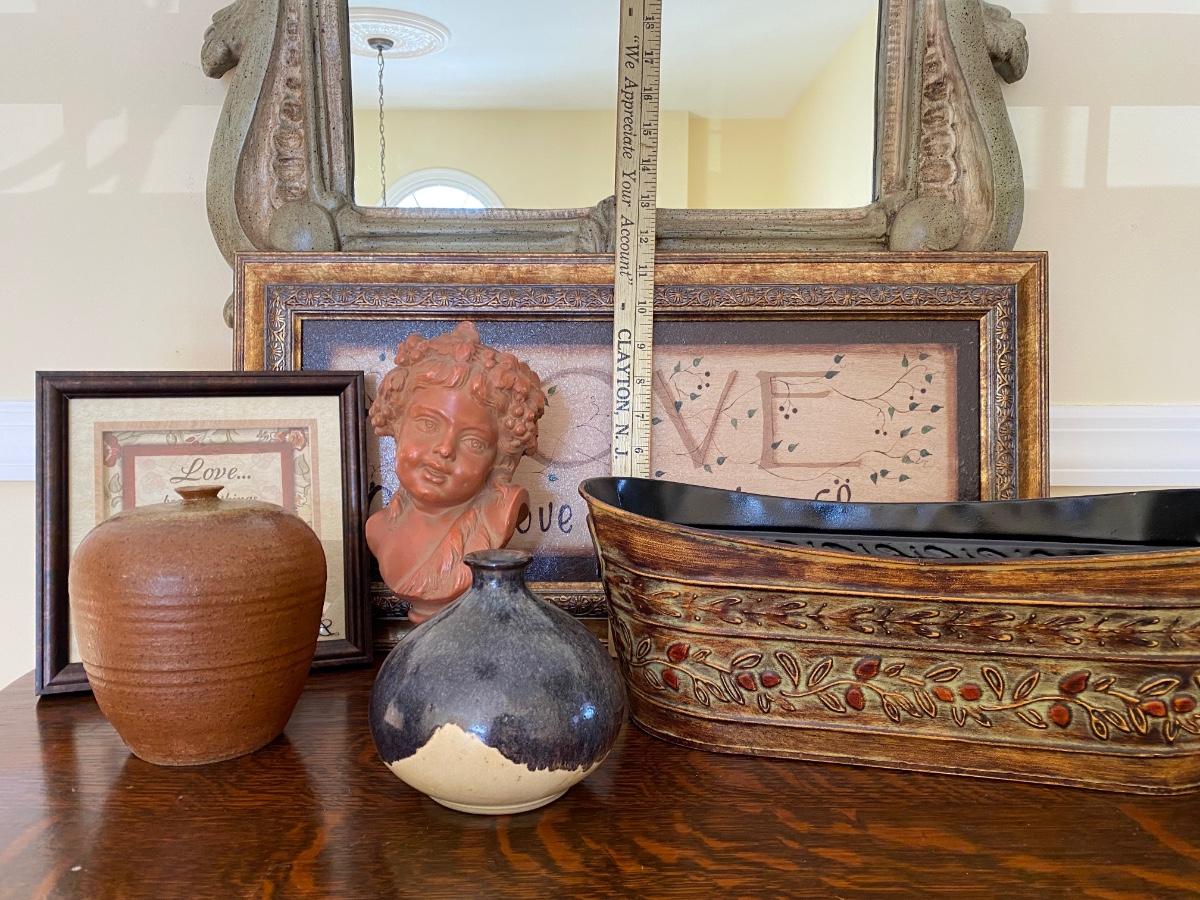 Mixed lot of home decor. Pottery, framed prints and more. Please see all pictures as they are the best representation of the items. The pictures show condition, measurements if taken, and what is included in the lot. Due to the large amount that we photograph and the time frame, we are not always able to take measurements. All items unless noted, are pre-owned and have been used. If you purchased furniture, you must bring help. We do not allow one person to carry large furniture out on their own. Bring help, tools and a truck for the safety of our client’s homes, and your personal safety. Any damages that result to the property including walls, and floors due to moving of the furniture will be charged to the buyer. Company policy. Thank you.
