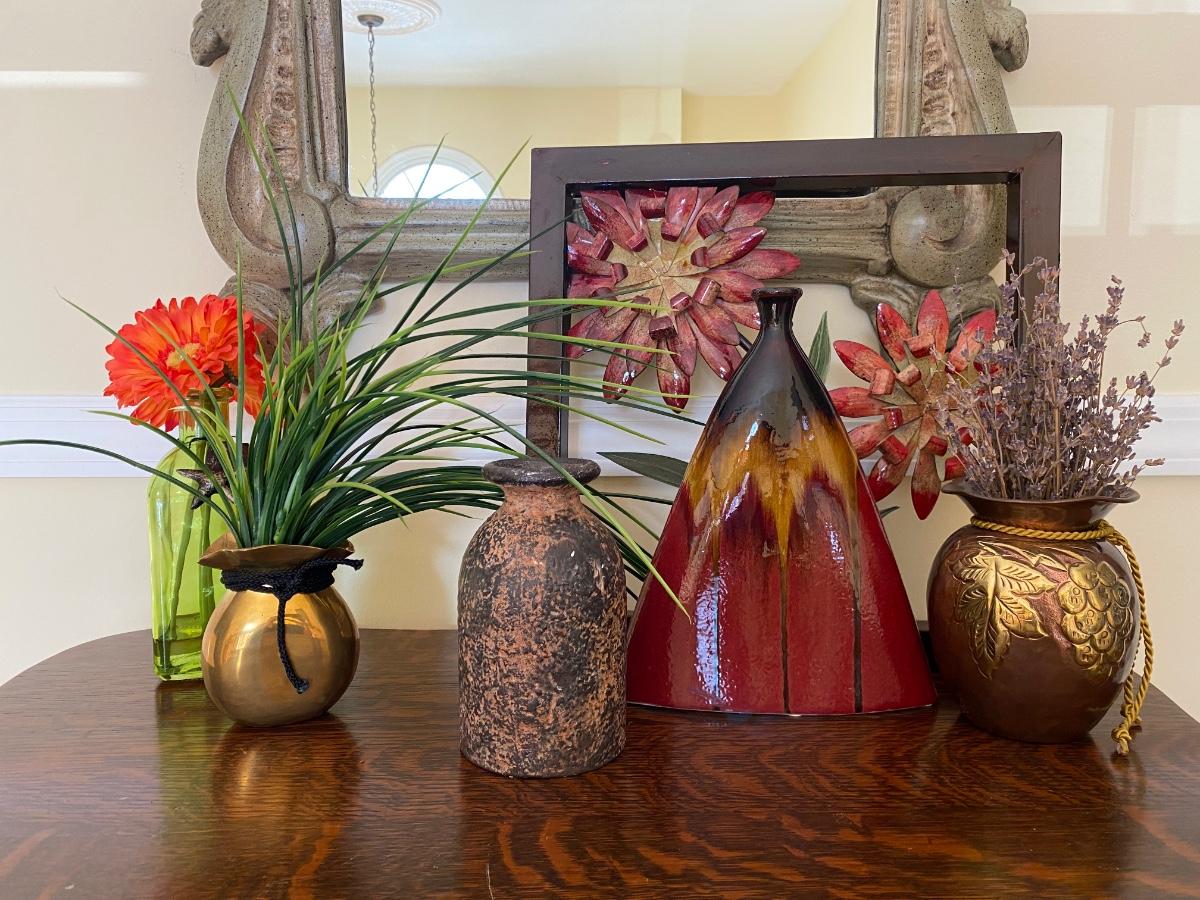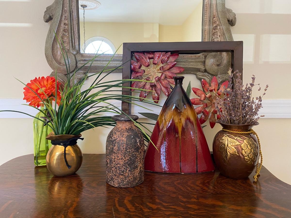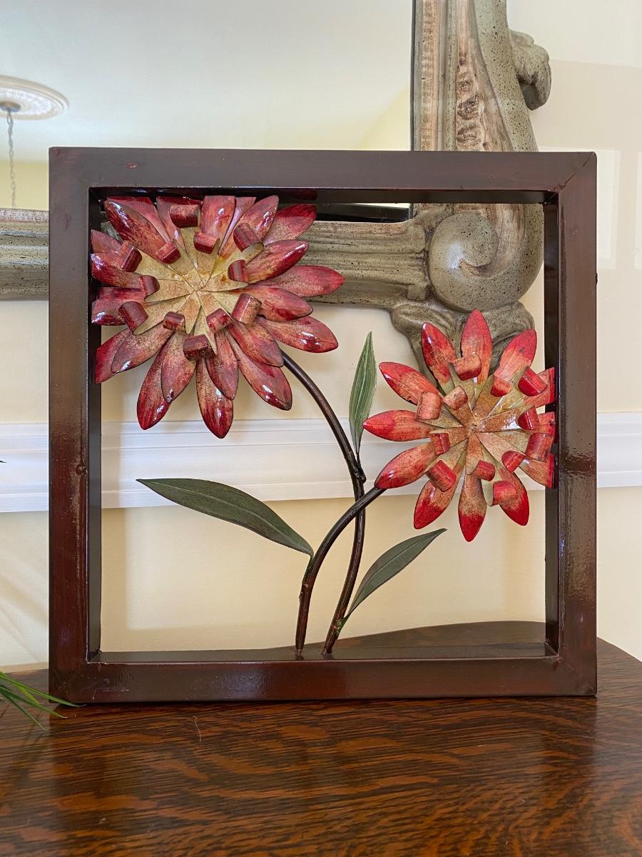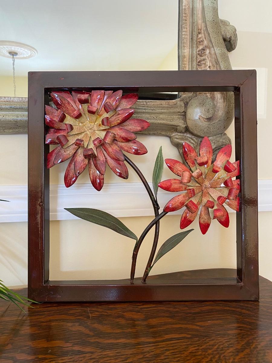Floral home accents. Framed metal art, pottery and vases with artificial flowers. Please see all pictures as they are the best representation of the items. The pictures show condition, measurements if taken, and what is included in the lot. Due to the large amount that we photograph and the time frame, we are not always able to take measurements. All items unless noted, are pre-owned and have been used. If you purchased furniture, you must bring help. We do not allow one person to carry large furniture out on their own. Bring help, tools and a truck for the safety of our client’s homes, and your personal safety. Any damages that result to the property including walls, and floors due to moving of the furniture will be charged to the buyer. Company policy. Thank you.
