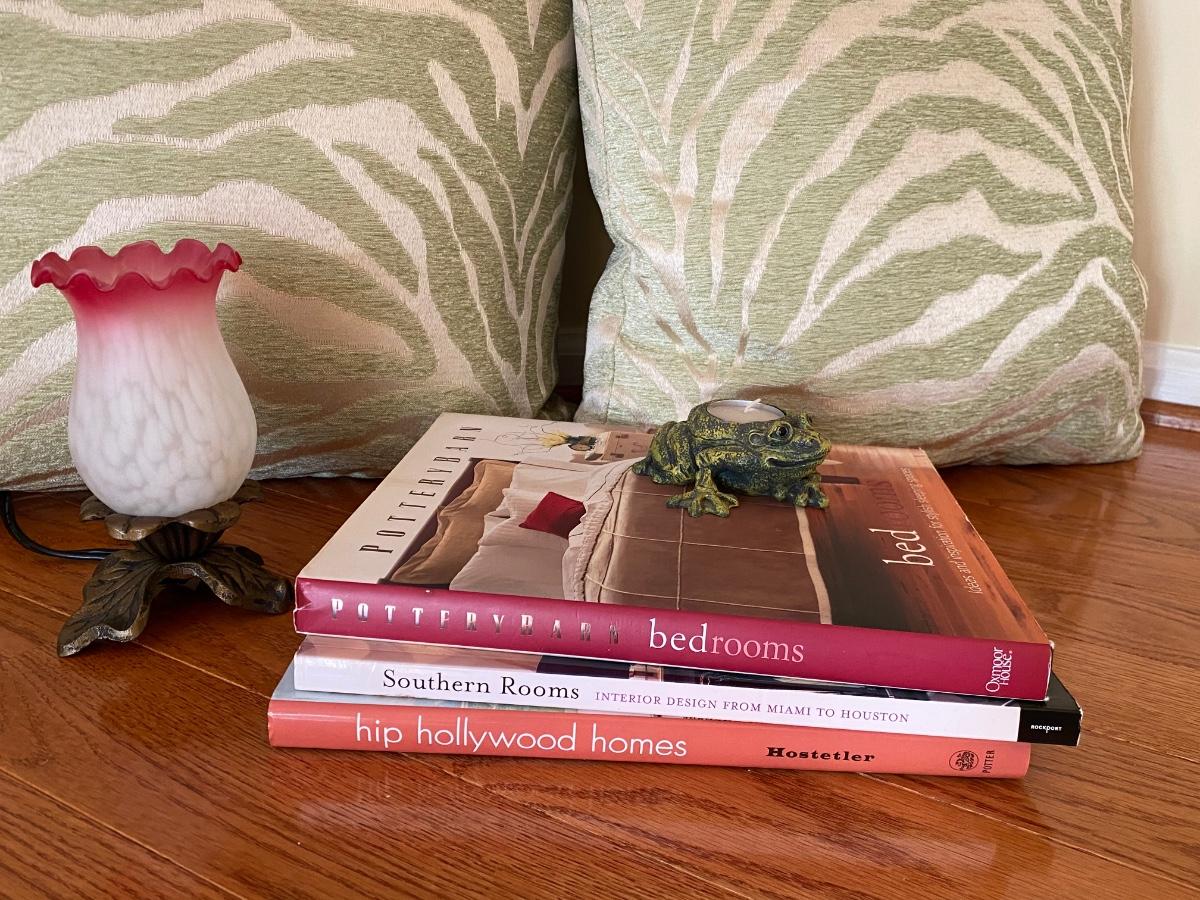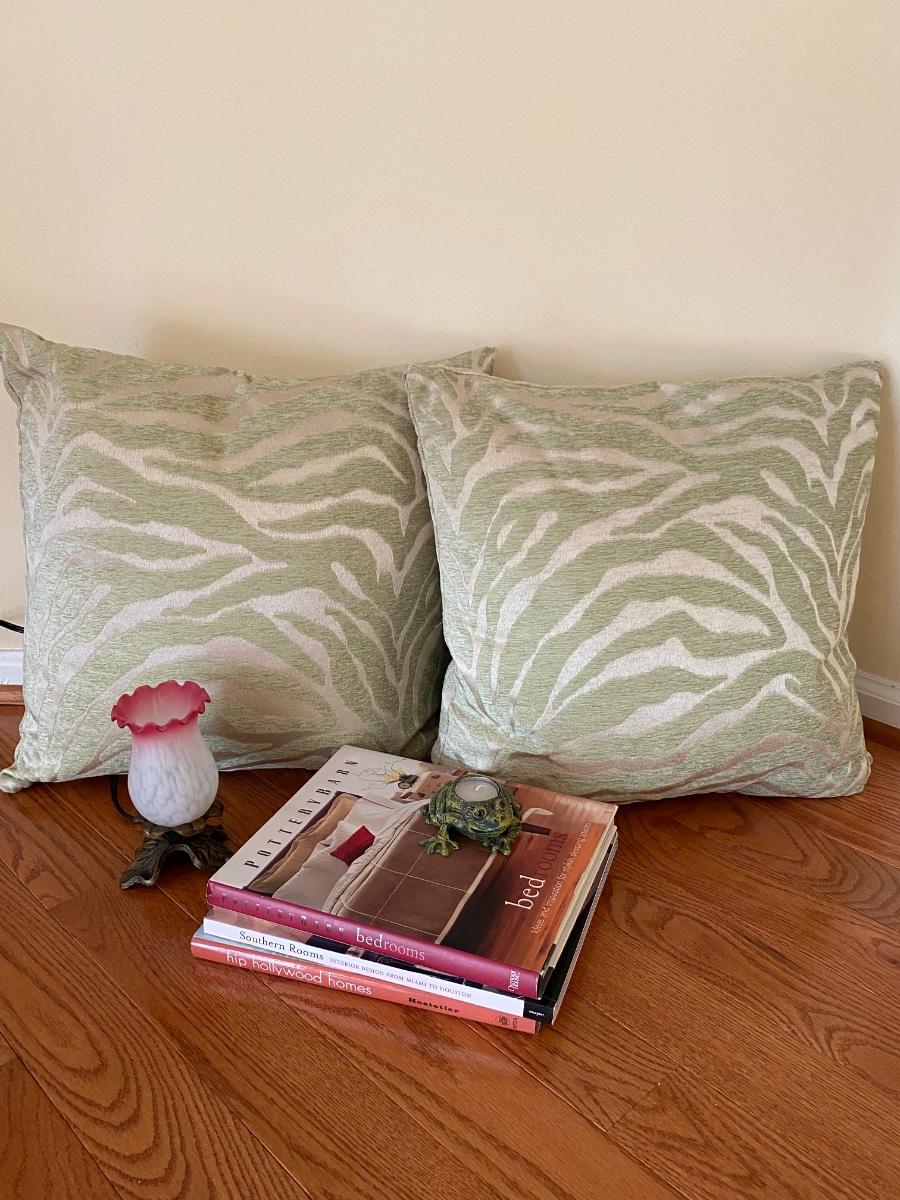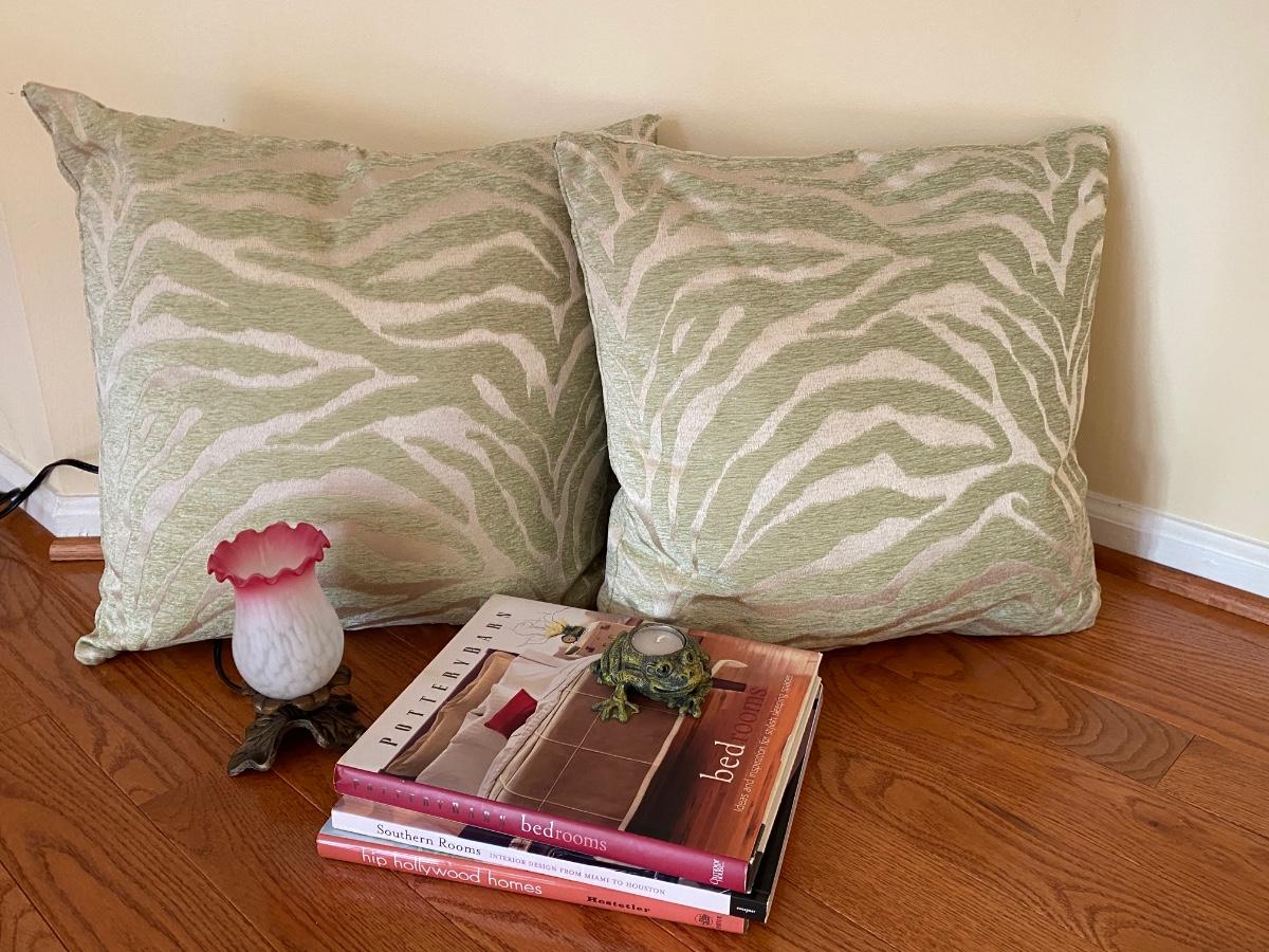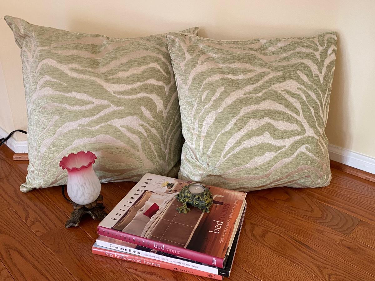 Two green animal print pillows, books on home decor and small accent lamp. Please see all pictures as they are the best representation of the items. The pictures show condition, measurements if taken, and what is included in the lot. Due to the large amount that we photograph and the time frame, we are not always able to take measurements. All items unless noted, are pre-owned and have been used. If you purchased furniture, you must bring help. We do not allow one person to carry large furniture out on their own. Bring help, tools and a truck for the safety of our client’s homes, and your personal safety. Any damages that result to the property including walls, and floors due to moving of the furniture will be charged to the buyer. Company policy. Thank you.