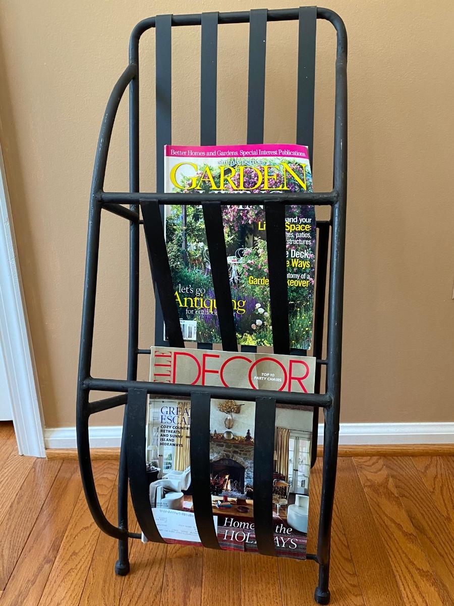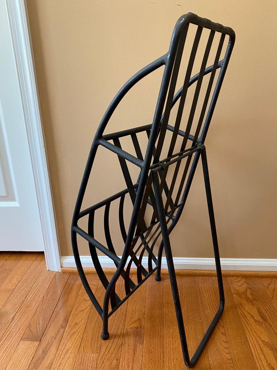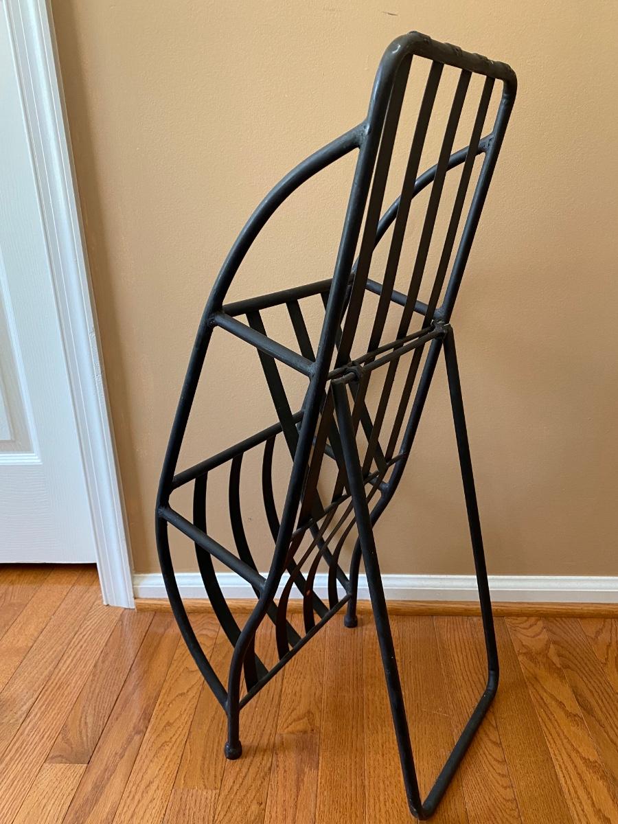 Unique piece perfect for any room. Metal rack holds magazines or books. Does not come with magazines Please see all pictures as they are the best representation of the items. The pictures show condition, measurements if taken, and what is included in the lot. Due to the large amount that we photograph and the time frame, we are not always able to take measurements. All items unless noted, are pre-owned and have been used. If you purchased furniture, you must bring help. We do not allow one person to carry large furniture out on their own. Bring help, tools and a truck for the safety of our client’s homes, and your personal safety. Any damages that result to the property including walls, and floors due to moving of the furniture will be charged to the buyer. Company policy. Thank you.
