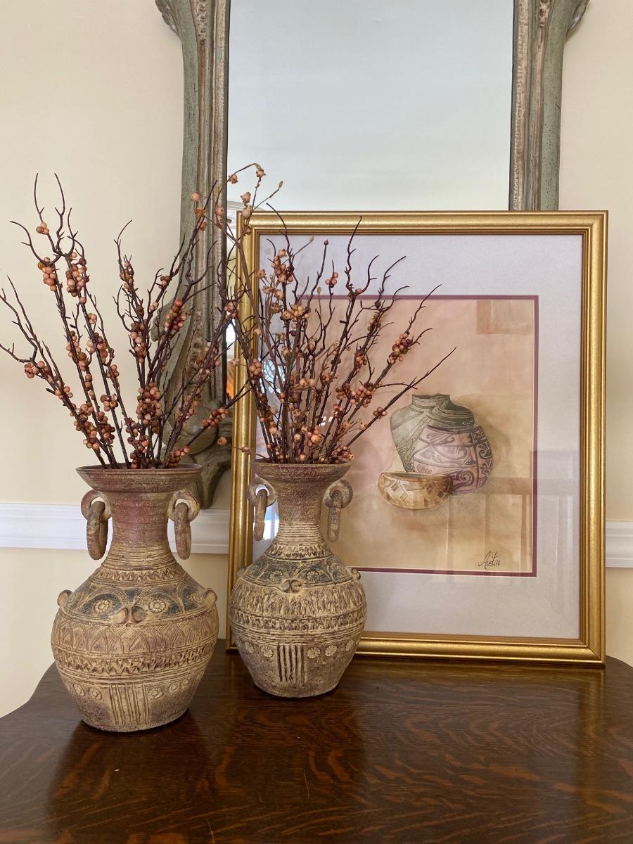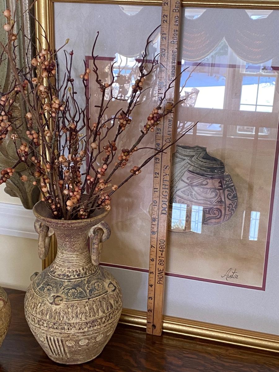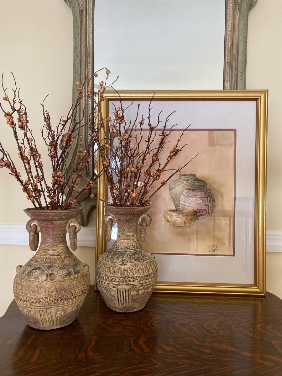 Modern decor pottery vases and framed pottery print. Please see all pictures as they are the best representation of the items. The pictures show condition, measurements if taken, and what is included in the lot. Due to the large amount that we photograph and the time frame, we are not always able to take measurements. All items unless noted, are pre-owned and have been used. If you purchased furniture, you must bring help. We do not allow one person to carry large furniture out on their own. Bring help, tools and a truck for the safety of our client’s homes, and your personal safety. Any damages that result to the property including walls, and floors due to moving of the furniture will be charged to the buyer. Company policy. Thank you.