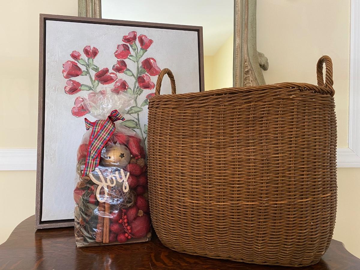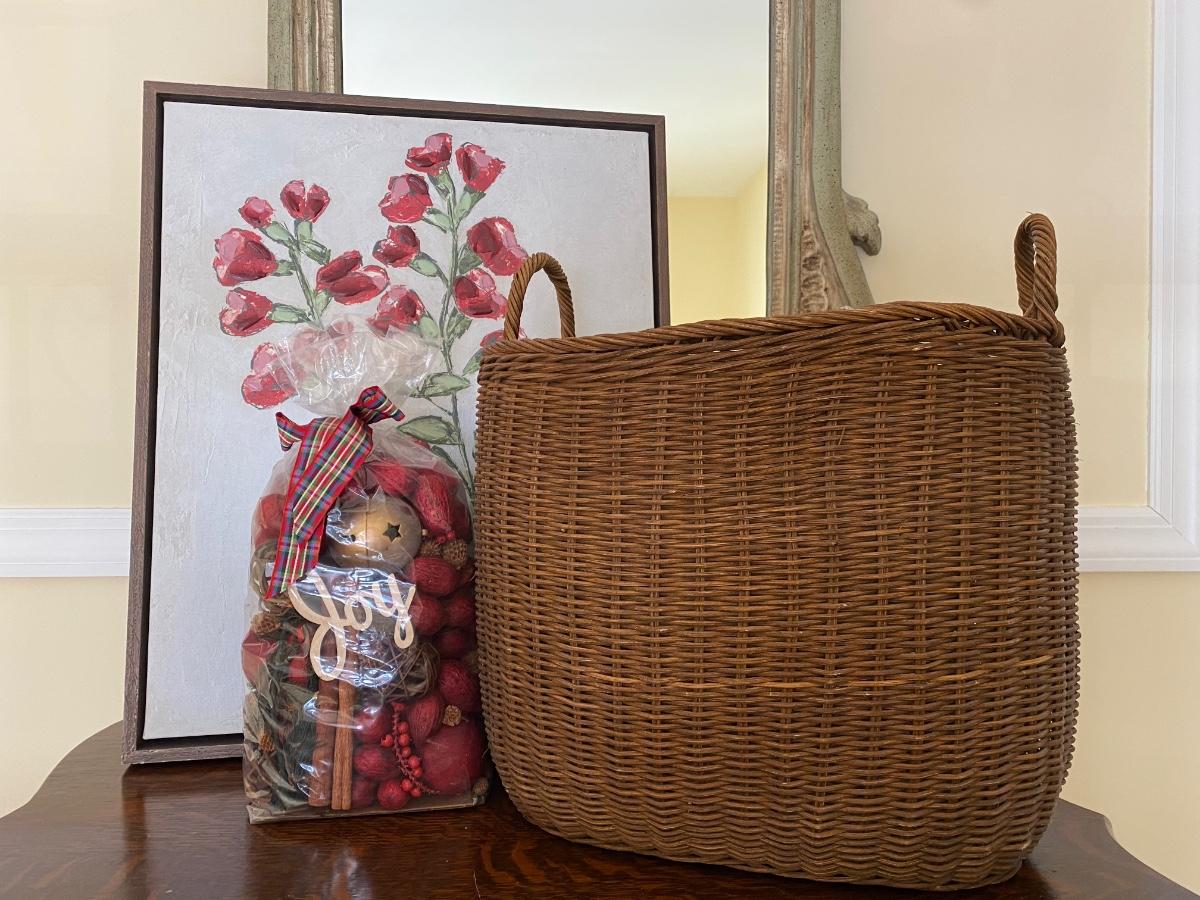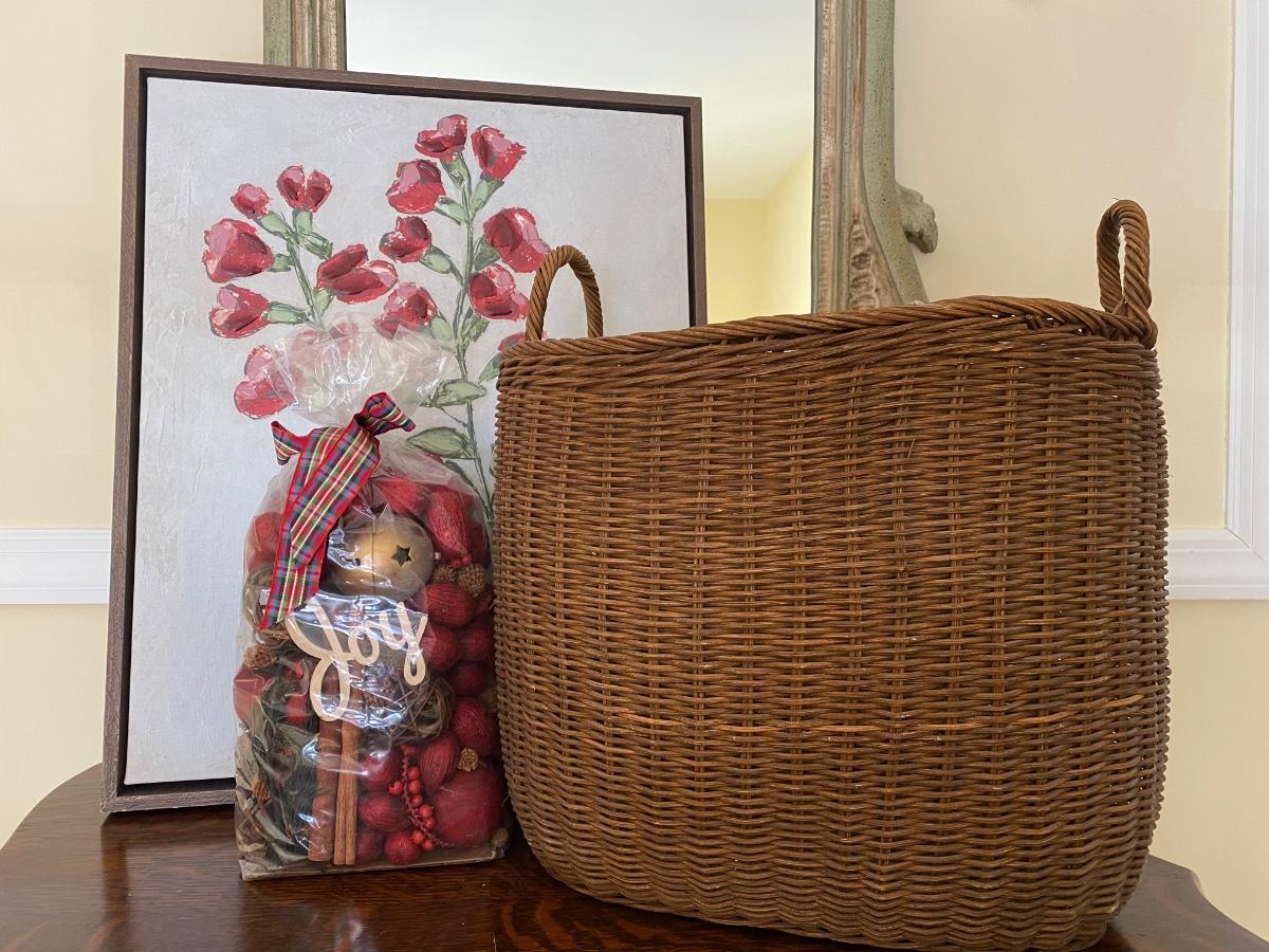 Lot 235G: Home Decor Collection: Large Basket, Floral Artwork & More