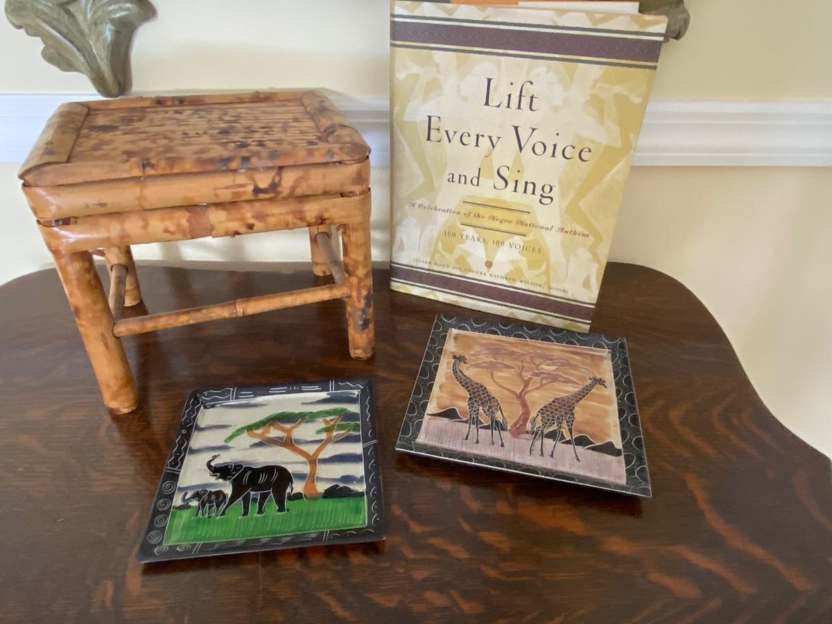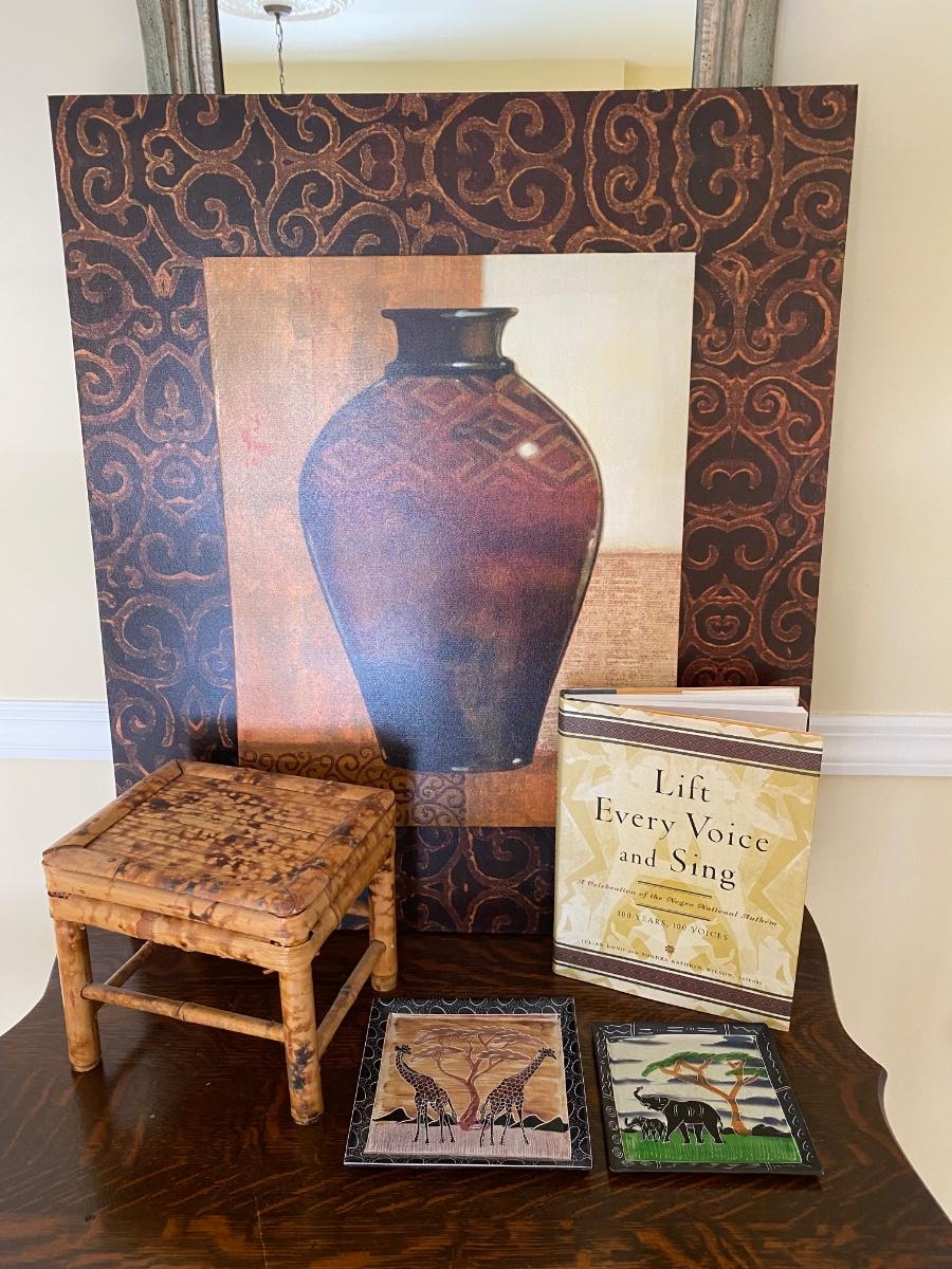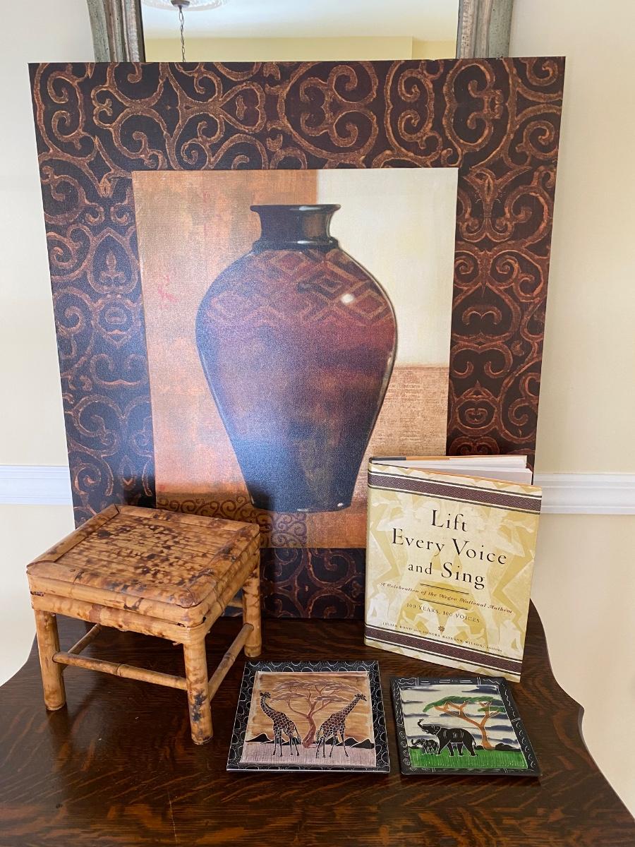 Lot 237G: Large Wall Art, Plant Stand, Trinket Plates Made in Kenya and More