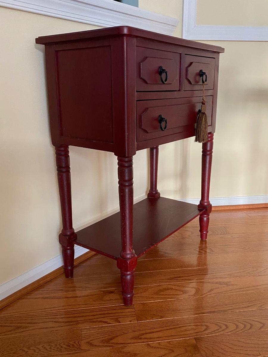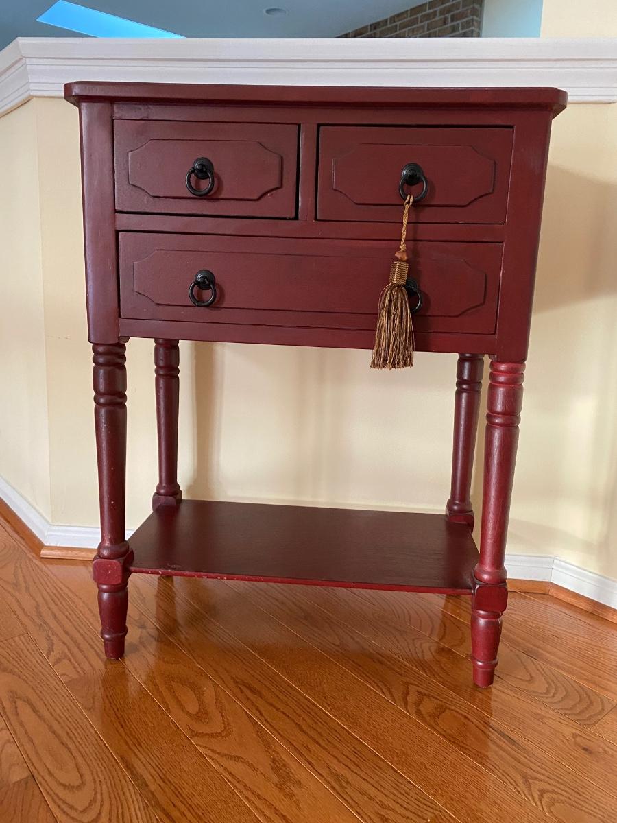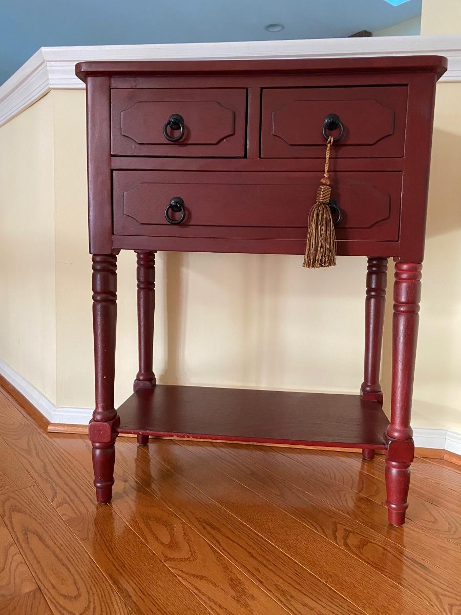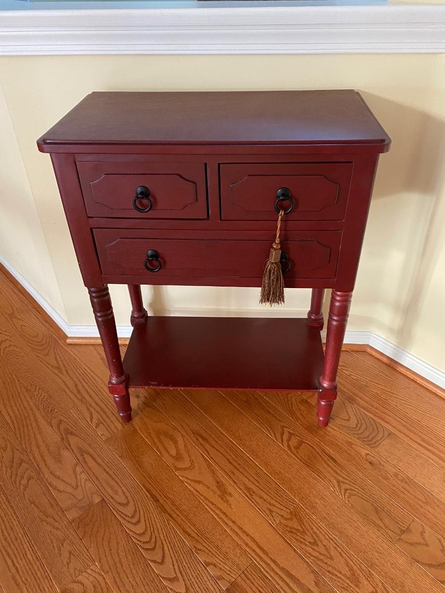 Adorable accent table. Three drawers and lower shelf. Please see all pictures as they are the best representation of the items. The pictures show condition, measurements if taken, and what is included in the lot. Due to the large amount that we photograph and the time frame, we are not always able to take measurements. All items unless noted, are pre-owned and have been used. If you purchased furniture, you must bring help. We do not allow one person to carry large furniture out on their own. Bring help, tools and a truck for the safety of our client’s homes, and your personal safety. Any damages that result to the property including walls, and floors due to moving of the furniture will be charged to the buyer. Company policy. Thank you.