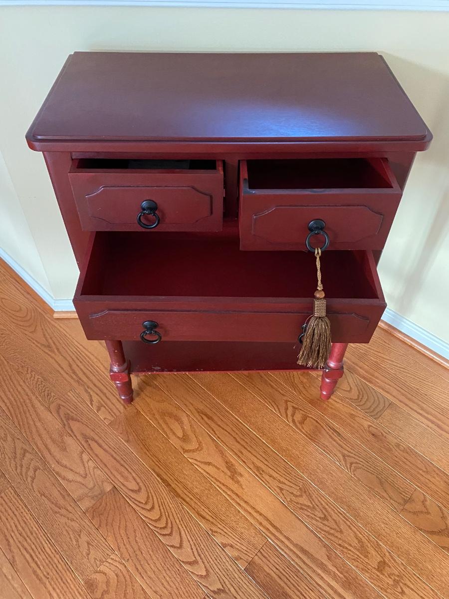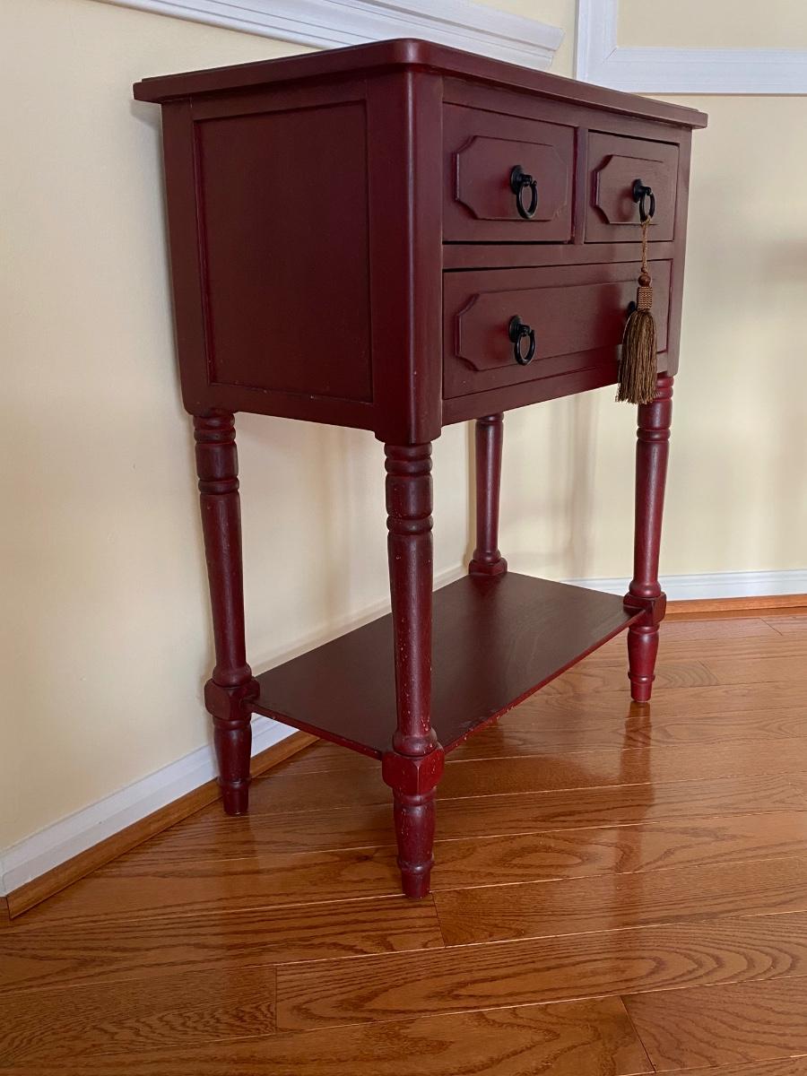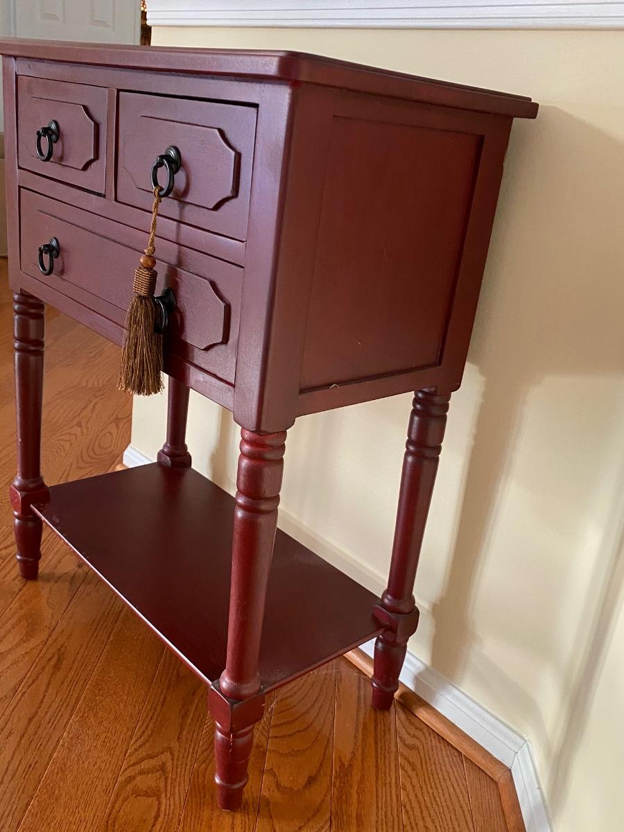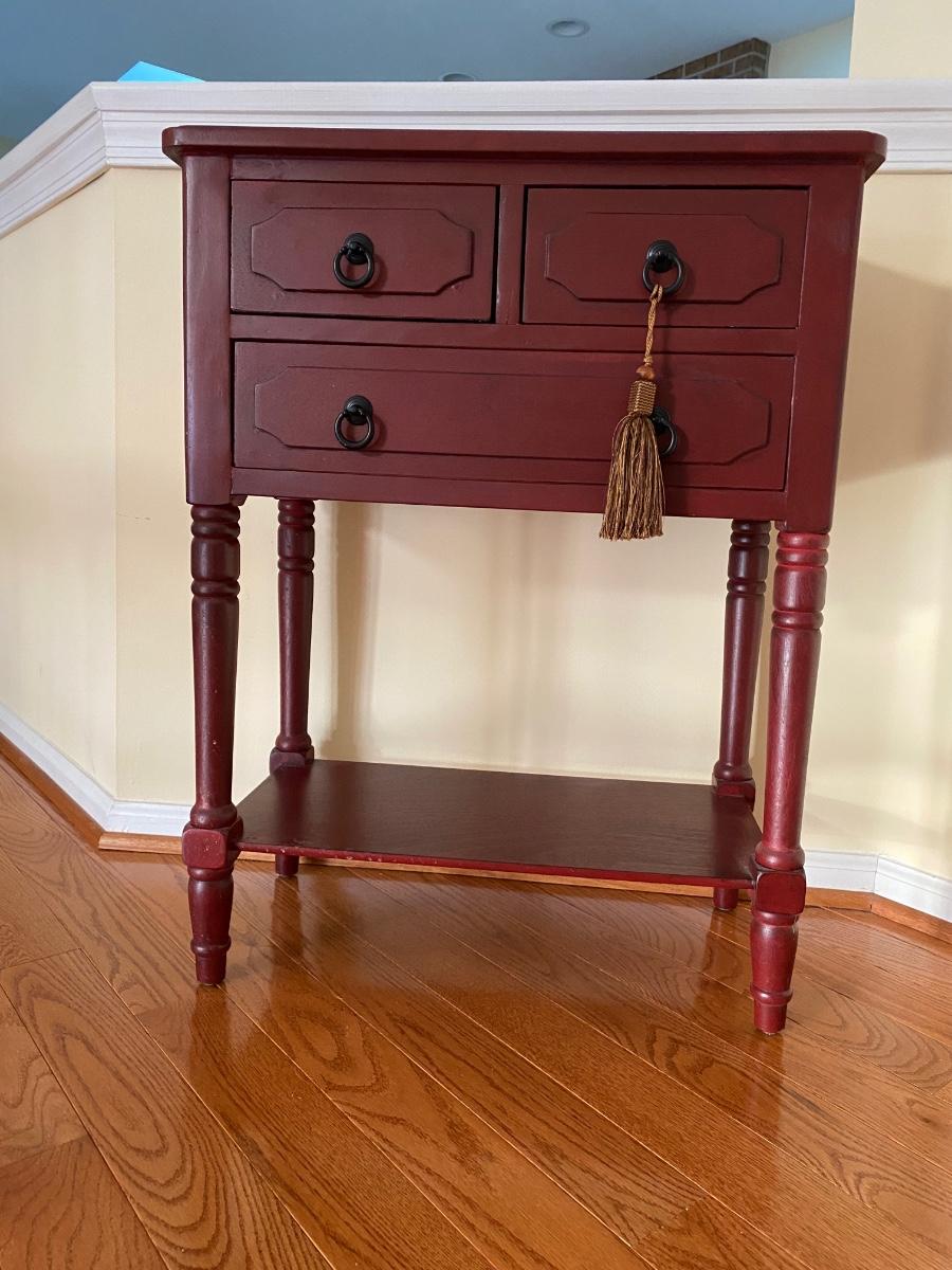 Adorable accent table. Three drawers and lower shelf. Please see all pictures as they are the best representation of the items. The pictures show condition, measurements if taken, and what is included in the lot. Due to the large amount that we photograph and the time frame, we are not always able to take measurements. All items unless noted, are pre-owned and have been used. If you purchased furniture, you must bring help. We do not allow one person to carry large furniture out on their own. Bring help, tools and a truck for the safety of our client’s homes, and your personal safety. Any damages that result to the property including walls, and floors due to moving of the furniture will be charged to the buyer. Company policy. Thank you.