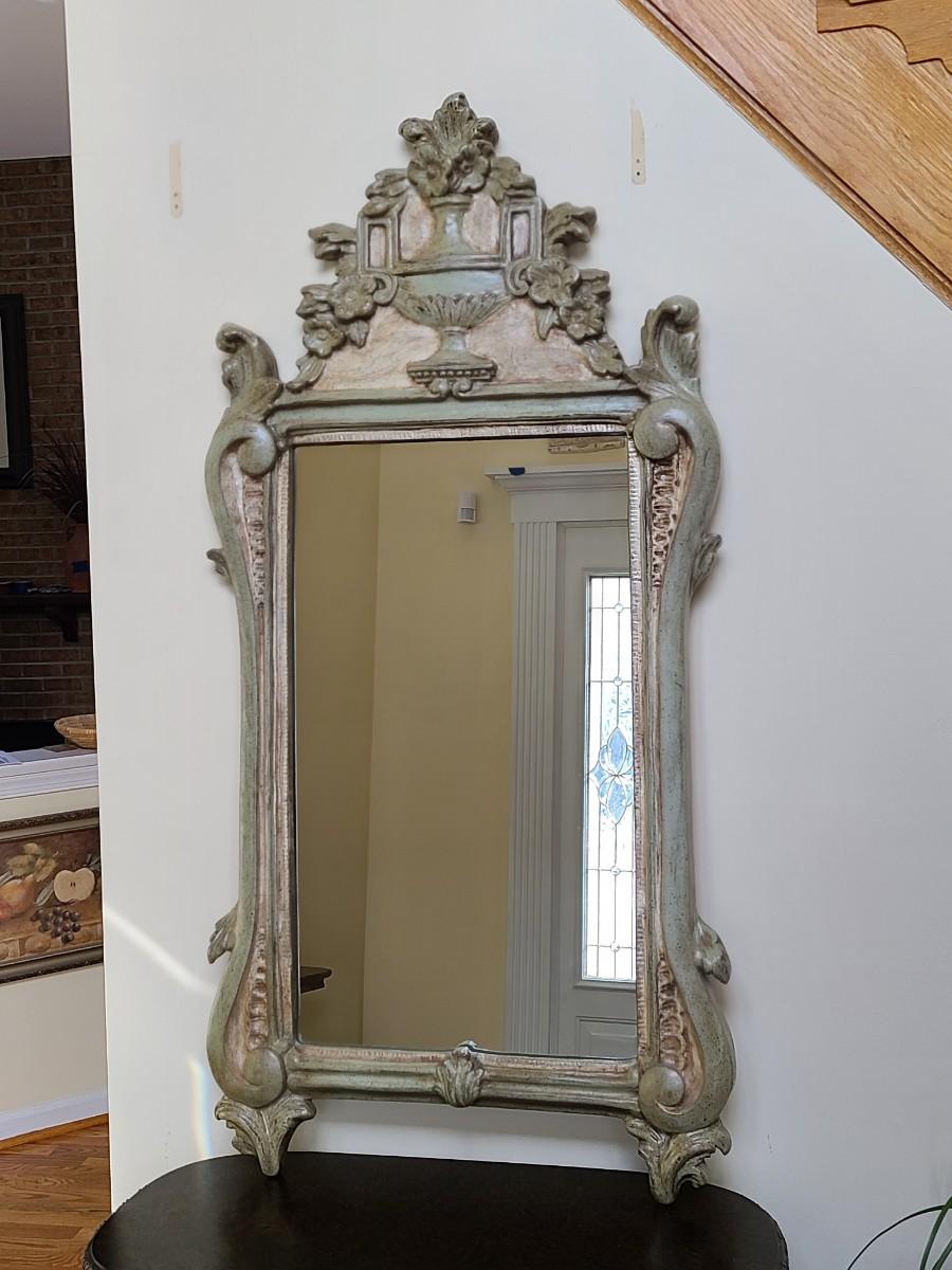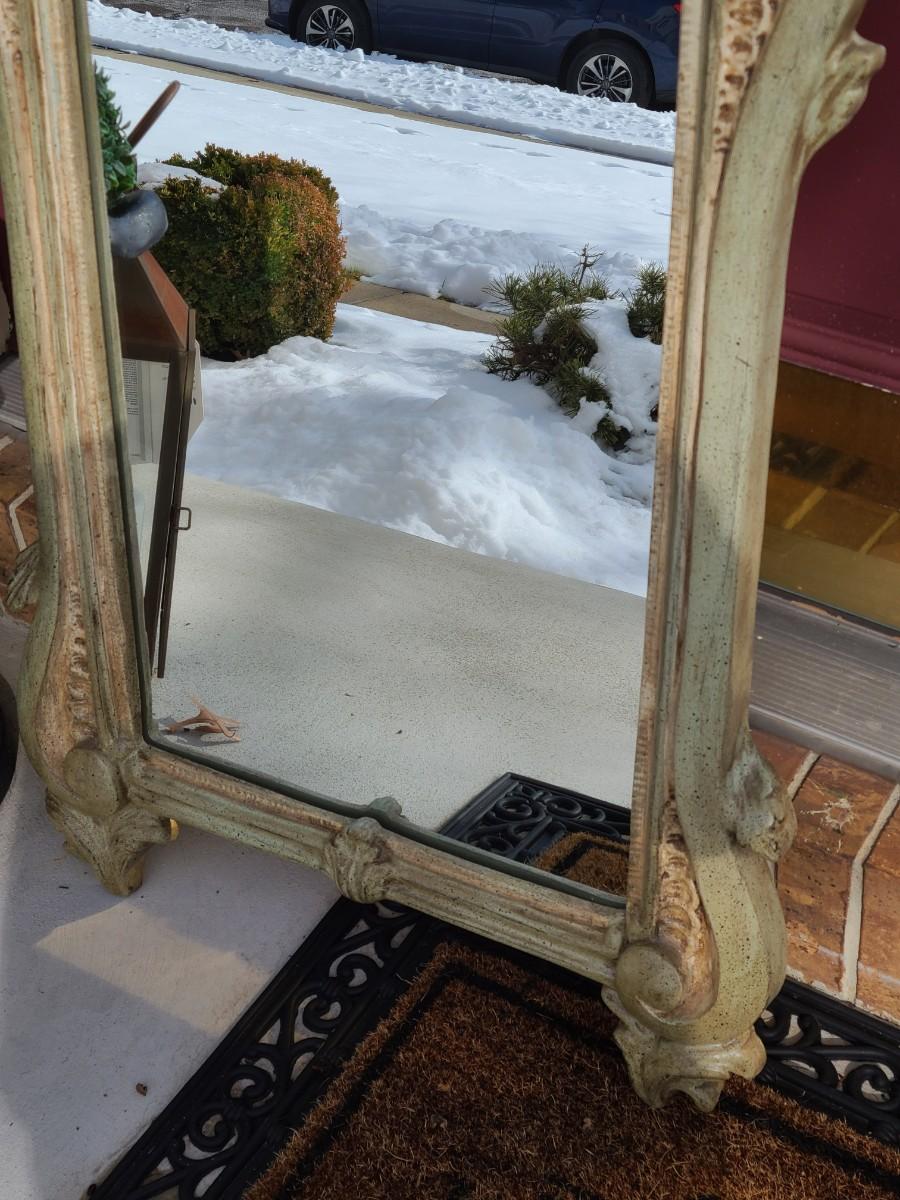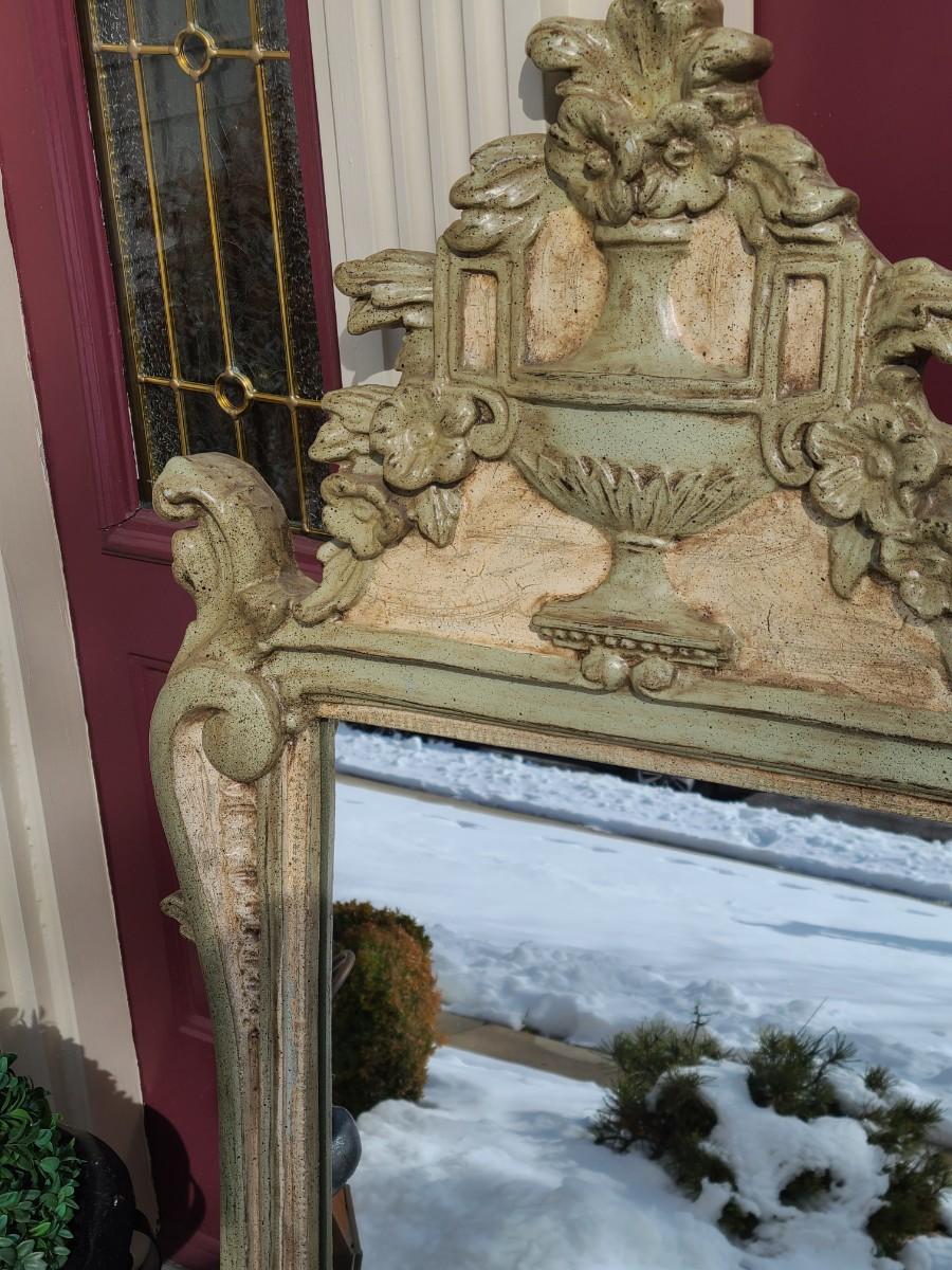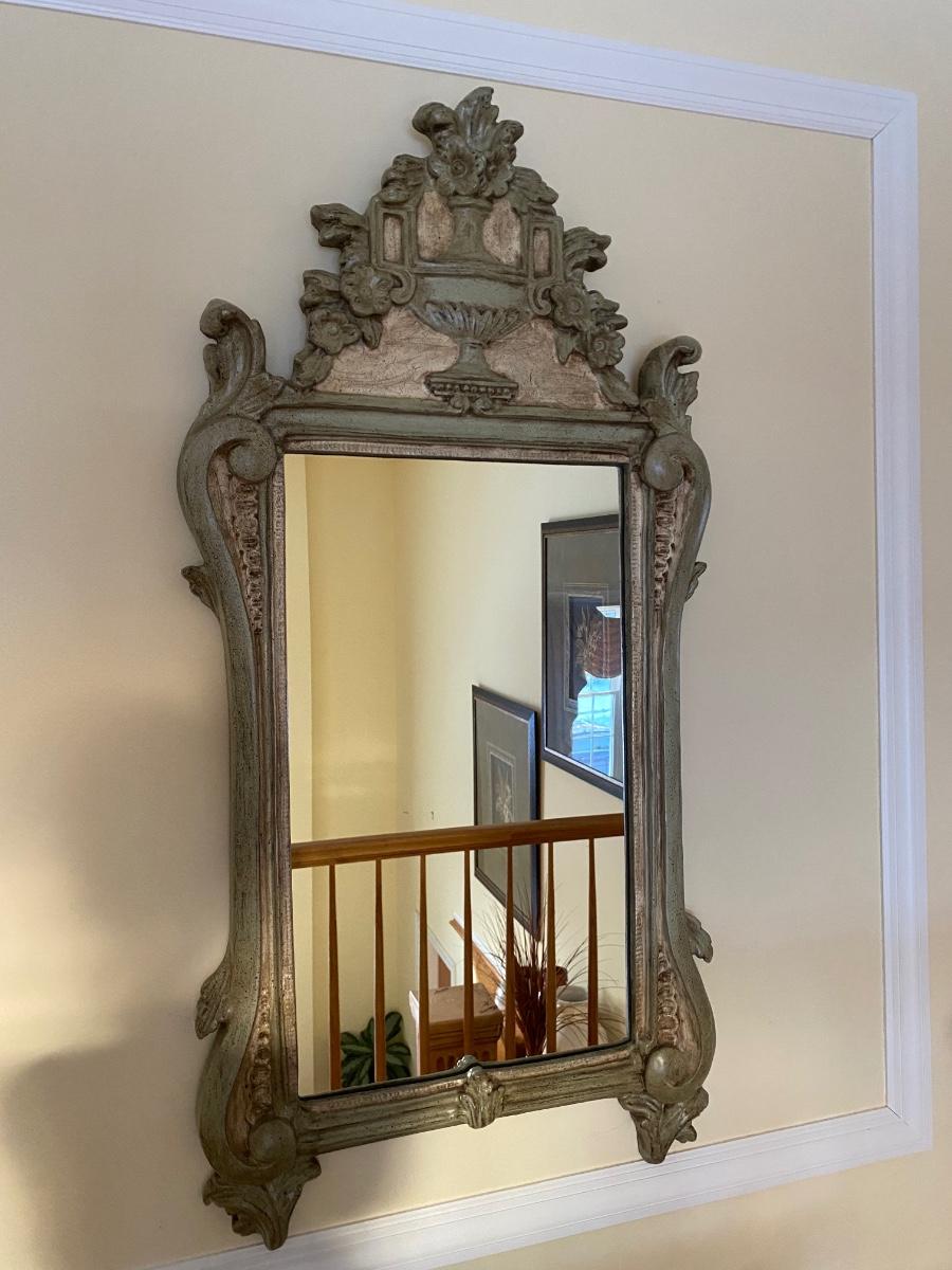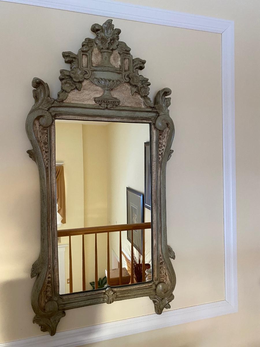 Mirror looks like wood but is a lightweight mixed composite material. Beautiful green color. It was hard to capture the color of this beauty, so it is pictured in natural light and home light. This is medium in weight. Please see all pictures as they are the best representation of the items. The pictures show condition, measurements if taken, and what is included in the lot. Due to the large amount that we photograph and the time frame, we are not always able to take measurements. All items unless noted, are pre-owned and have been used. If you purchased furniture, you must bring help. We do not allow one person to carry large furniture out on their own. Bring help, tools and a truck for the safety of our client’s homes, and your personal safety. Any damages that result to the property including walls, and floors due to moving of the furniture will be charged to the buyer. Company policy. Thank you.