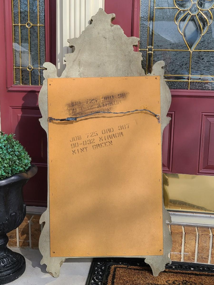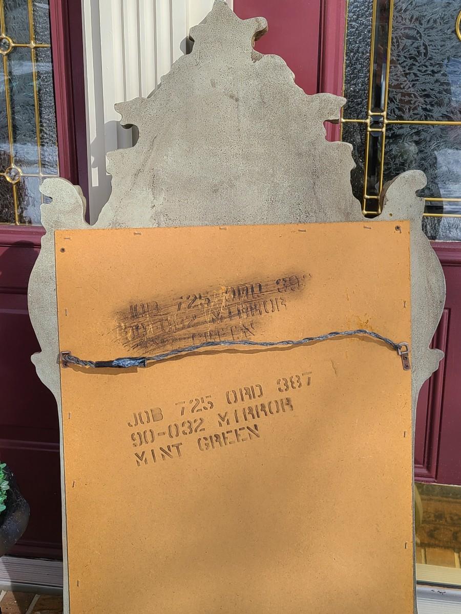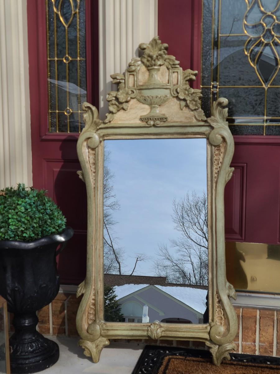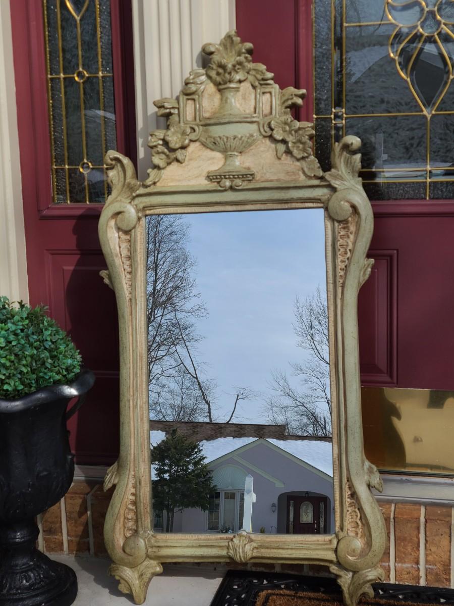 Mirror looks like wood but is a lightweight mixed composite material. Beautiful green color. It was hard to capture the color of this beauty, so it is pictured in natural light and home light. This is medium in weight. Please see all pictures as they are the best representation of the items. The pictures show condition, measurements if taken, and what is included in the lot. Due to the large amount that we photograph and the time frame, we are not always able to take measurements. All items unless noted, are pre-owned and have been used. If you purchased furniture, you must bring help. We do not allow one person to carry large furniture out on their own. Bring help, tools and a truck for the safety of our client’s homes, and your personal safety. Any damages that result to the property including walls, and floors due to moving of the furniture will be charged to the buyer. Company policy. Thank you.