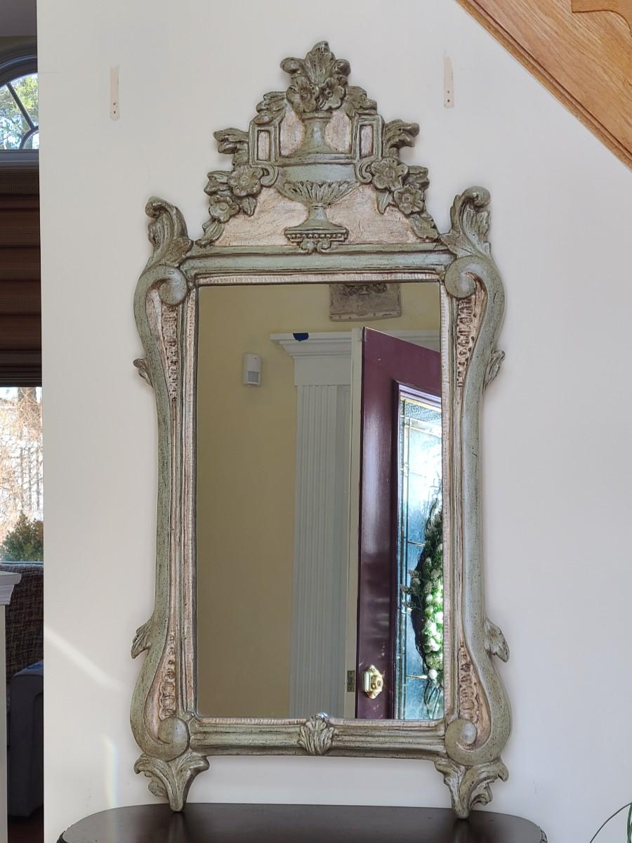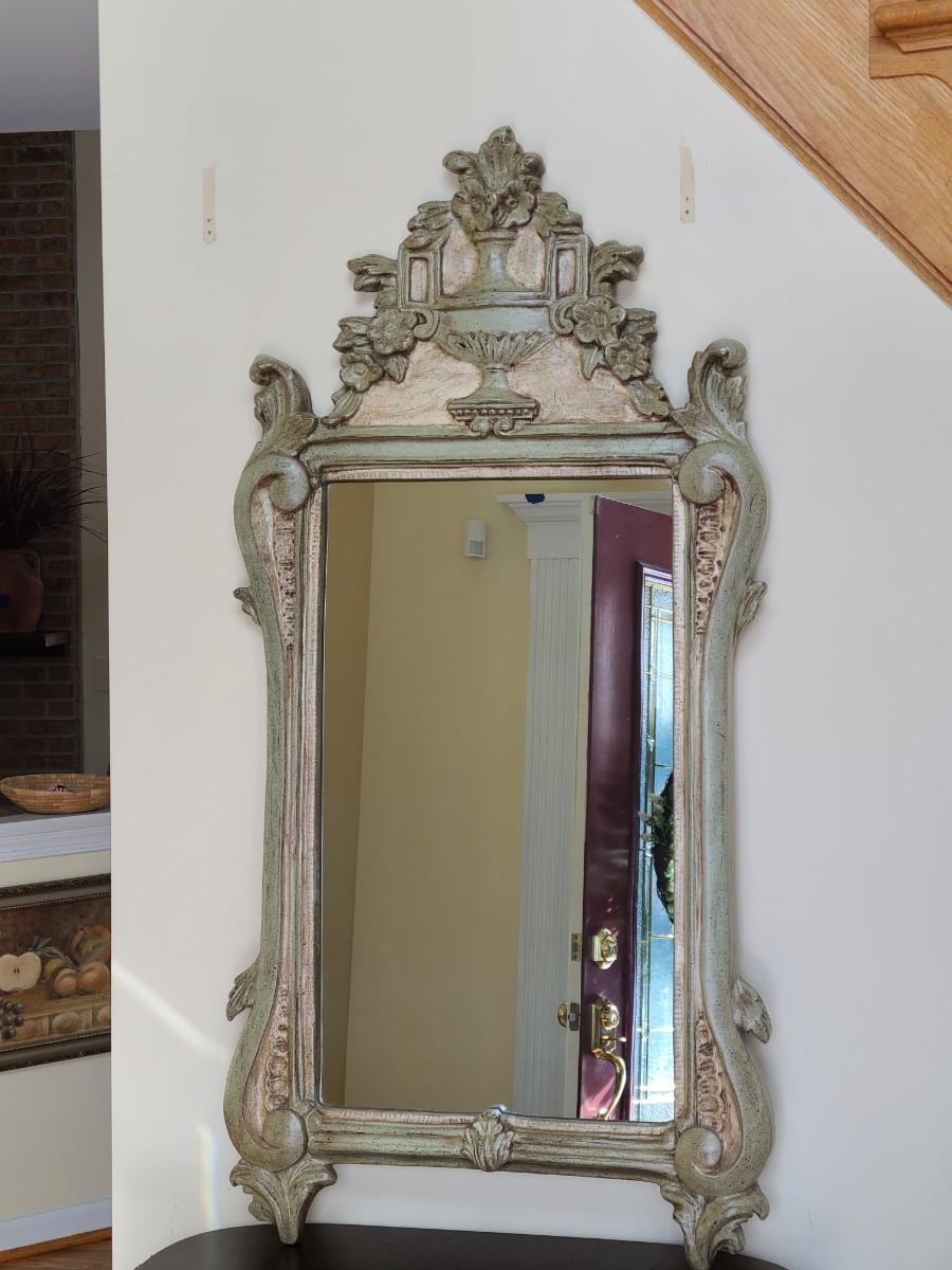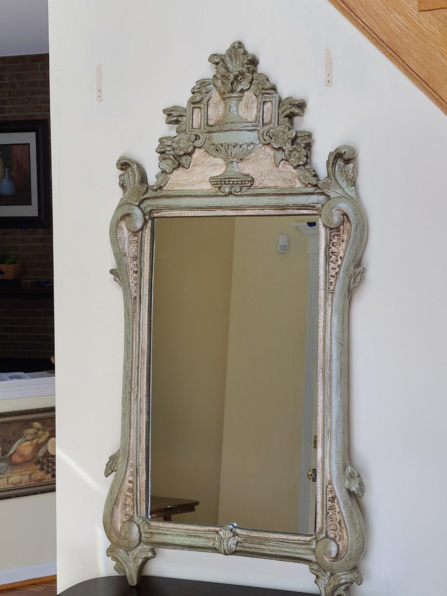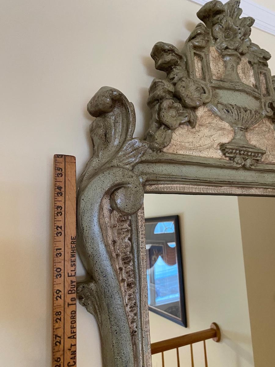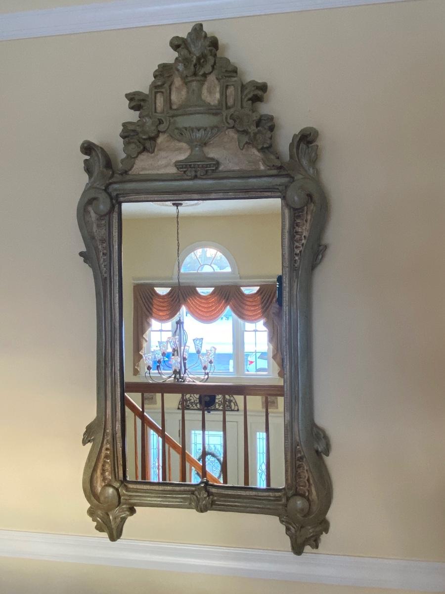 Mirror looks like wood but is a lightweight mixed composite material. Beautiful green color. It was hard to capture the color of this beauty, so it is pictured in natural light and home light. This is medium in weight. Please see all pictures as they are the best representation of the items. The pictures show condition, measurements if taken, and what is included in the lot. Due to the large amount that we photograph and the time frame, we are not always able to take measurements. All items unless noted, are pre-owned and have been used. If you purchased furniture, you must bring help. We do not allow one person to carry large furniture out on their own. Bring help, tools and a truck for the safety of our client’s homes, and your personal safety. Any damages that result to the property including walls, and floors due to moving of the furniture will be charged to the buyer. Company policy. Thank you.