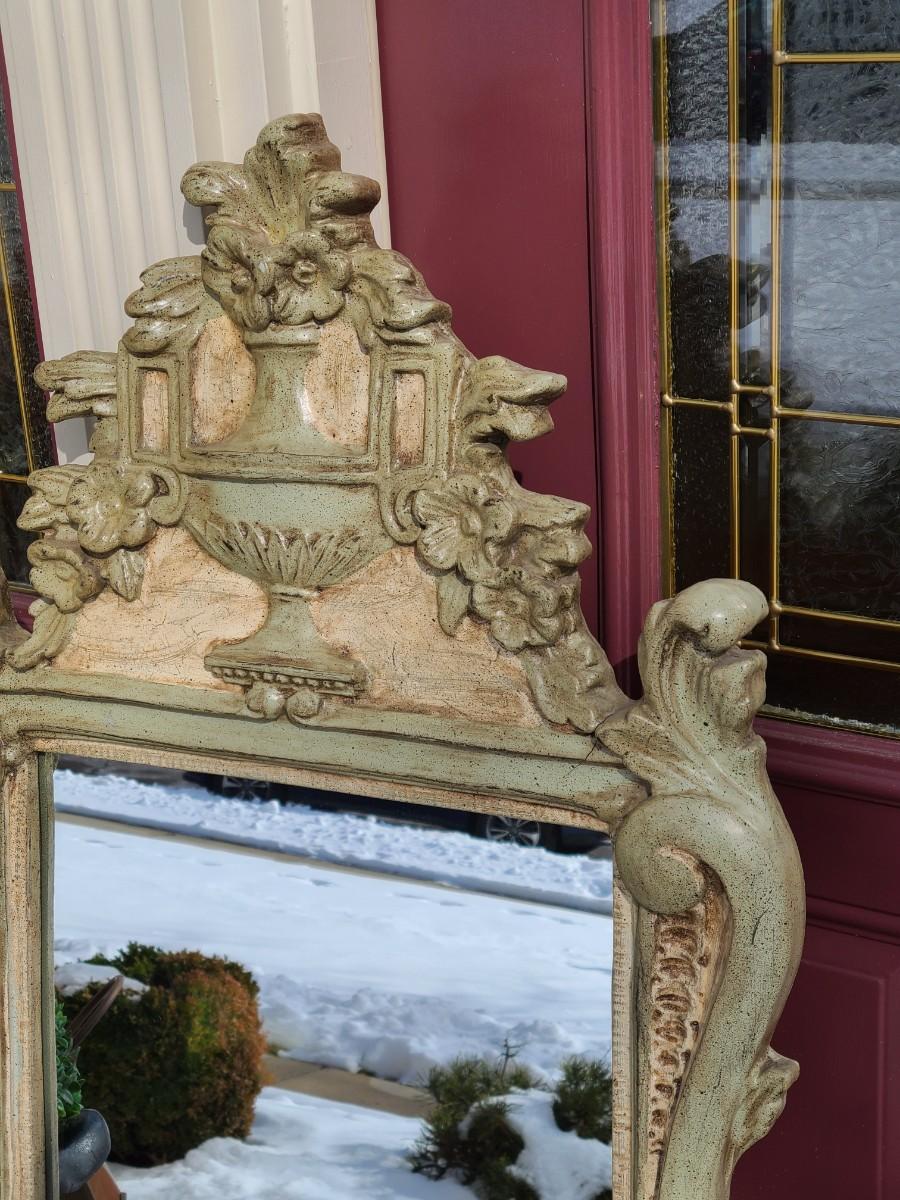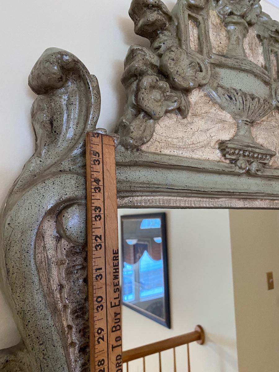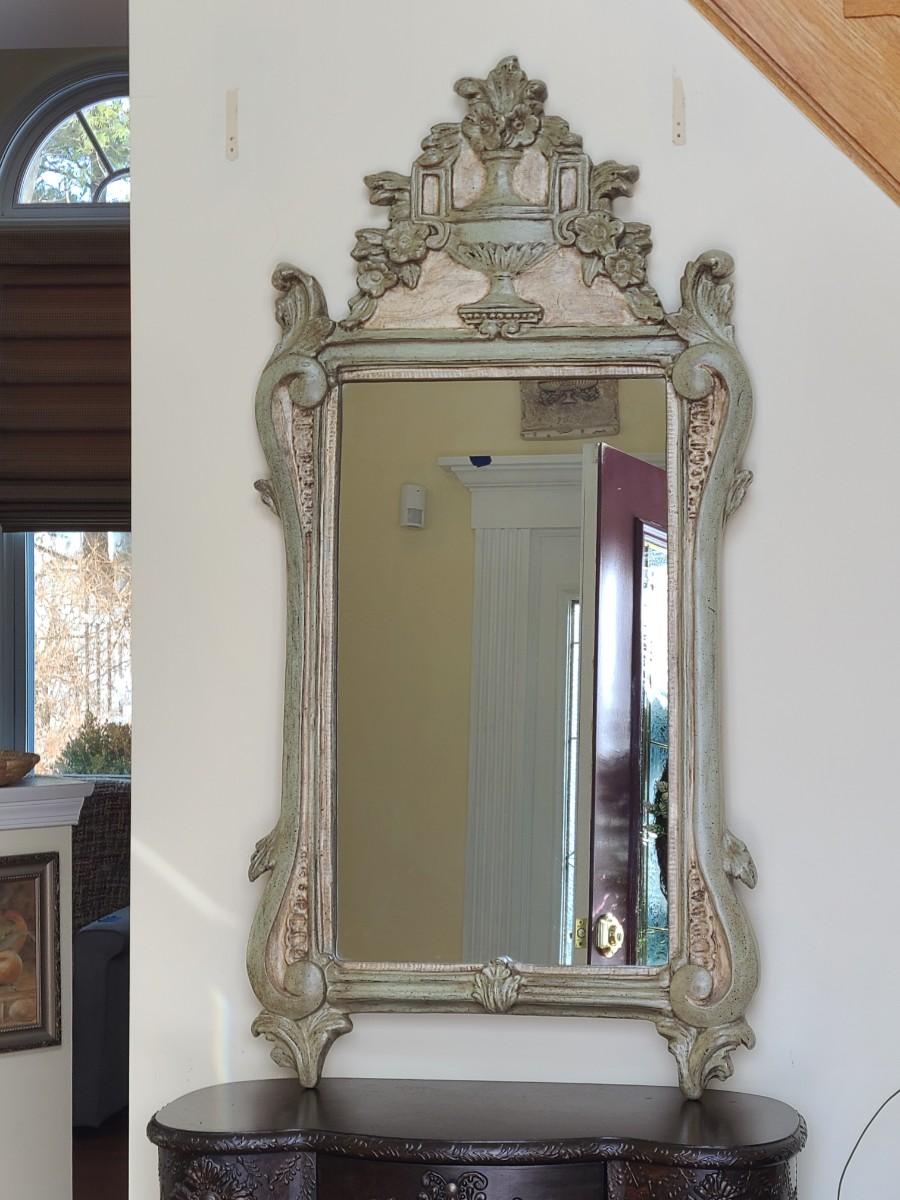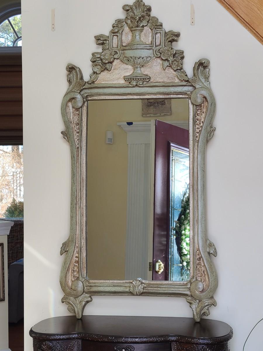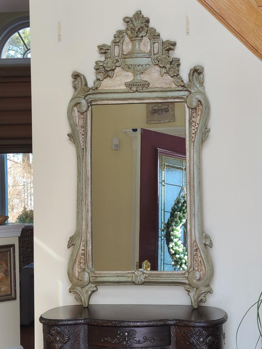 Mirror looks like wood but is a lightweight mixed composite material. Beautiful green color. It was hard to capture the color of this beauty, so it is pictured in natural light and home light. This is medium in weight. Please see all pictures as they are the best representation of the items. The pictures show condition, measurements if taken, and what is included in the lot. Due to the large amount that we photograph and the time frame, we are not always able to take measurements. All items unless noted, are pre-owned and have been used. If you purchased furniture, you must bring help. We do not allow one person to carry large furniture out on their own. Bring help, tools and a truck for the safety of our client’s homes, and your personal safety. Any damages that result to the property including walls, and floors due to moving of the furniture will be charged to the buyer. Company policy. Thank you.