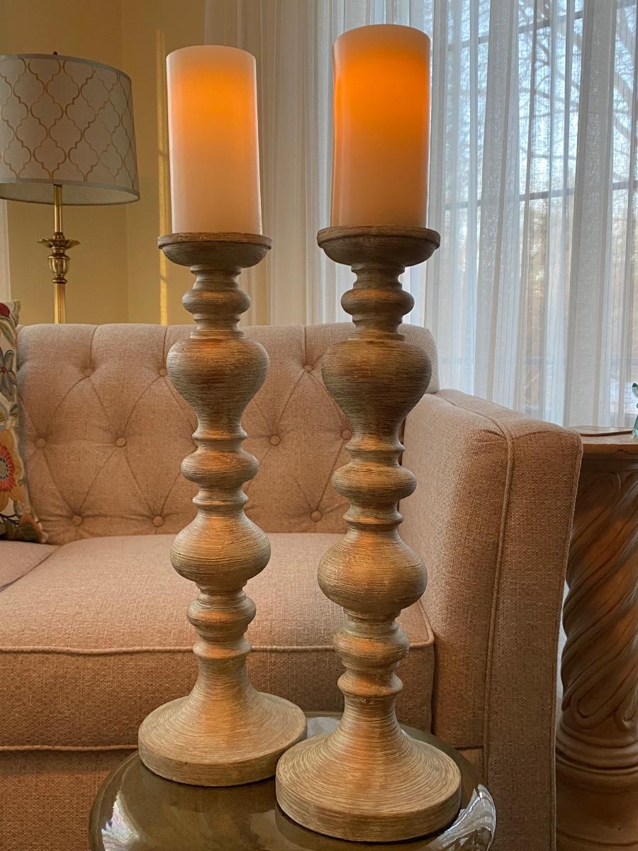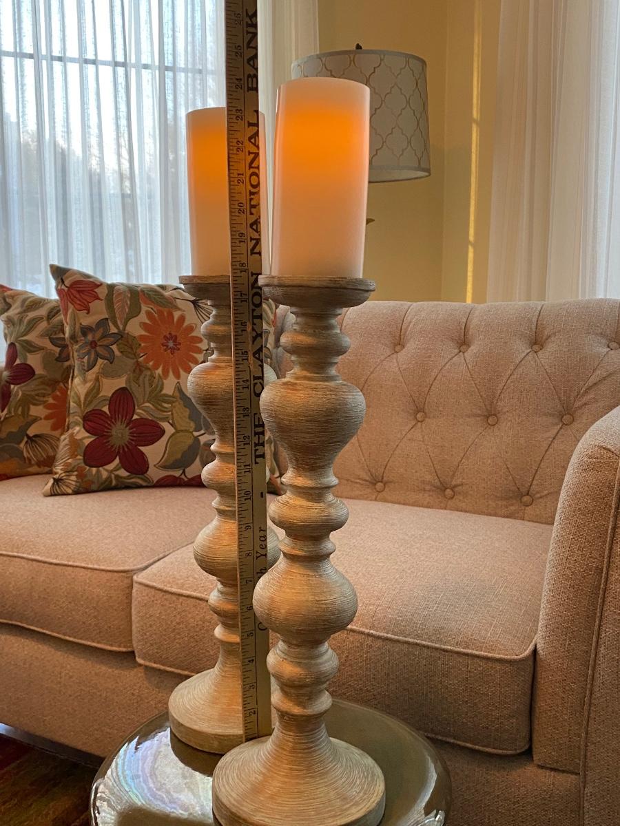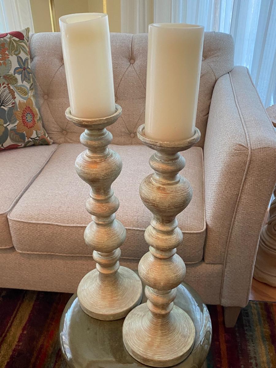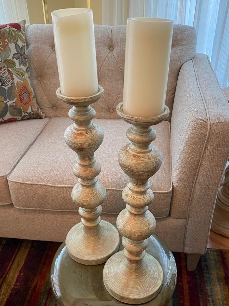 Pair of tall candlesticks and battery operated candles. Please see all pictures as they are the best representation of the items. The pictures show condition, measurements if taken, and what is included in the lot. Due to the large amount that we photograph and the time frame, we are not always able to take measurements. All items unless noted, are pre-owned and have been used. If you purchased furniture, you must bring help. We do not allow one person to carry large furniture out on their own. Bring help, tools and a truck for the safety of our client’s homes, and your personal safety. Any damages that result to the property including walls, and floors due to moving of the furniture will be charged to the buyer. Company policy. Thank you.