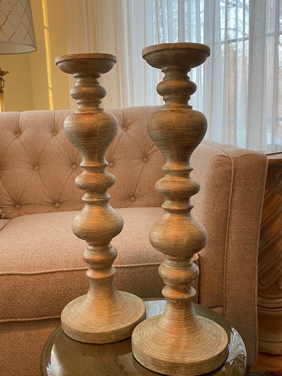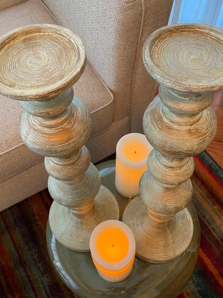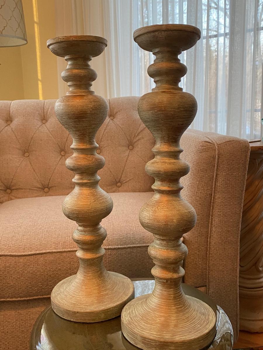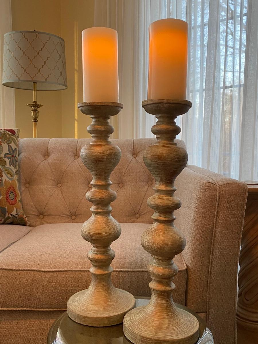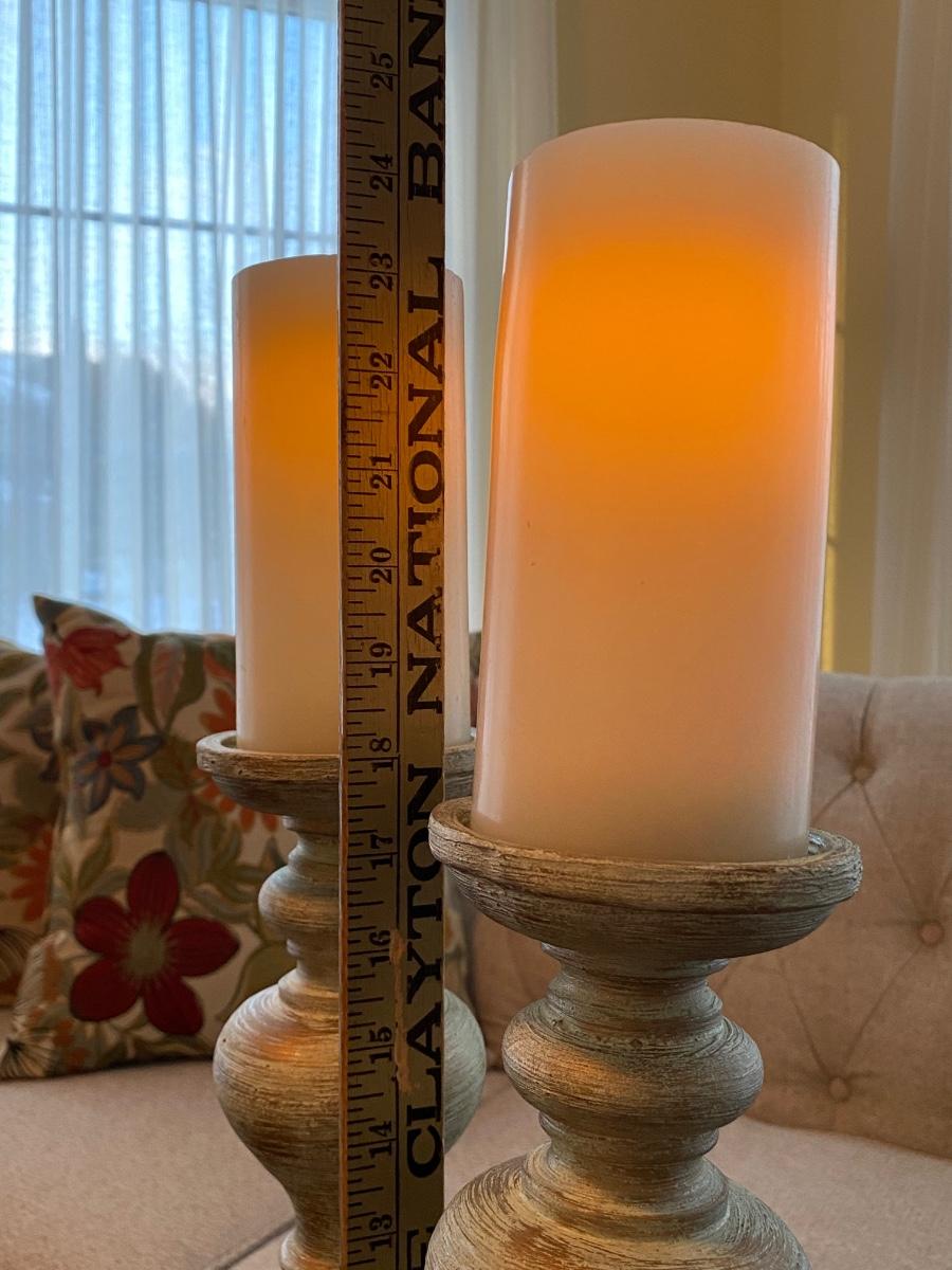 Pair of tall candlesticks and battery operated candles. Please see all pictures as they are the best representation of the items. The pictures show condition, measurements if taken, and what is included in the lot. Due to the large amount that we photograph and the time frame, we are not always able to take measurements. All items unless noted, are pre-owned and have been used. If you purchased furniture, you must bring help. We do not allow one person to carry large furniture out on their own. Bring help, tools and a truck for the safety of our client’s homes, and your personal safety. Any damages that result to the property including walls, and floors due to moving of the furniture will be charged to the buyer. Company policy. Thank you.