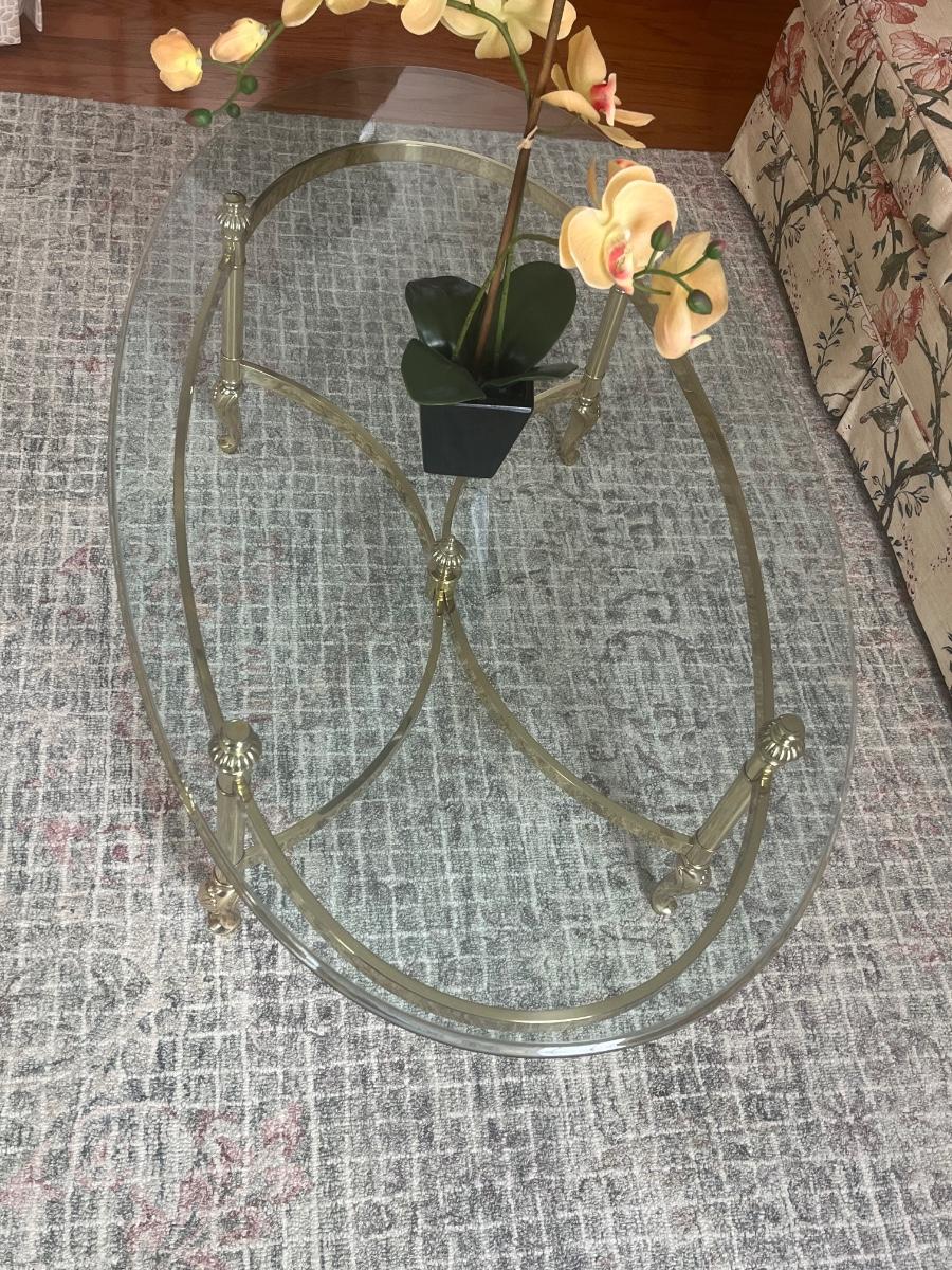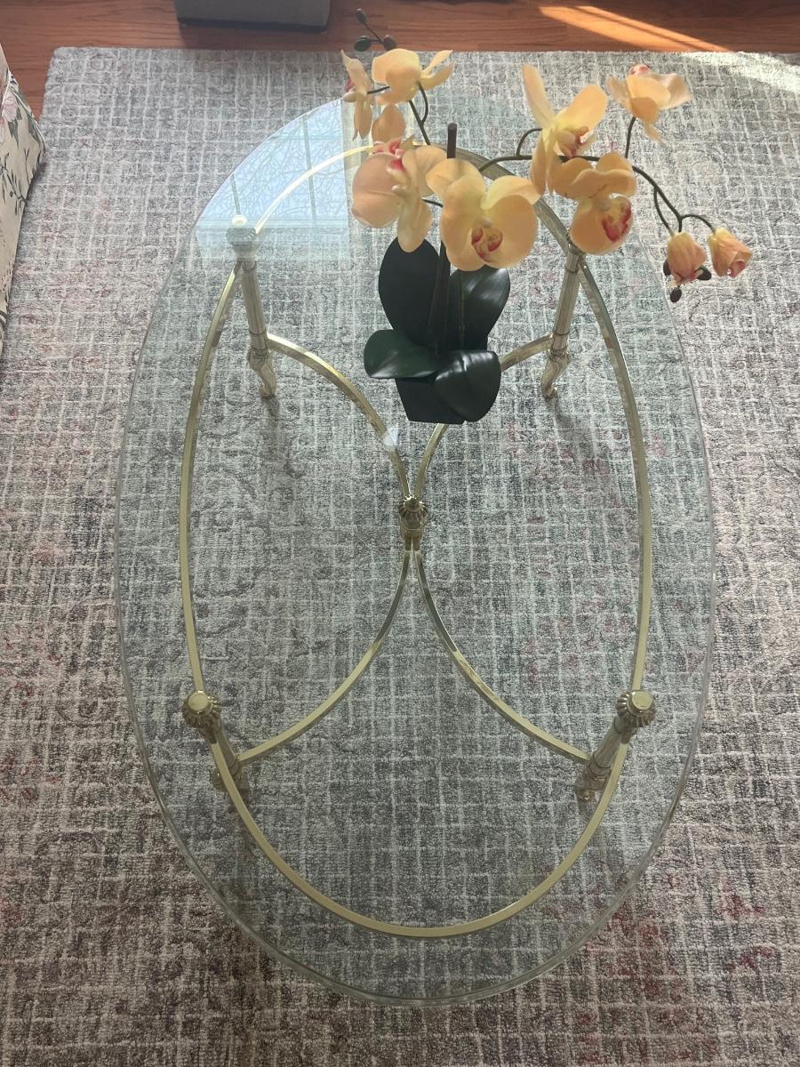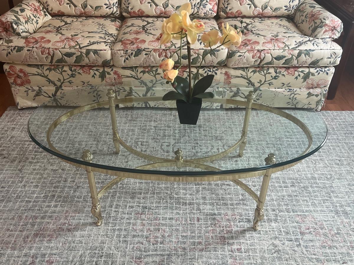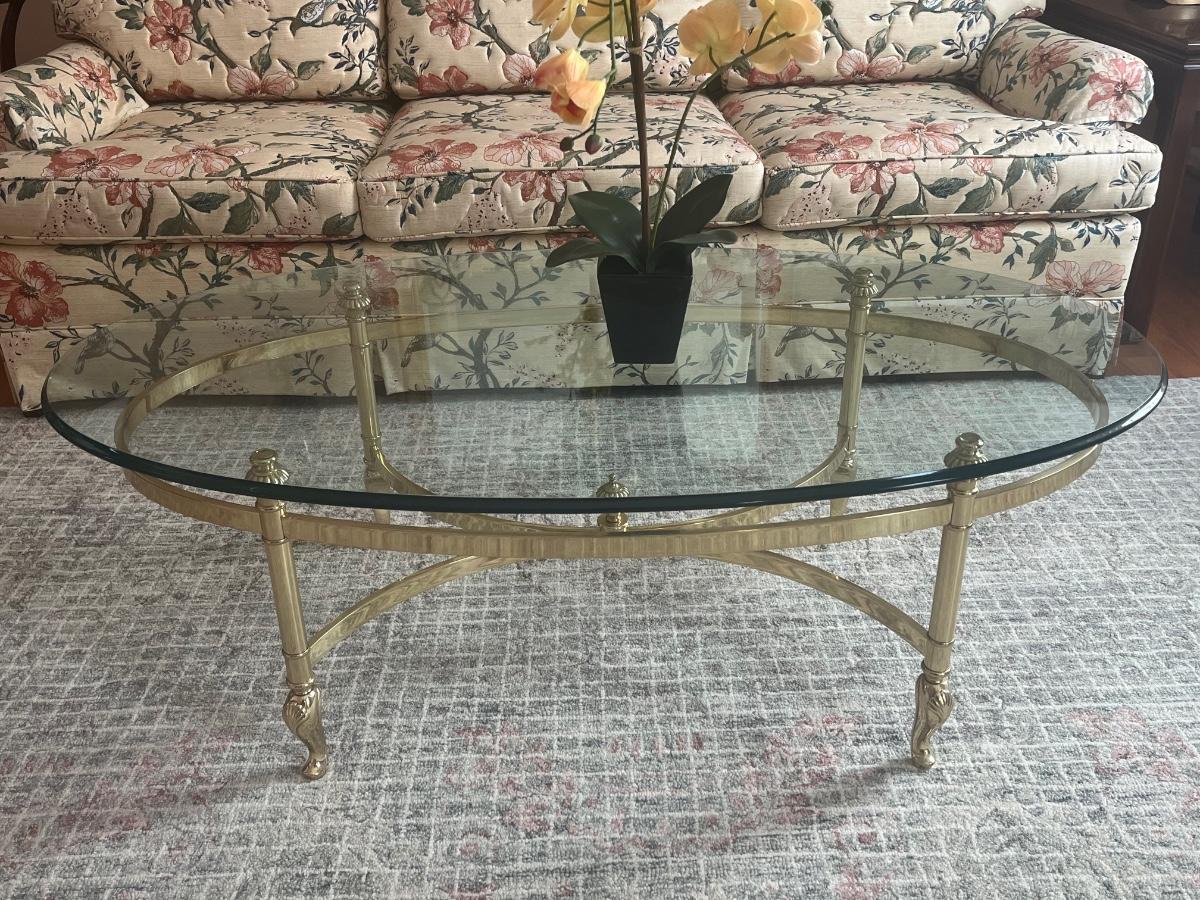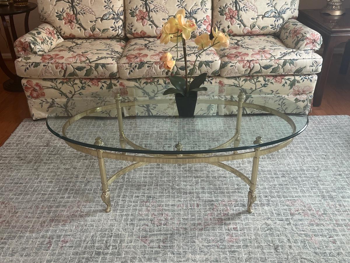 Lot 157: Beautiful Glass and Gold Oval Coffee Table
