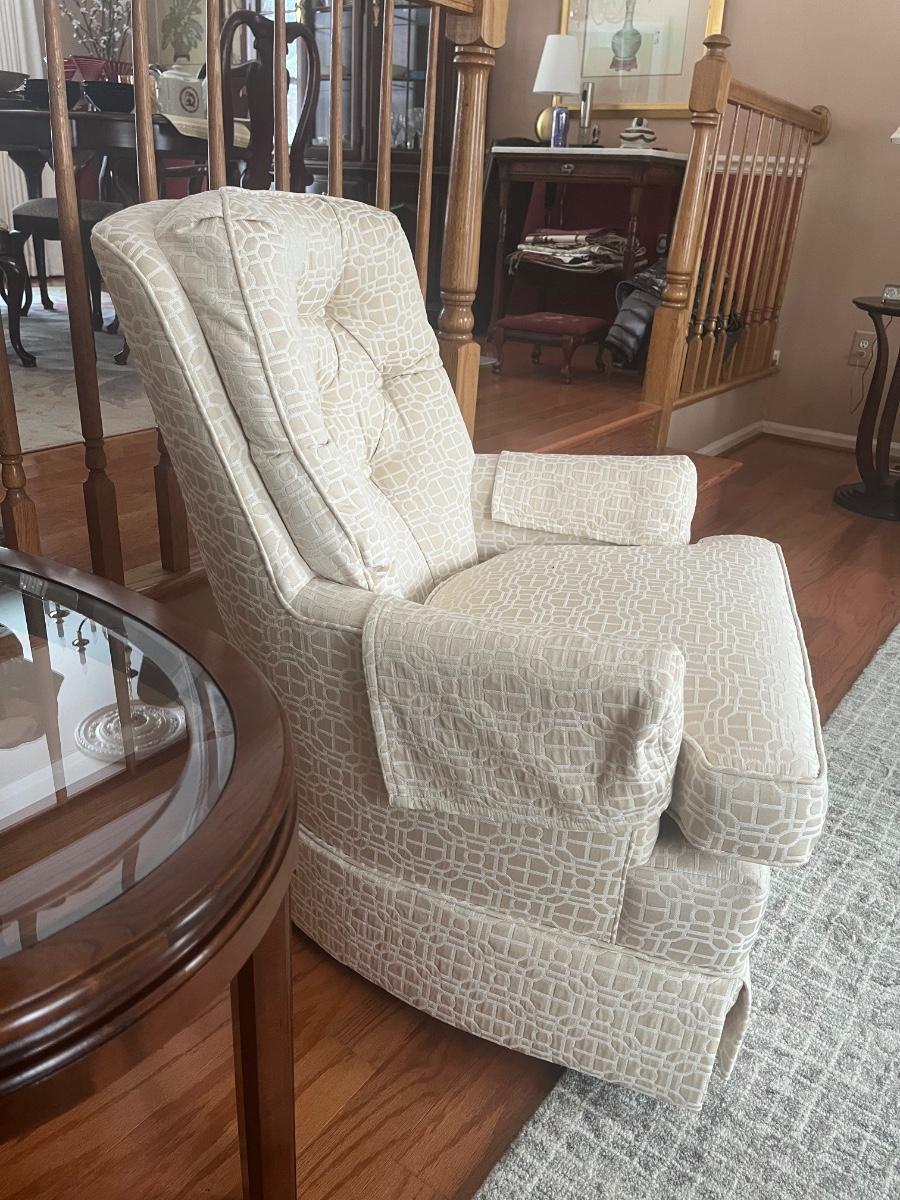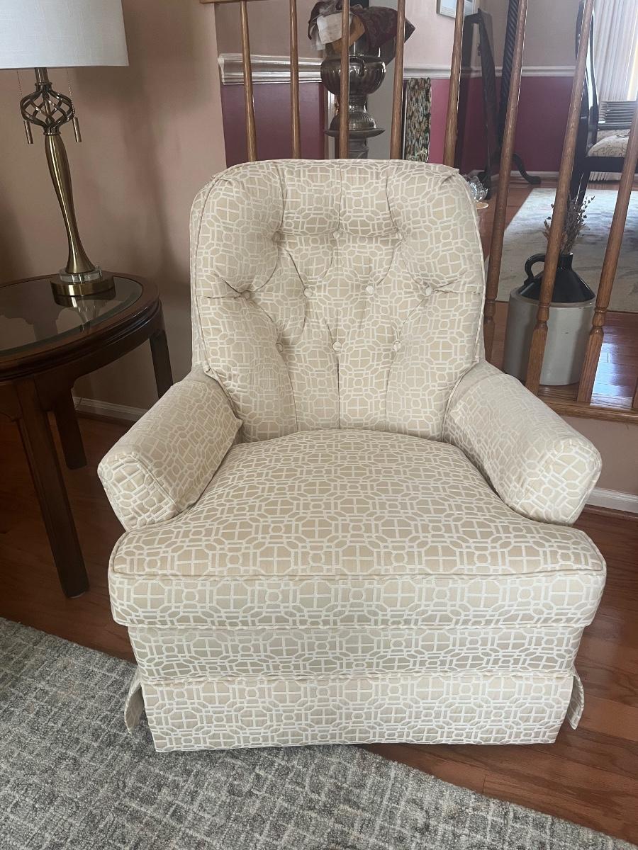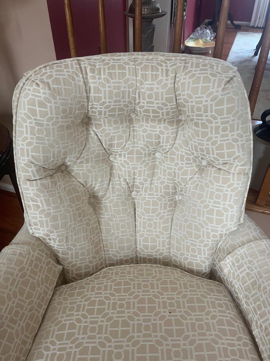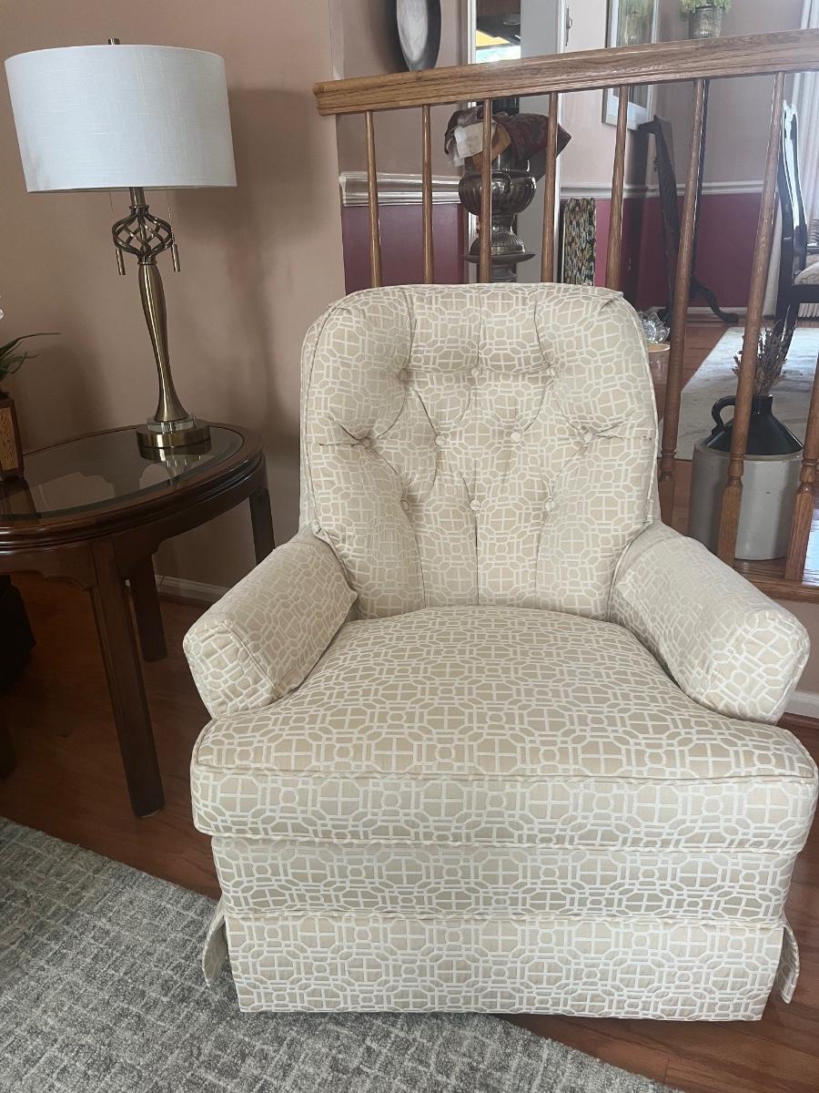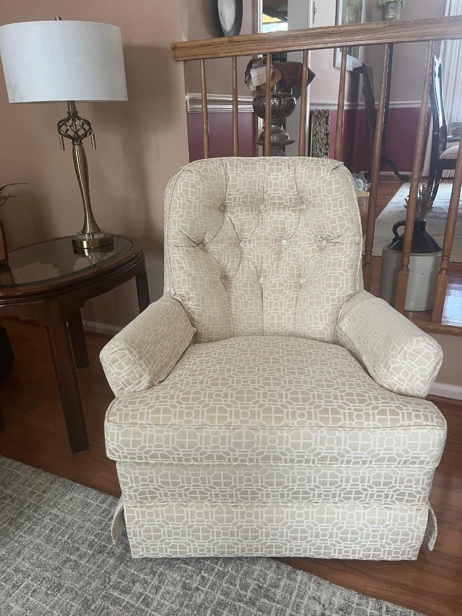 31x27x34 inches tall. Comfortable modern home accent chair! Perfect in any room in the home! Please see all pictures as they are the best representation of the items. The pictures show condition, measurements if taken, and what is included in the lot. Due to the large amount that we photograph and the time frame, we are not always able to take measurements. All items unless noted, are pre-owned and have been used. If you purchased furniture, you must bring help. We do not allow one person to carry large furniture out on their own. Bring help, tools and a truck for the safety of our client’s homes, and your personal safety. Any damages that result to the property including walls, and floors due to moving of the furniture will be charged to the buyer. Company policy. Thank you.