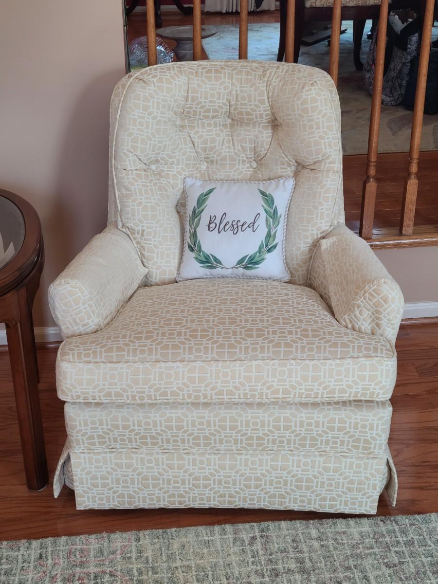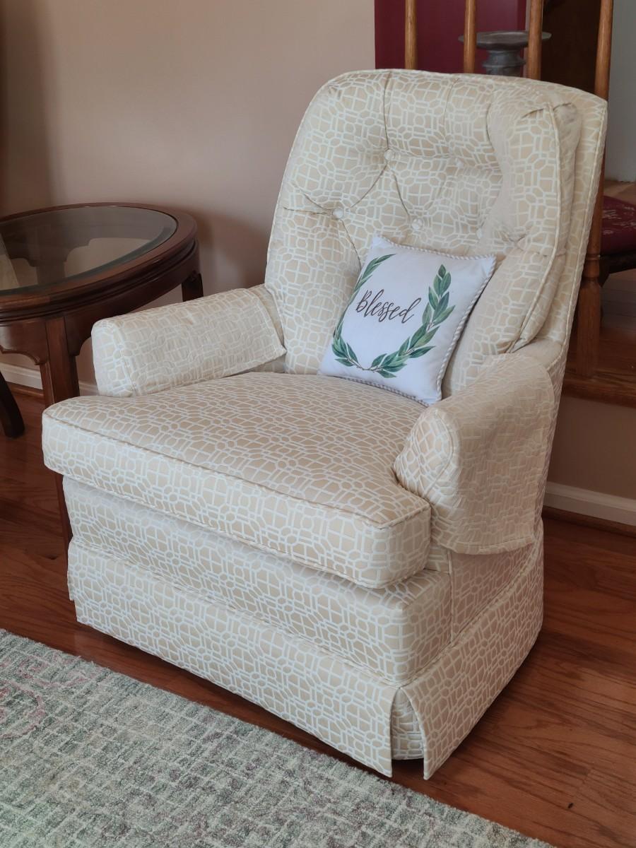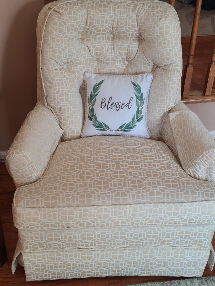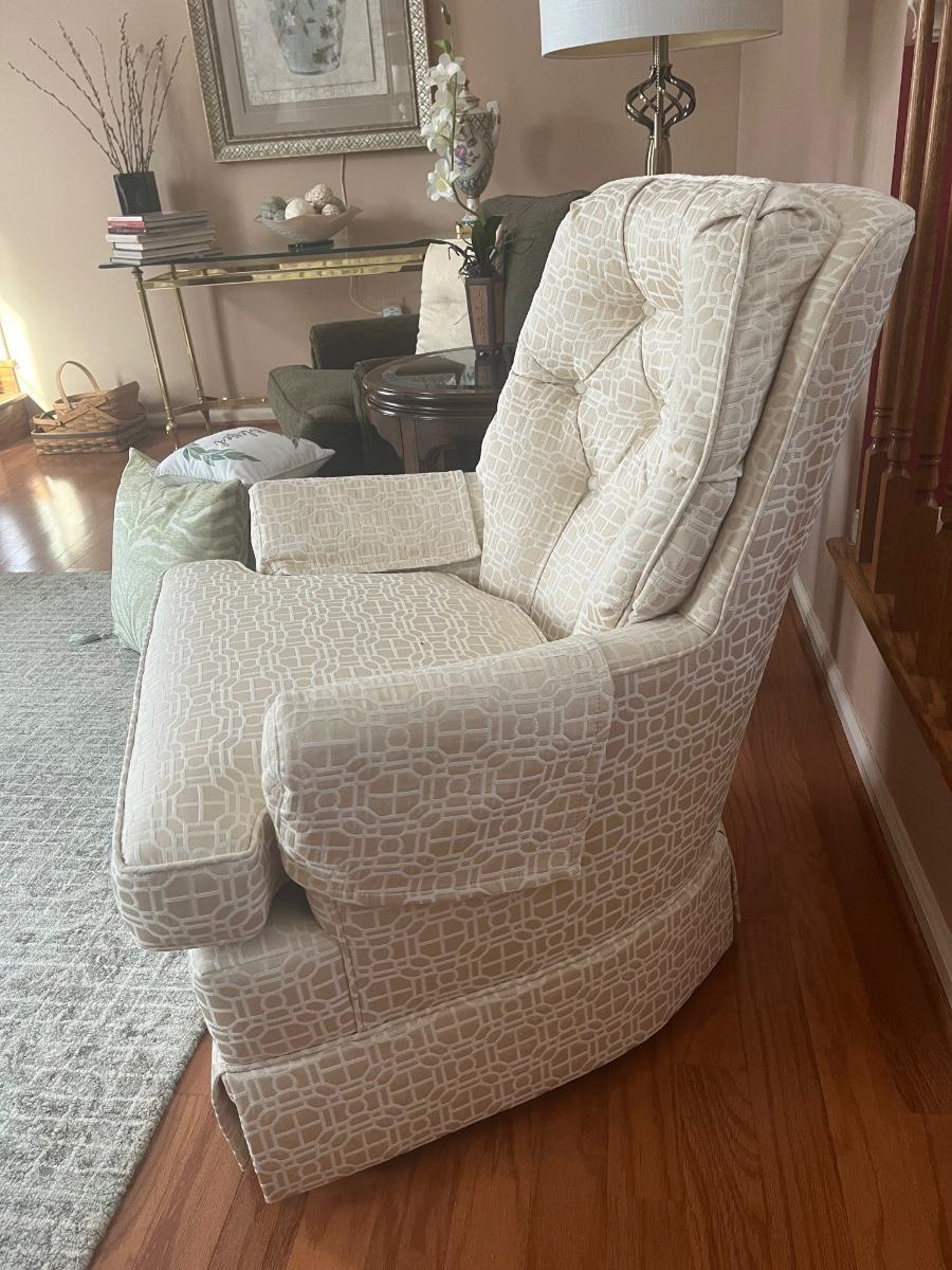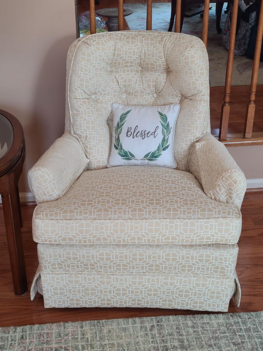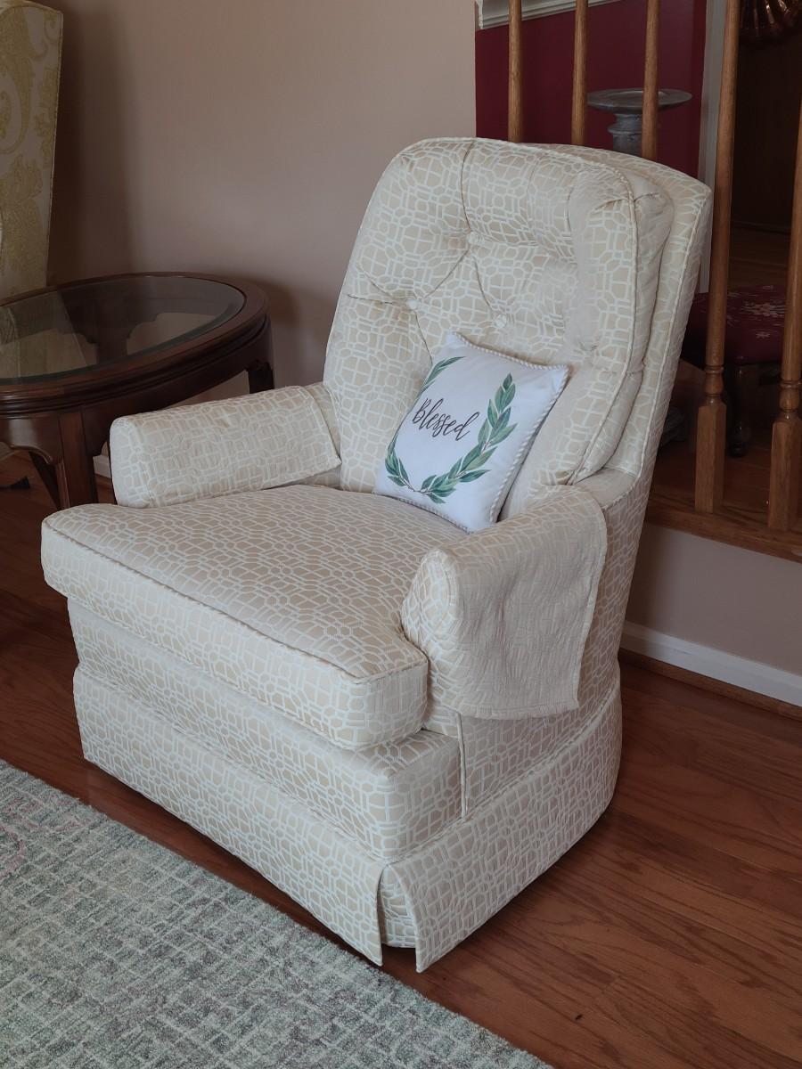 31x27x34 inches tall. Comfortable modern home accent chair! Perfect in any room in the home! Please see all pictures as they are the best representation of the items. The pictures show condition, measurements if taken, and what is included in the lot. Due to the large amount that we photograph and the time frame, we are not always able to take measurements. All items unless noted, are pre-owned and have been used. If you purchased furniture, you must bring help. We do not allow one person to carry large furniture out on their own. Bring help, tools and a truck for the safety of our client’s homes, and your personal safety. Any damages that result to the property including walls, and floors due to moving of the furniture will be charged to the buyer. Company policy. Thank you.