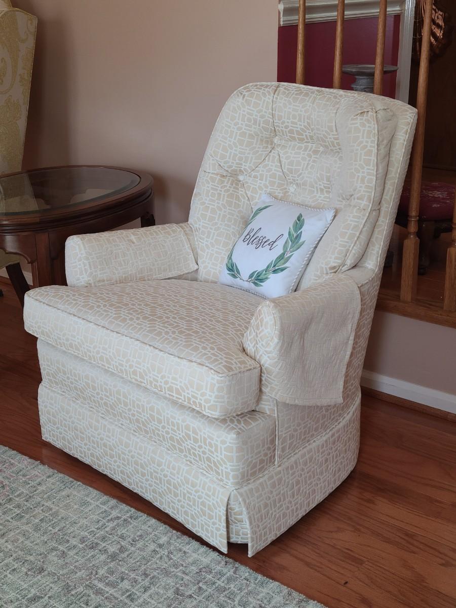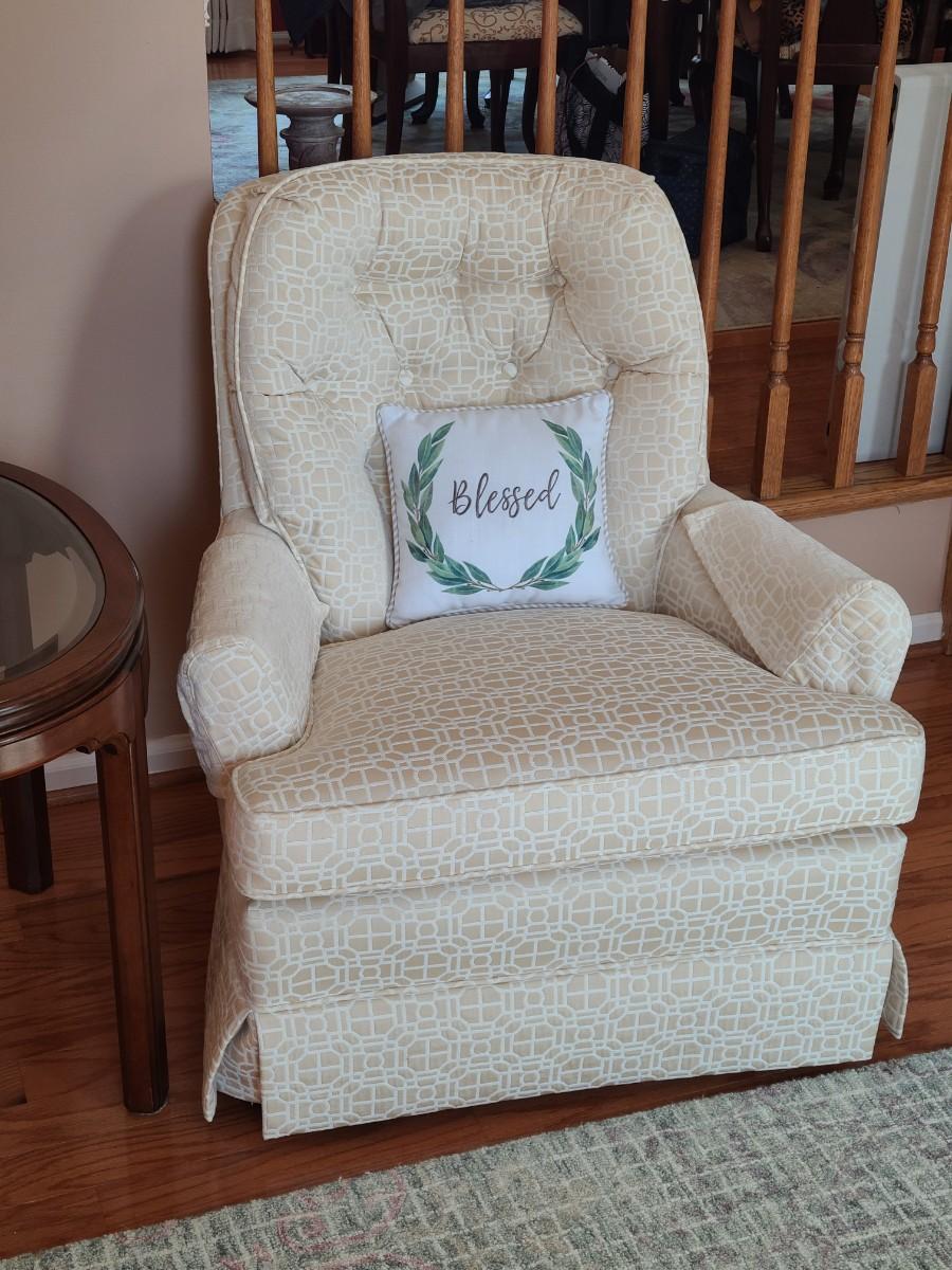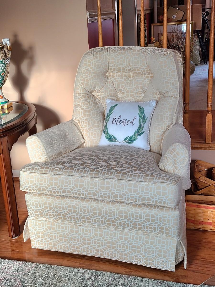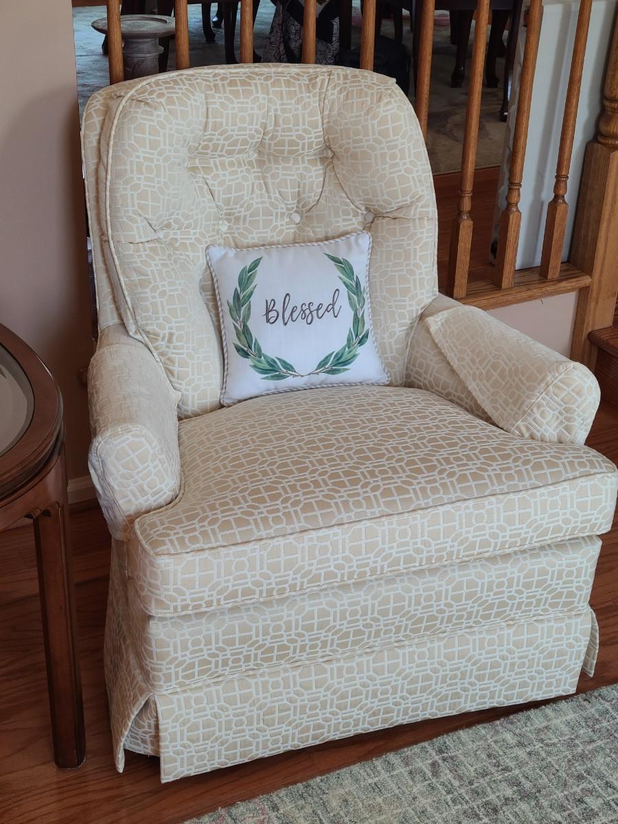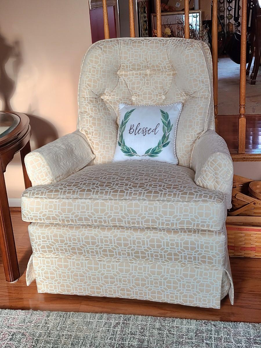 31x27x34 inches tall. Comfortable modern home accent chair! Perfect in any room in the home! Please see all pictures as they are the best representation of the items. The pictures show condition, measurements if taken, and what is included in the lot. Due to the large amount that we photograph and the time frame, we are not always able to take measurements. All items unless noted, are pre-owned and have been used. If you purchased furniture, you must bring help. We do not allow one person to carry large furniture out on their own. Bring help, tools and a truck for the safety of our client’s homes, and your personal safety. Any damages that result to the property including walls, and floors due to moving of the furniture will be charged to the buyer. Company policy. Thank you.