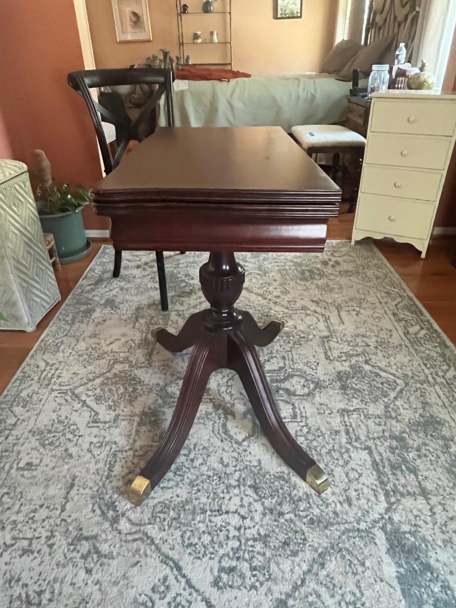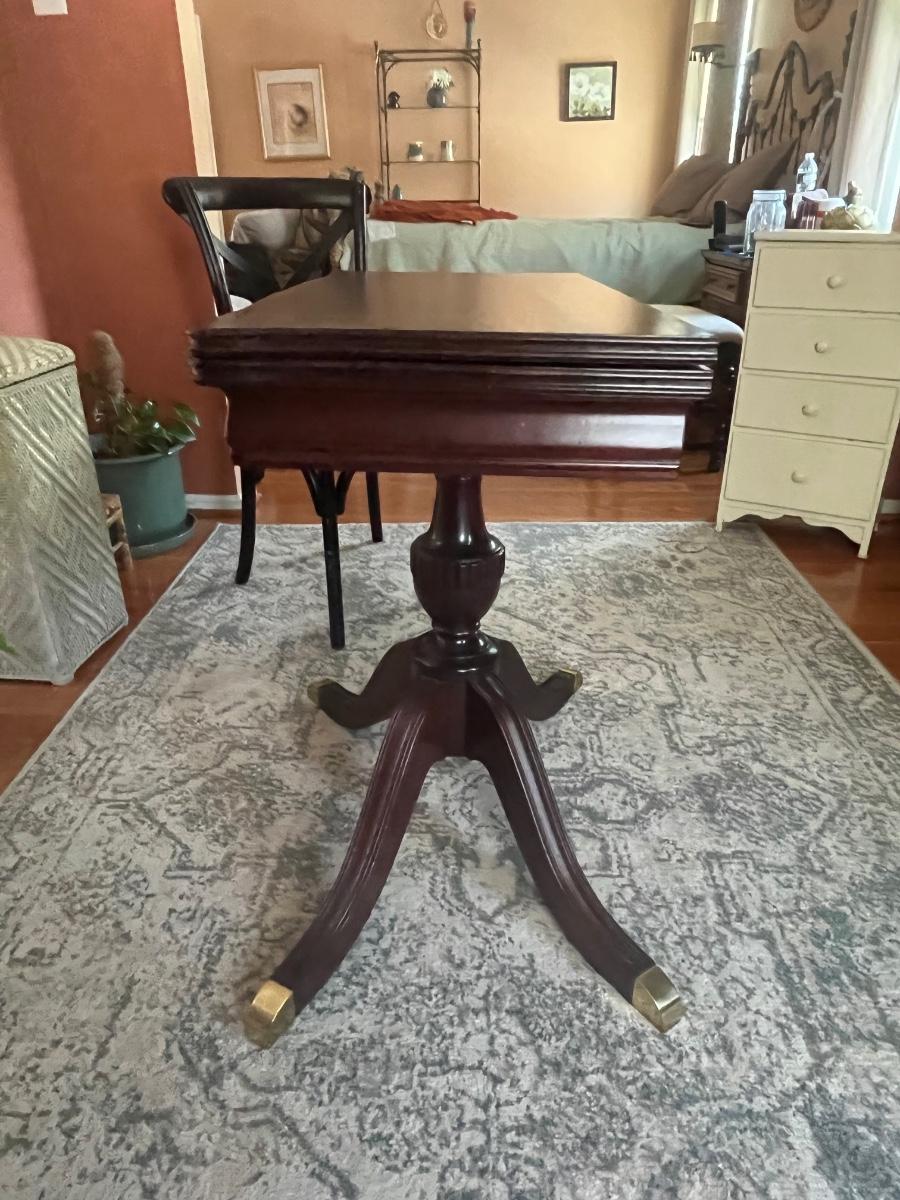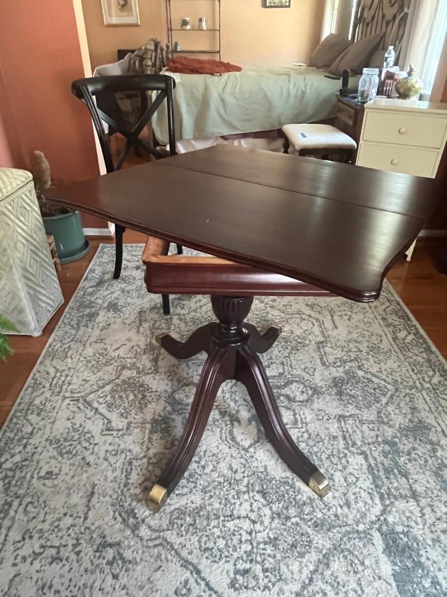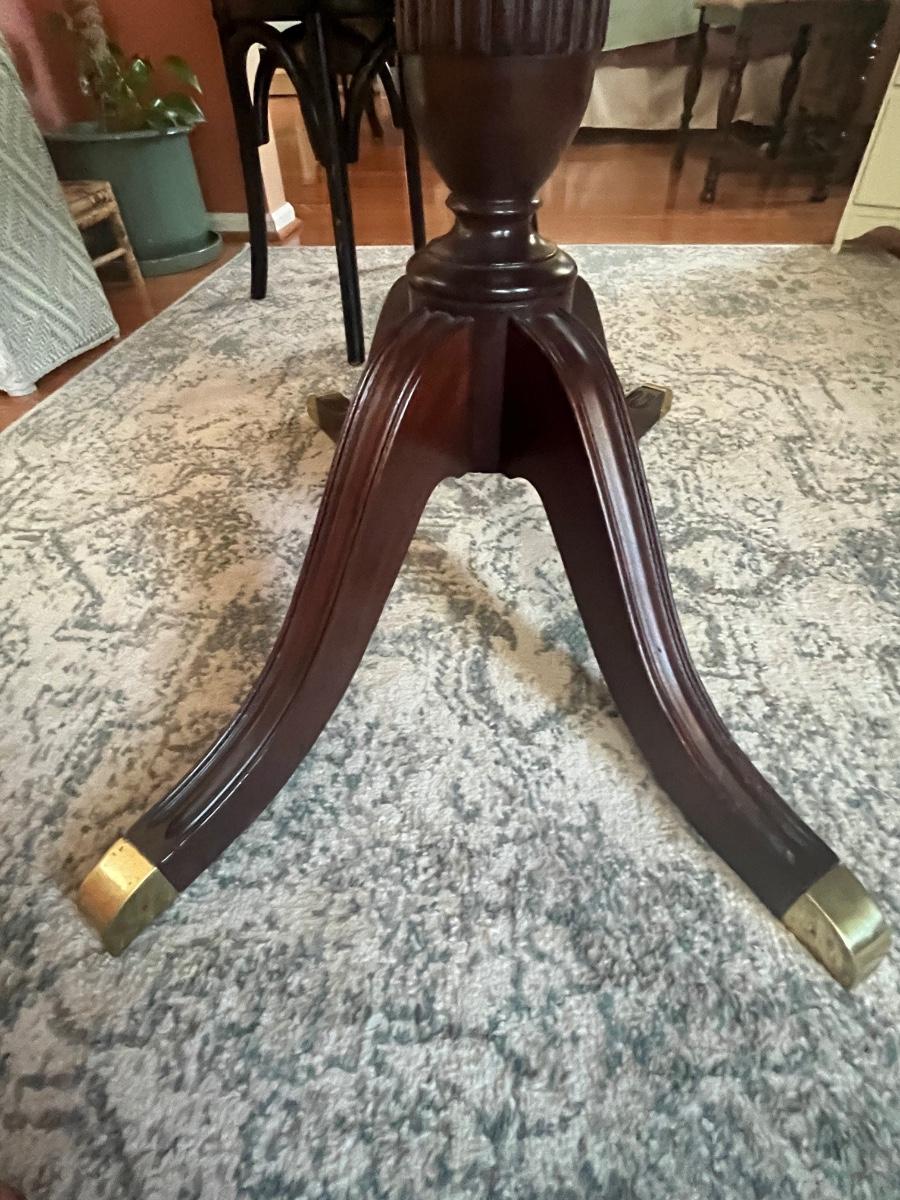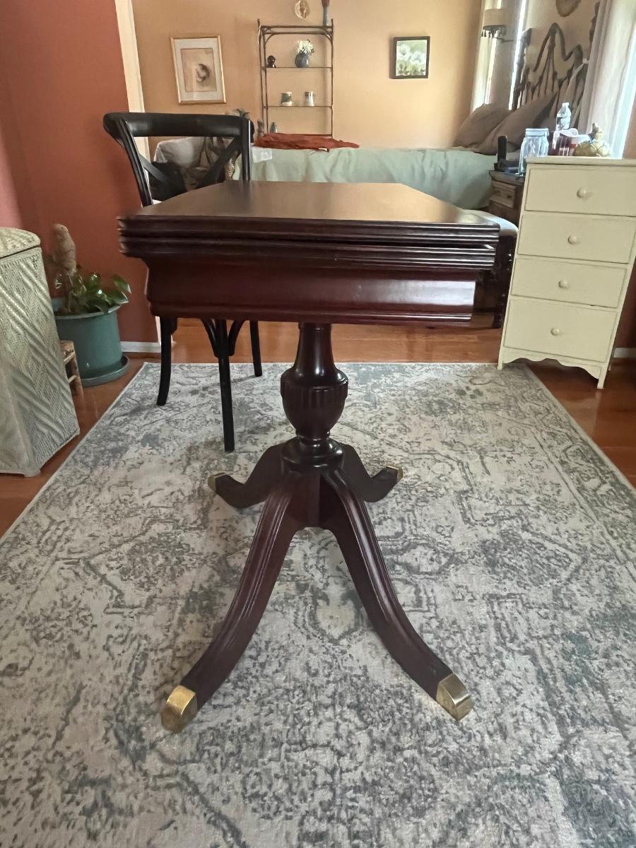 This a great piece with a pedestal base, and four brass feet. The top will swivel then fold with a small area for storage. 30x30x28. Table only. Please see all pictures as they are the best representation of the items. The pictures show condition, measurements if taken, and what is included in the lot. Due to the large amount that we photograph and the time frame, we are not always able to take measurements. All items unless noted, are pre-owned and have been used. If you purchased furniture, you must bring help. We do not allow one person to carry large furniture out on their own. Bring help, tools and a truck for the safety of our client’s homes, and your personal safety. Any damages that result to the property including walls, and floors due to moving of the furniture will be charged to the buyer. Company policy. Thank you.