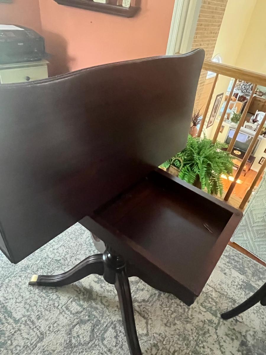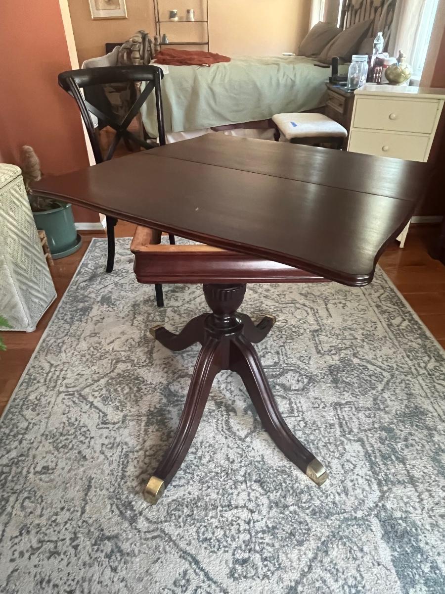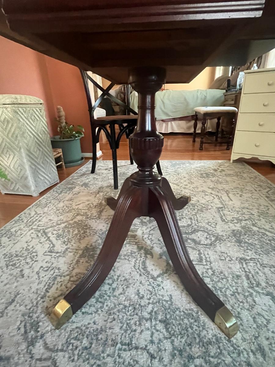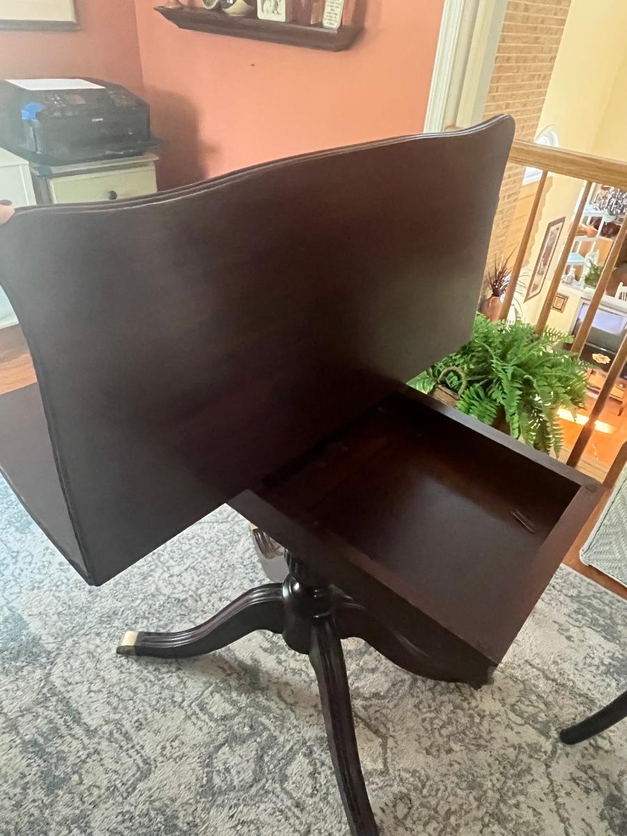 This a great piece with a pedestal base, and four brass feet. The top will swivel then fold with a small area for storage. 30x30x28. Table only. Please see all pictures as they are the best representation of the items. The pictures show condition, measurements if taken, and what is included in the lot. Due to the large amount that we photograph and the time frame, we are not always able to take measurements. All items unless noted, are pre-owned and have been used. If you purchased furniture, you must bring help. We do not allow one person to carry large furniture out on their own. Bring help, tools and a truck for the safety of our client’s homes, and your personal safety. Any damages that result to the property including walls, and floors due to moving of the furniture will be charged to the buyer. Company policy. Thank you.