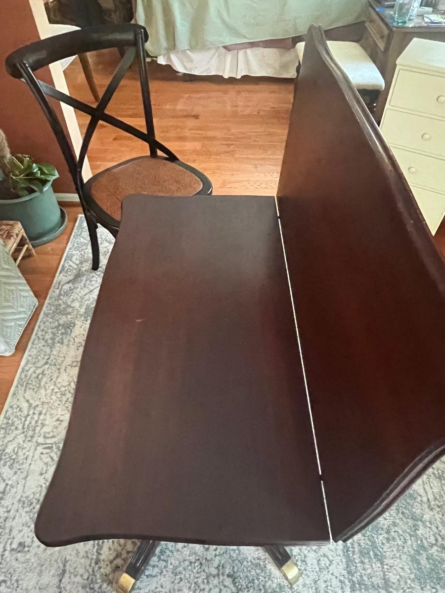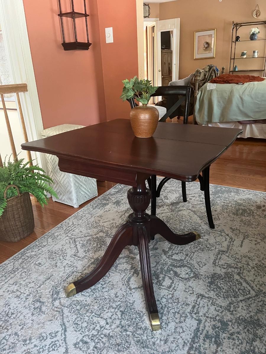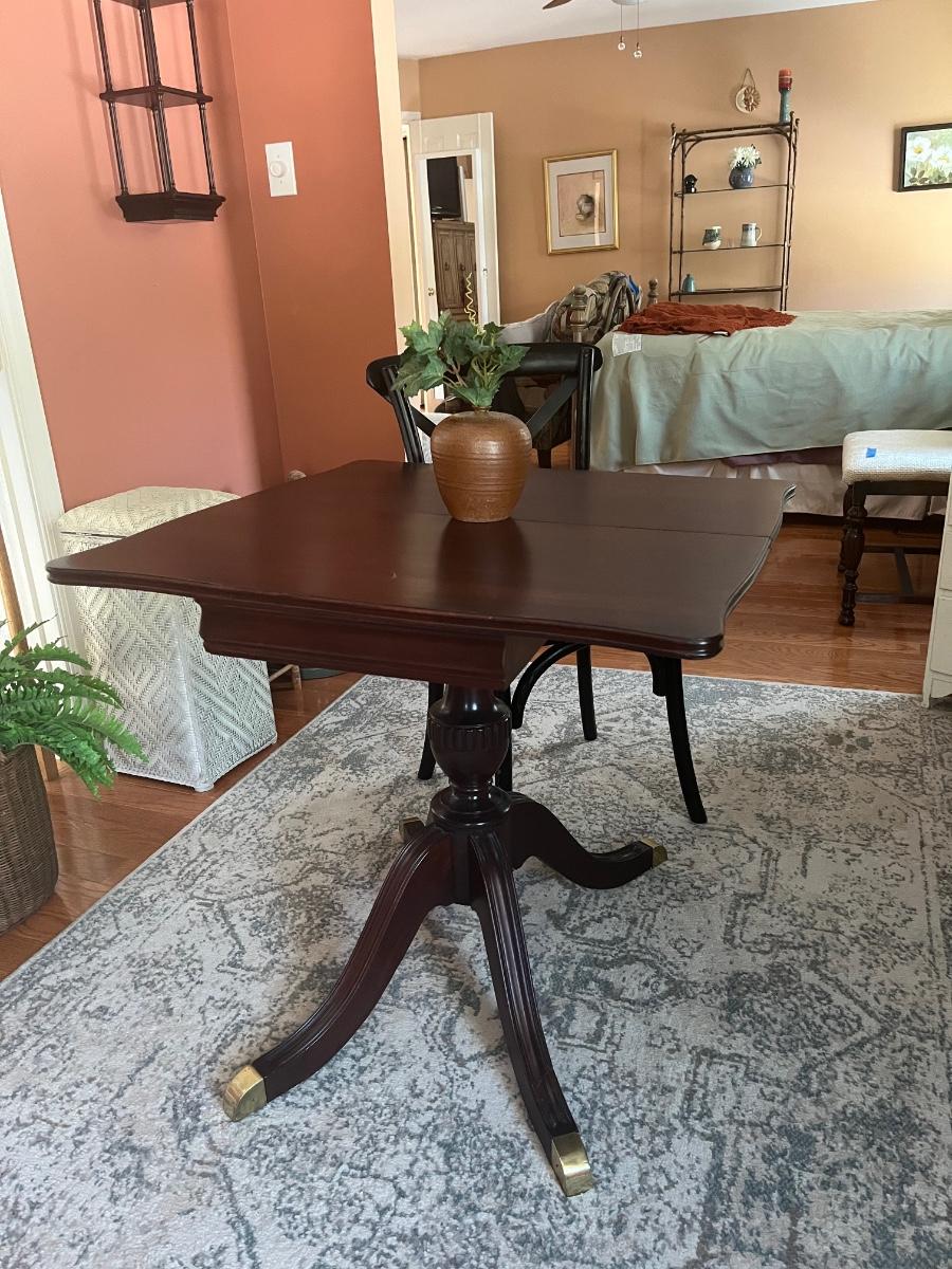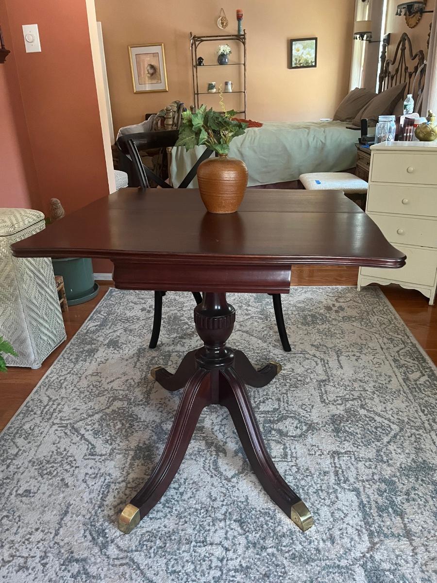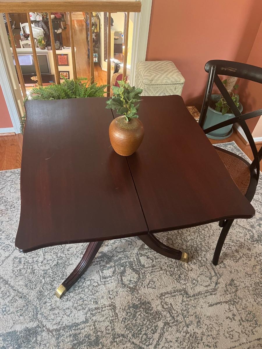 This a great piece with a pedestal base, and four brass feet. The top will swivel then fold with a small area for storage. 30x30x28. Table only. Please see all pictures as they are the best representation of the items. The pictures show condition, measurements if taken, and what is included in the lot. Due to the large amount that we photograph and the time frame, we are not always able to take measurements. All items unless noted, are pre-owned and have been used. If you purchased furniture, you must bring help. We do not allow one person to carry large furniture out on their own. Bring help, tools and a truck for the safety of our client’s homes, and your personal safety. Any damages that result to the property including walls, and floors due to moving of the furniture will be charged to the buyer. Company policy. Thank you.