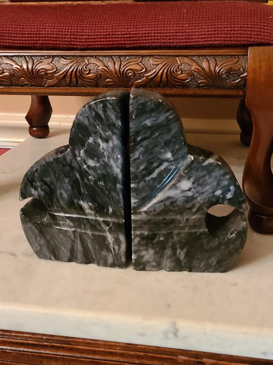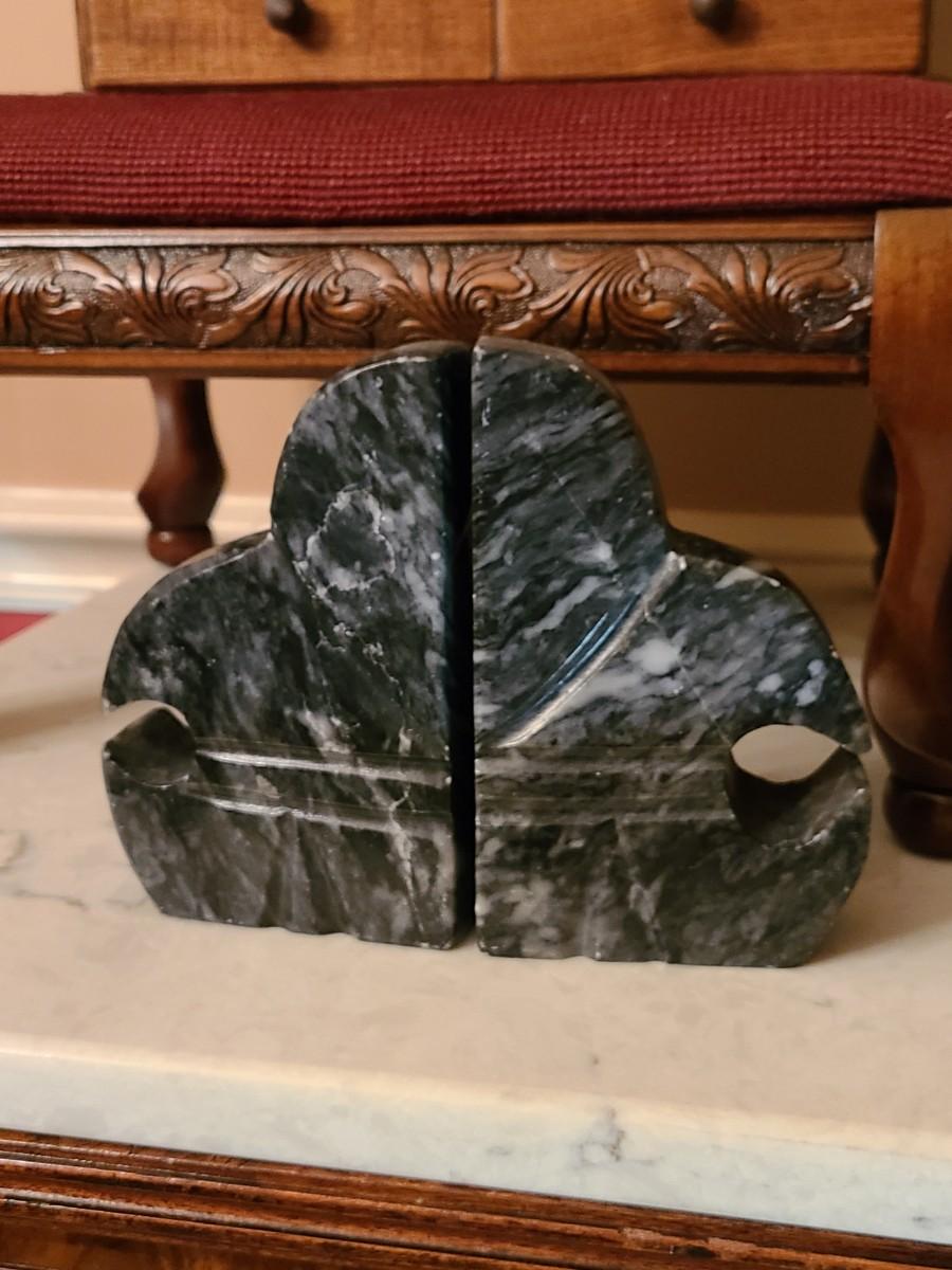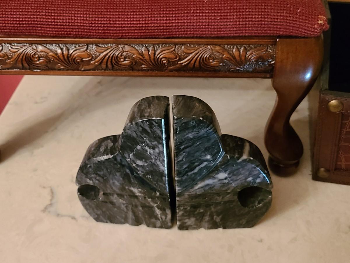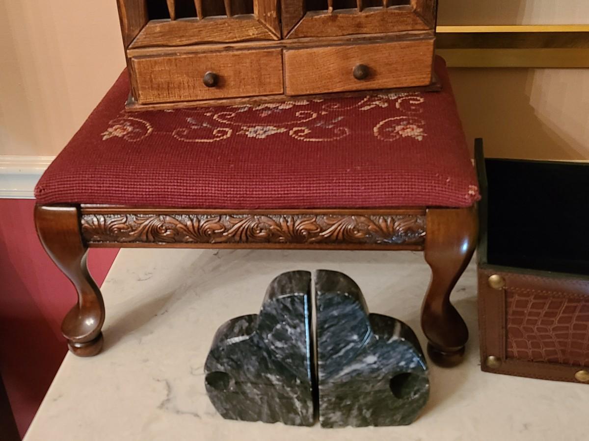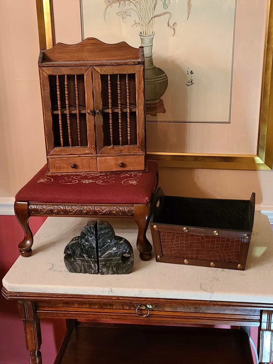 Lot 494: Tapestry Foot Stool, Wood Curio Cabinet, Natural Stone Bookends and More