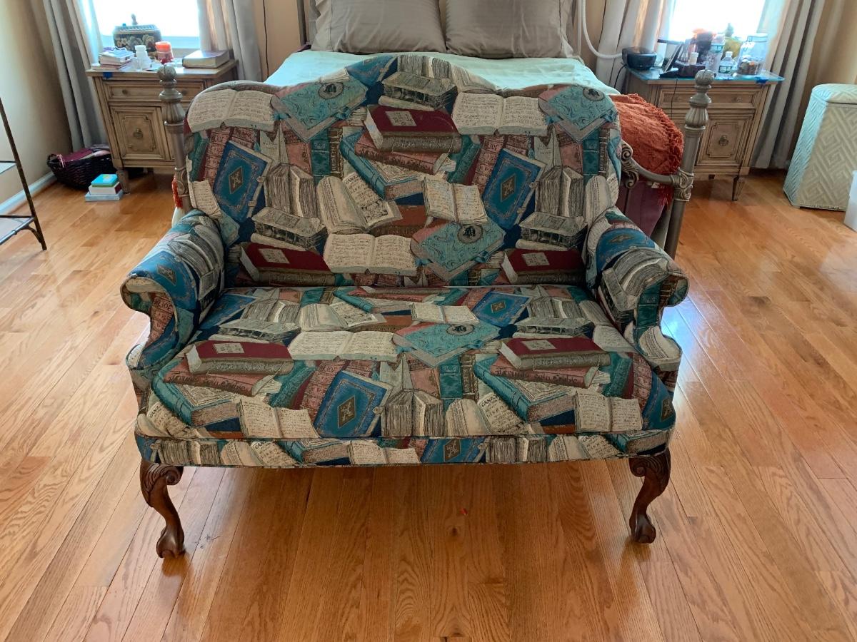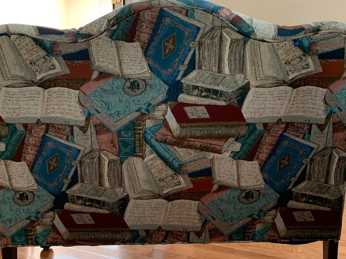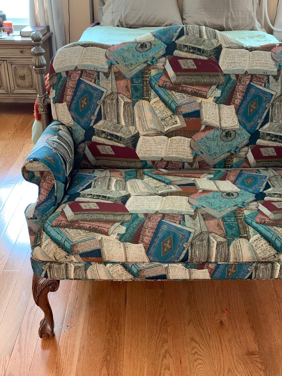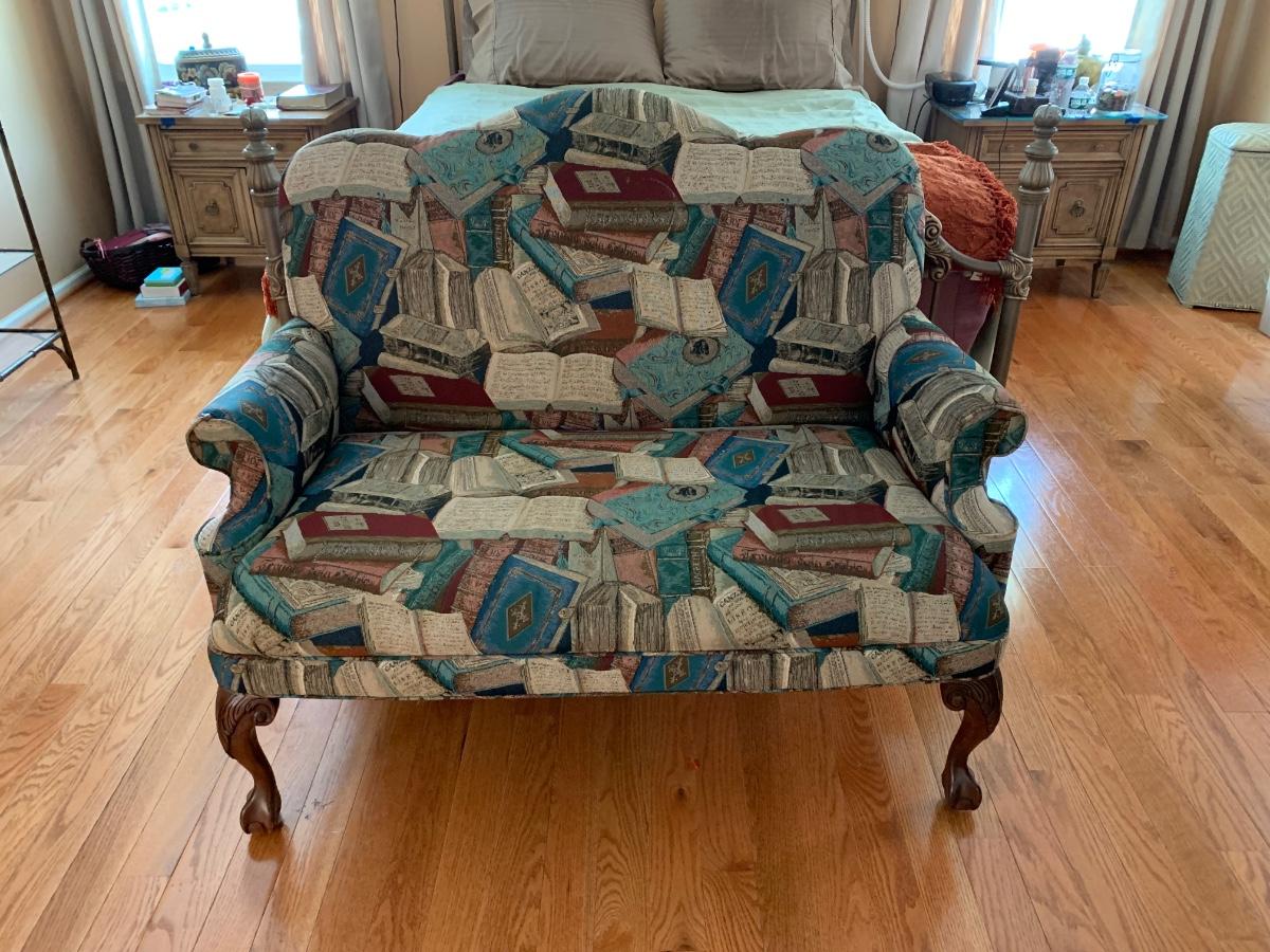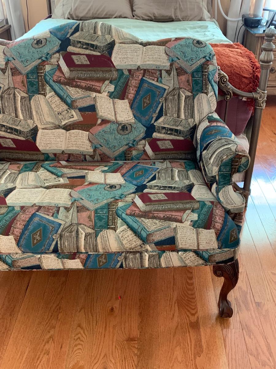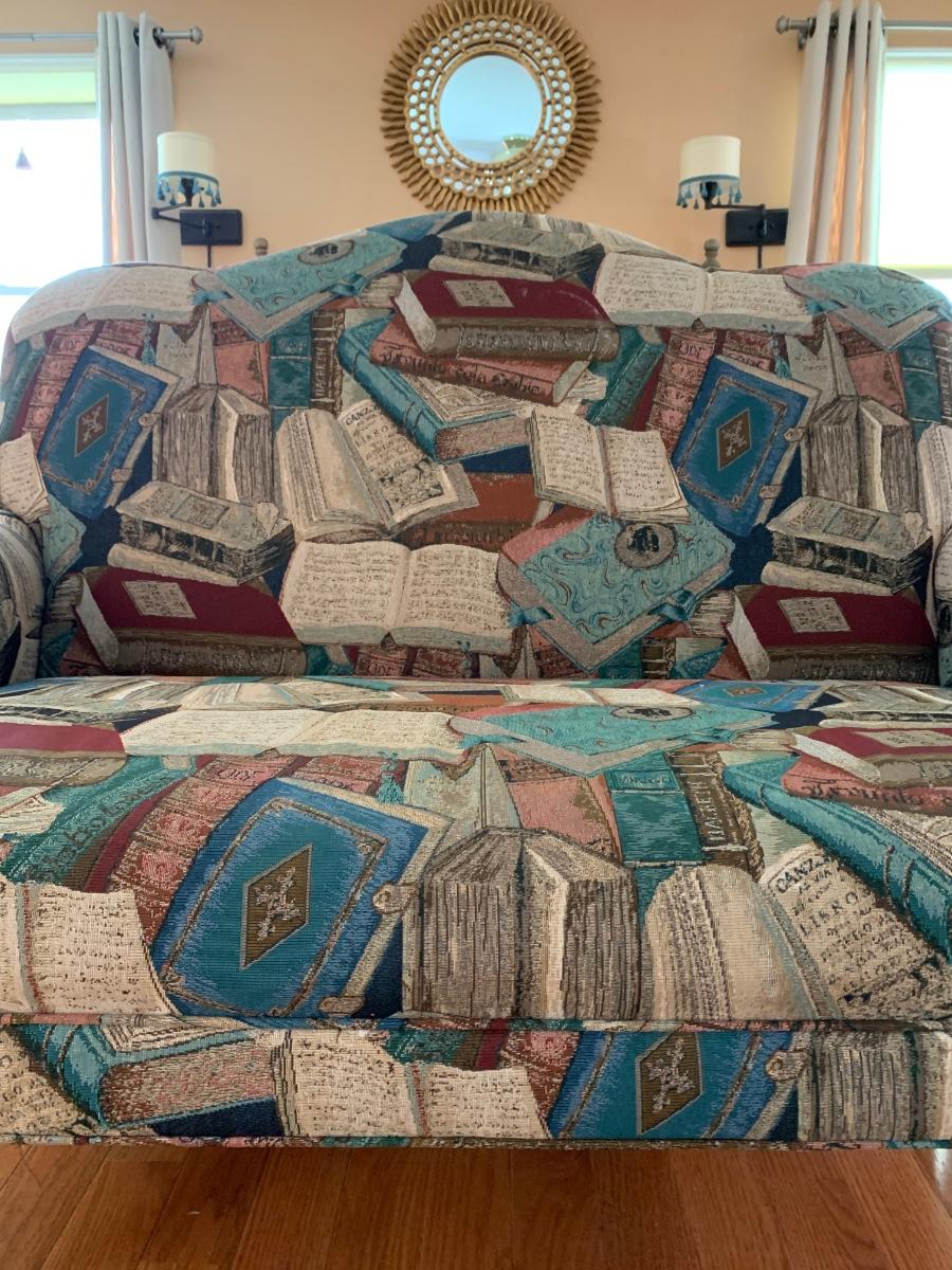 Settee with library/books fabric in very good condition and comfy. Awesome addition to any home.