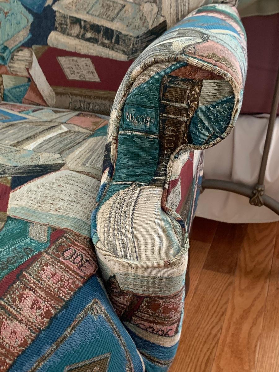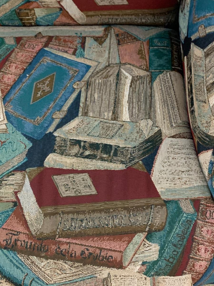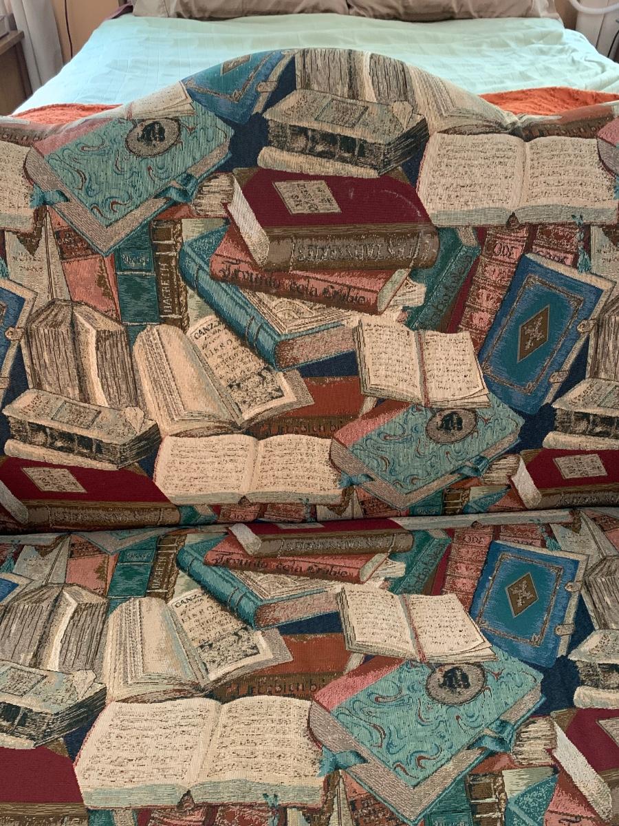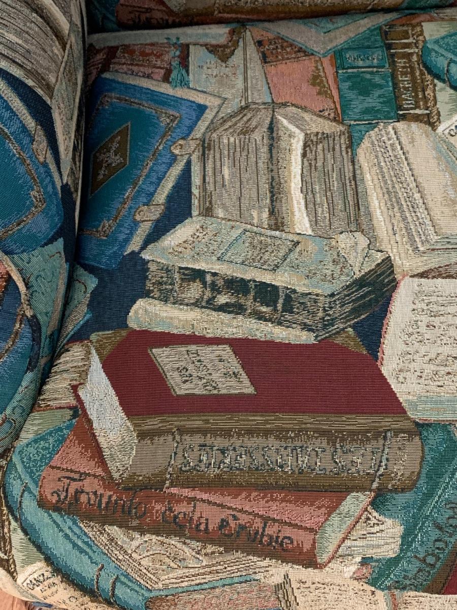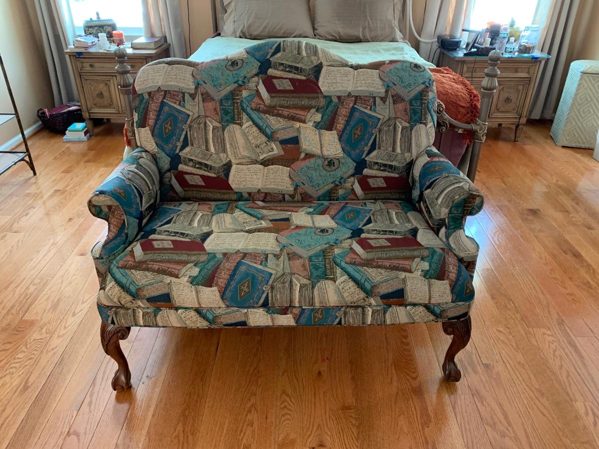 Settee with library/books fabric in very good condition and comfy. Awesome addition to any home.