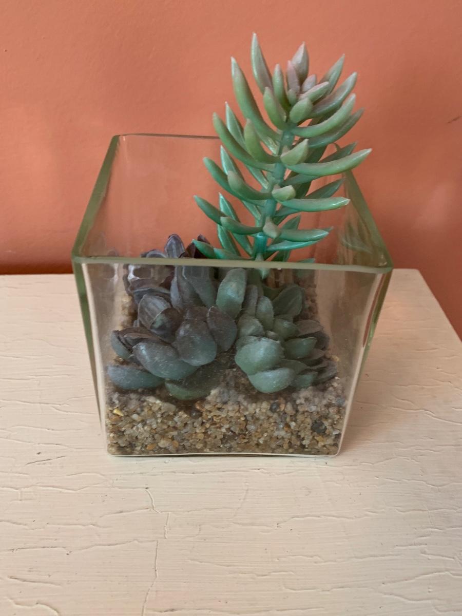Lot 262R: Small Vintage Side Table with Drawers & Faux Plant
