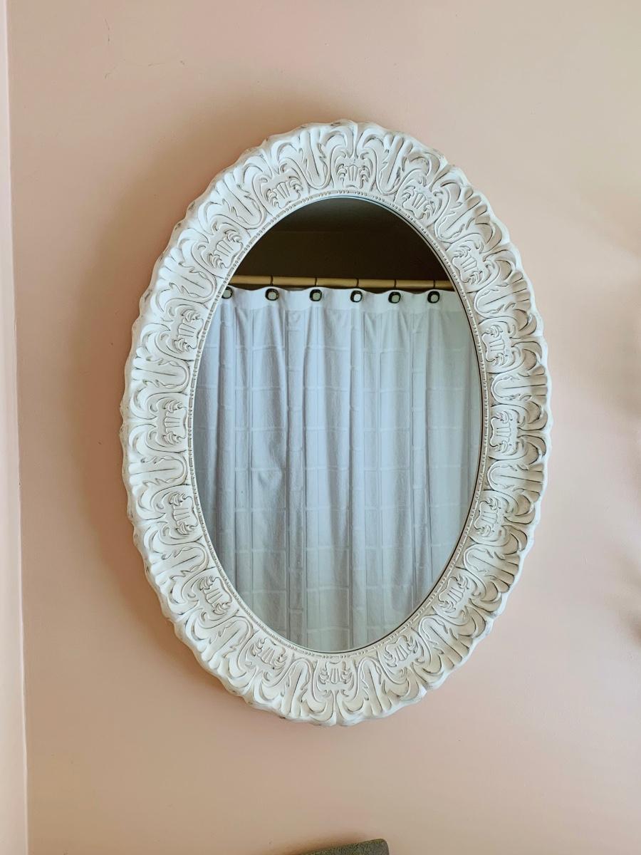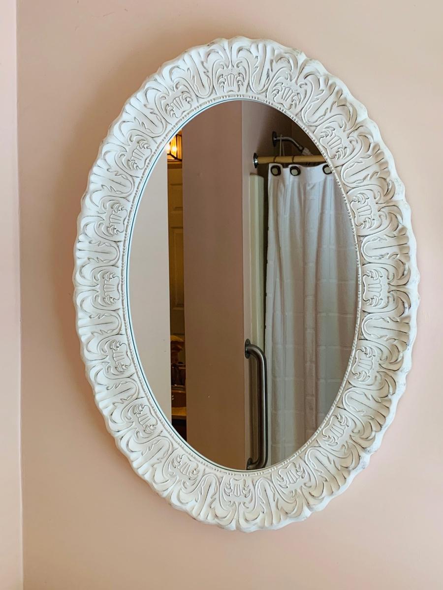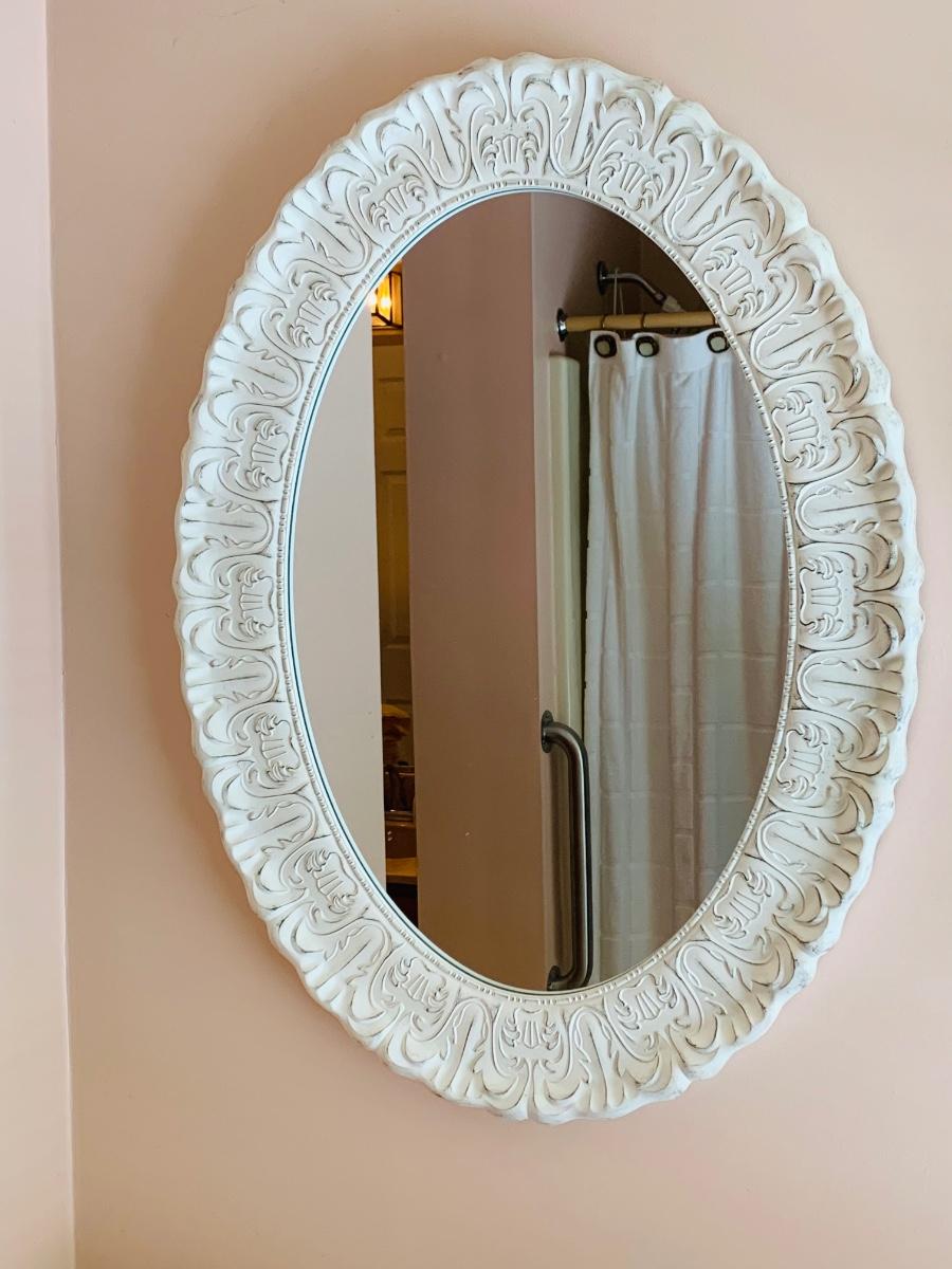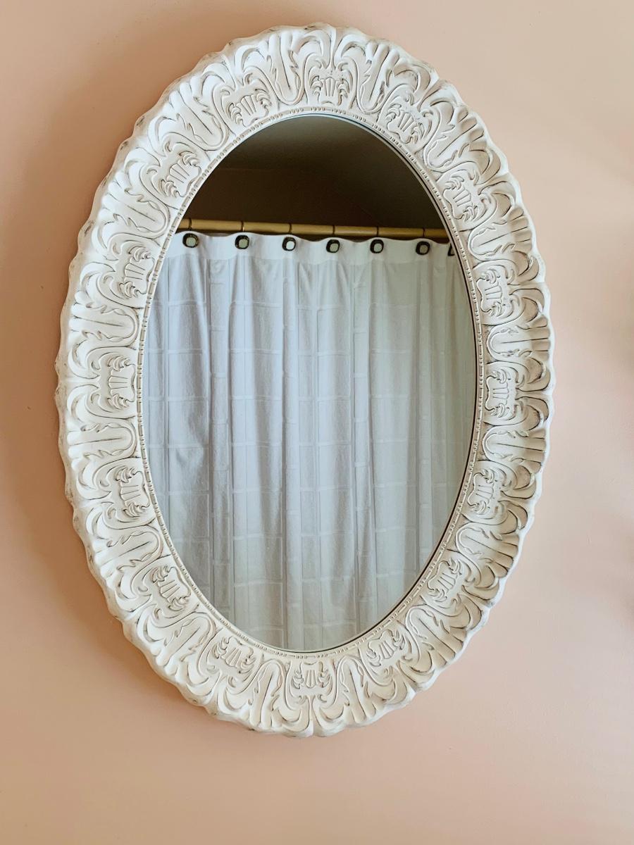 Oval composite accent mirror with a vintage look. This is lightweight. Was used in a powder room above the loo for a farmhouse vintage look.