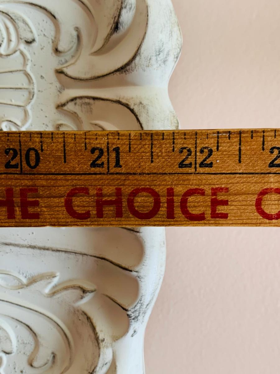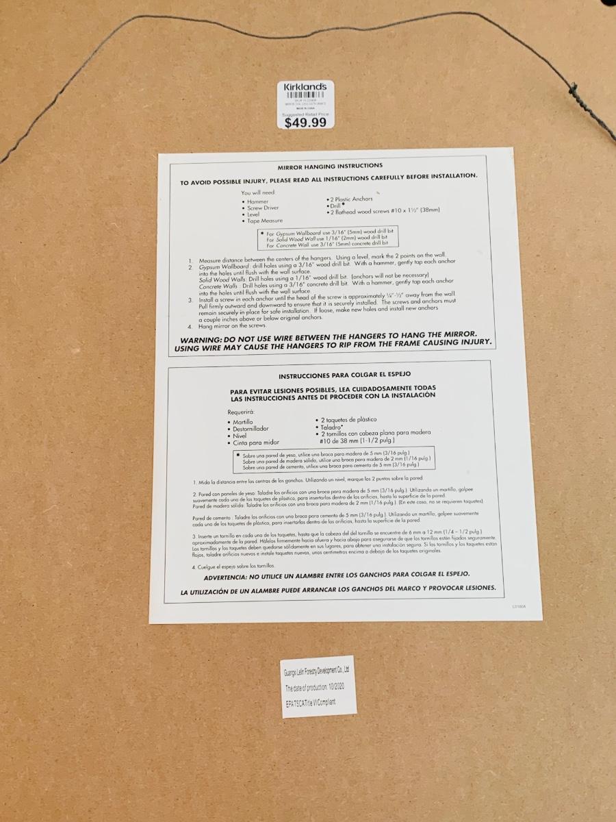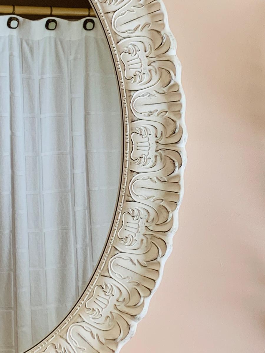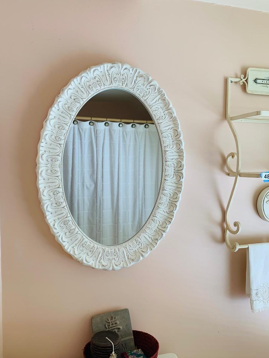 Oval composite accent mirror with a vintage look. This is lightweight. Was used in a powder room above the loo for a farmhouse vintage look.