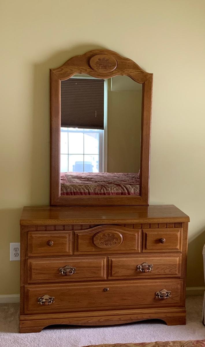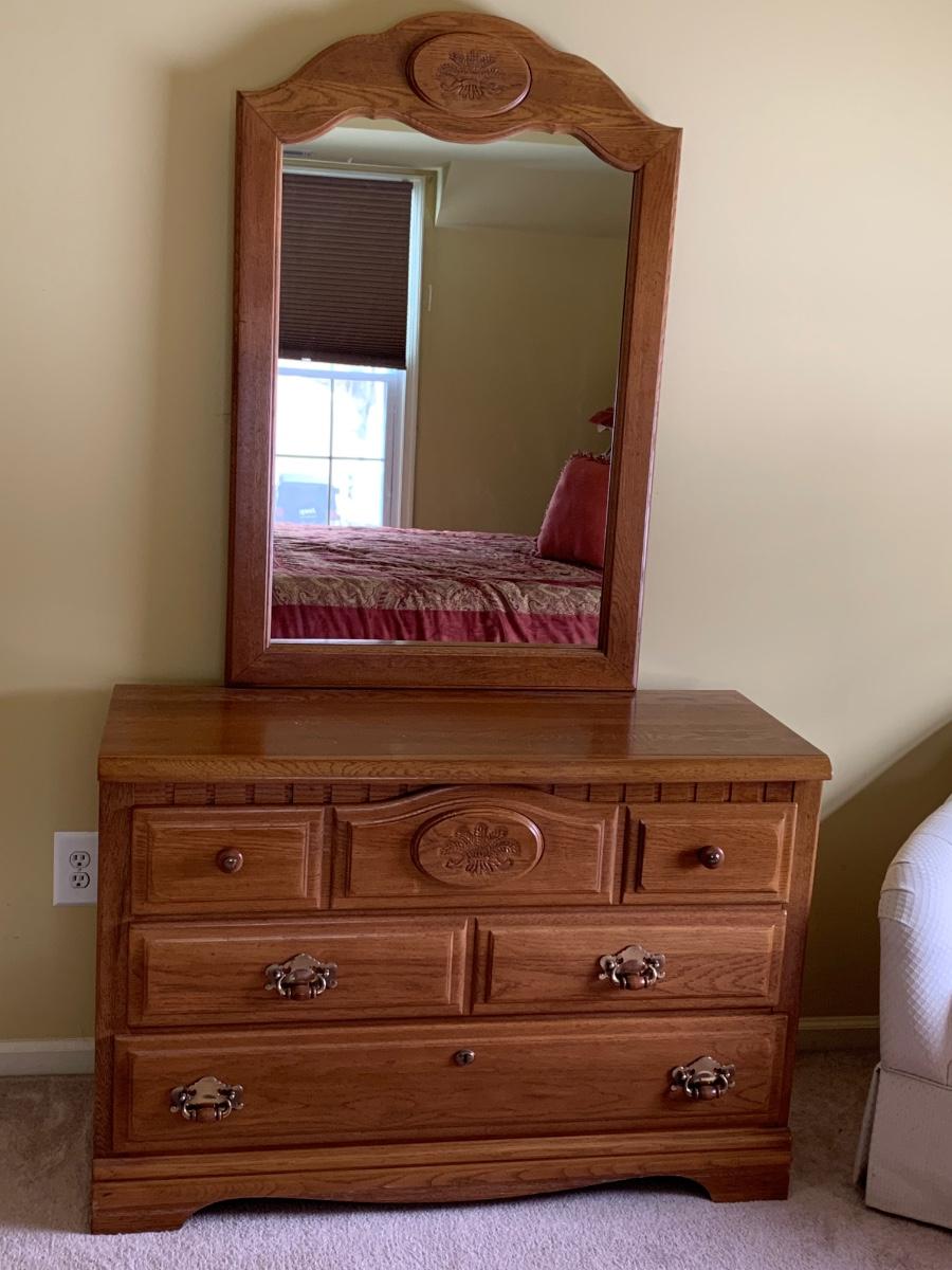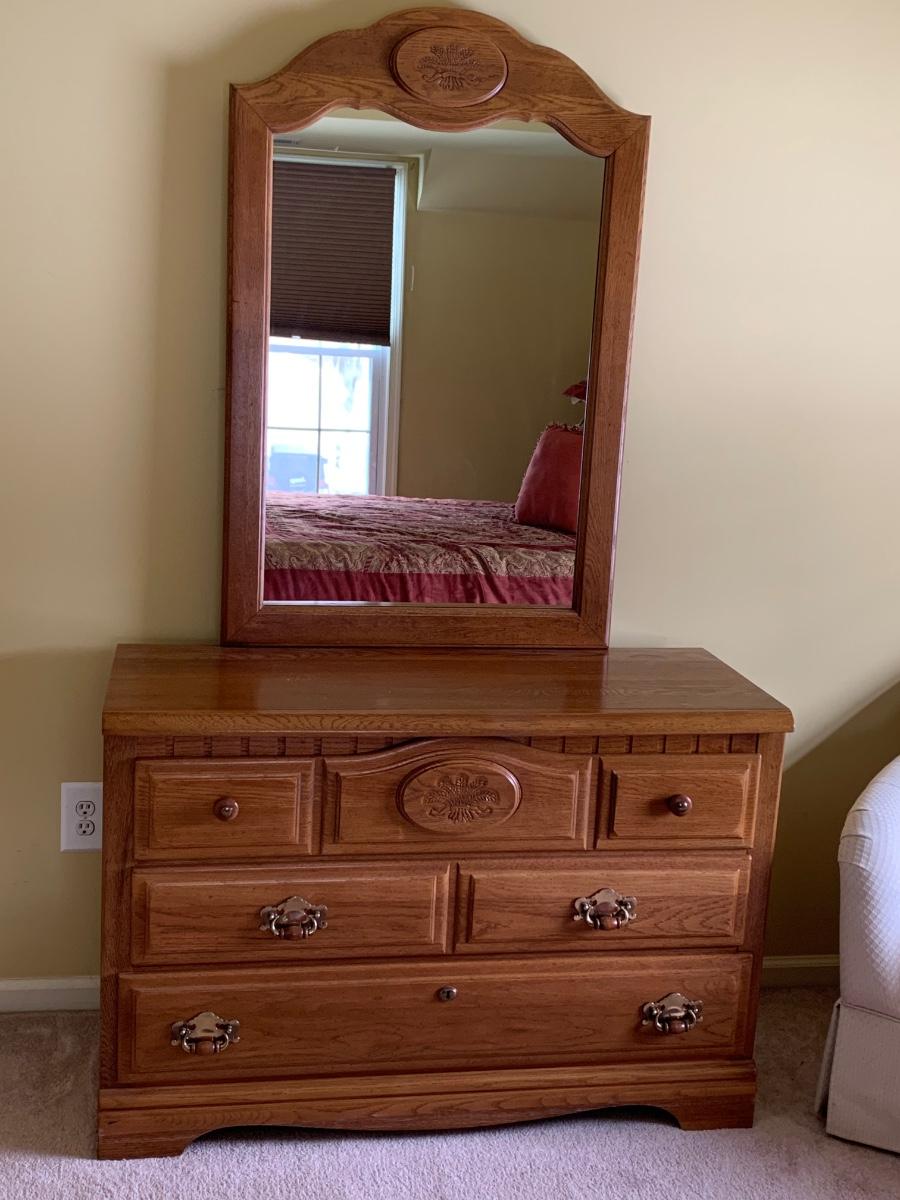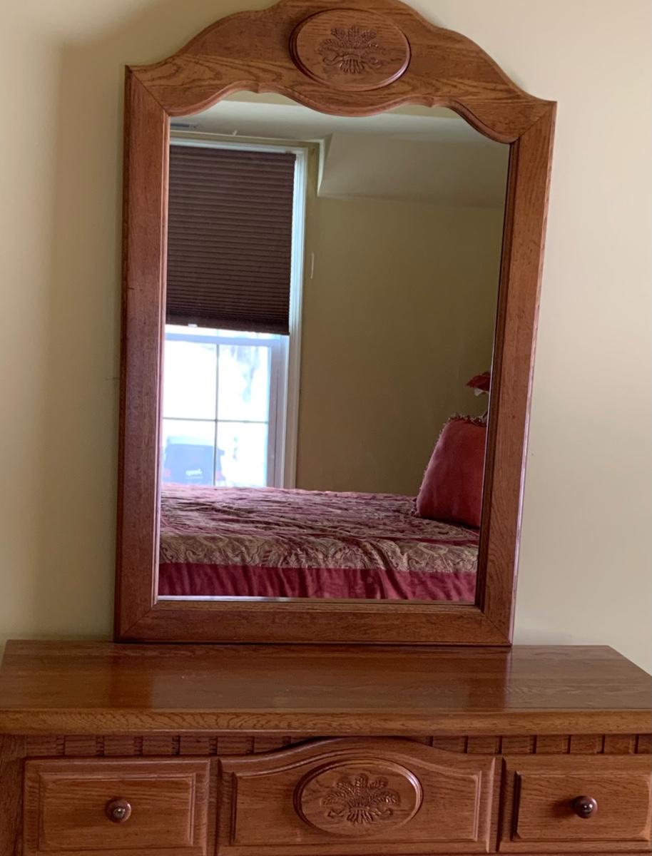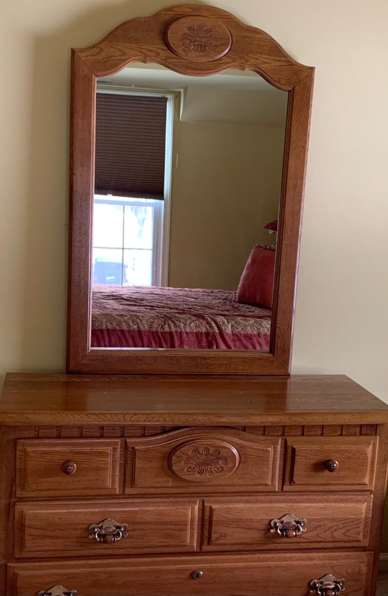 Oak bureau/dress with mirror. This piece is not all solid oak there are oak features.29 x 45 mirror 44 x 18 x 30 bureau
