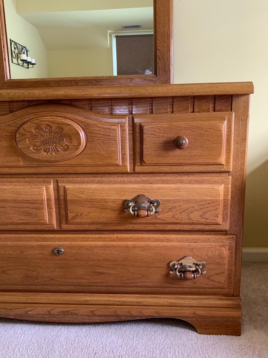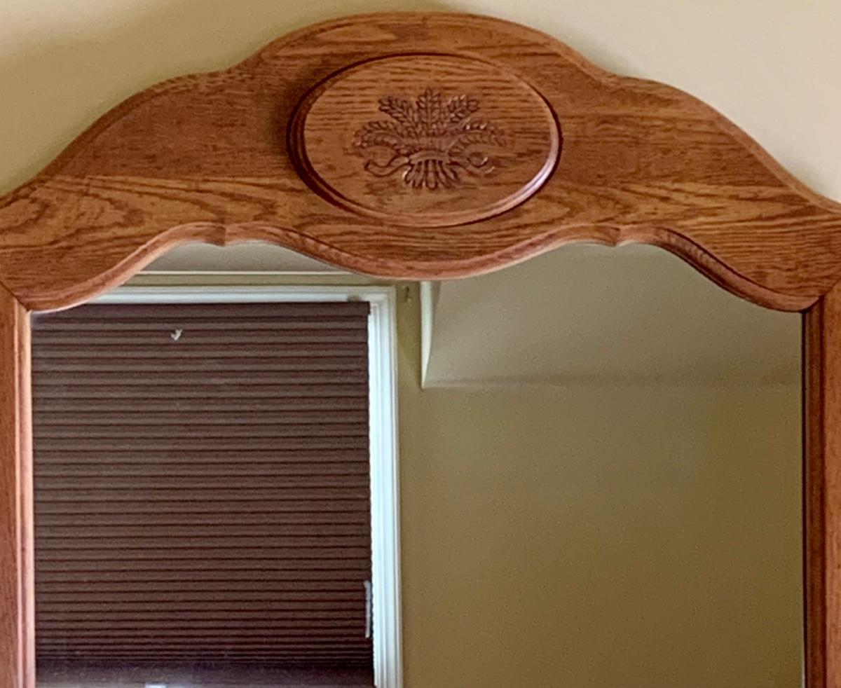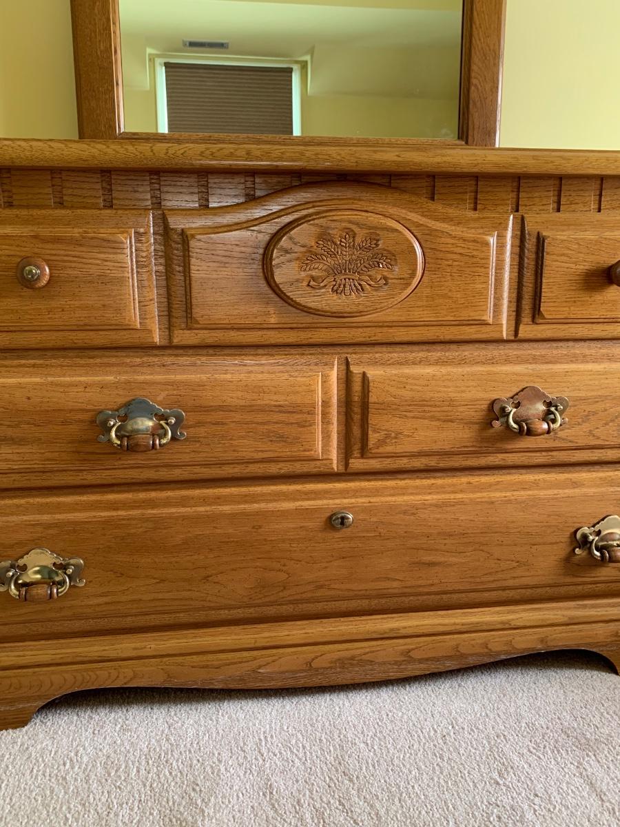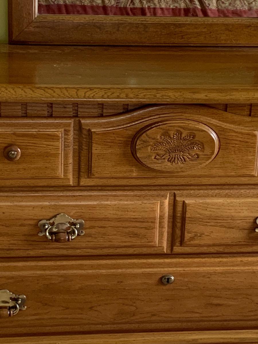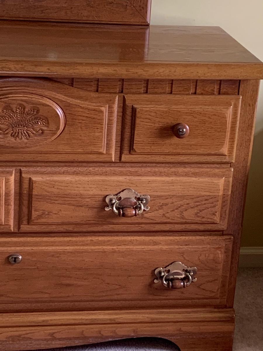 Oak bureau/dress with mirror. This piece is not all solid oak there are oak features.29 x 45 mirror 44 x 18 x 30 bureau