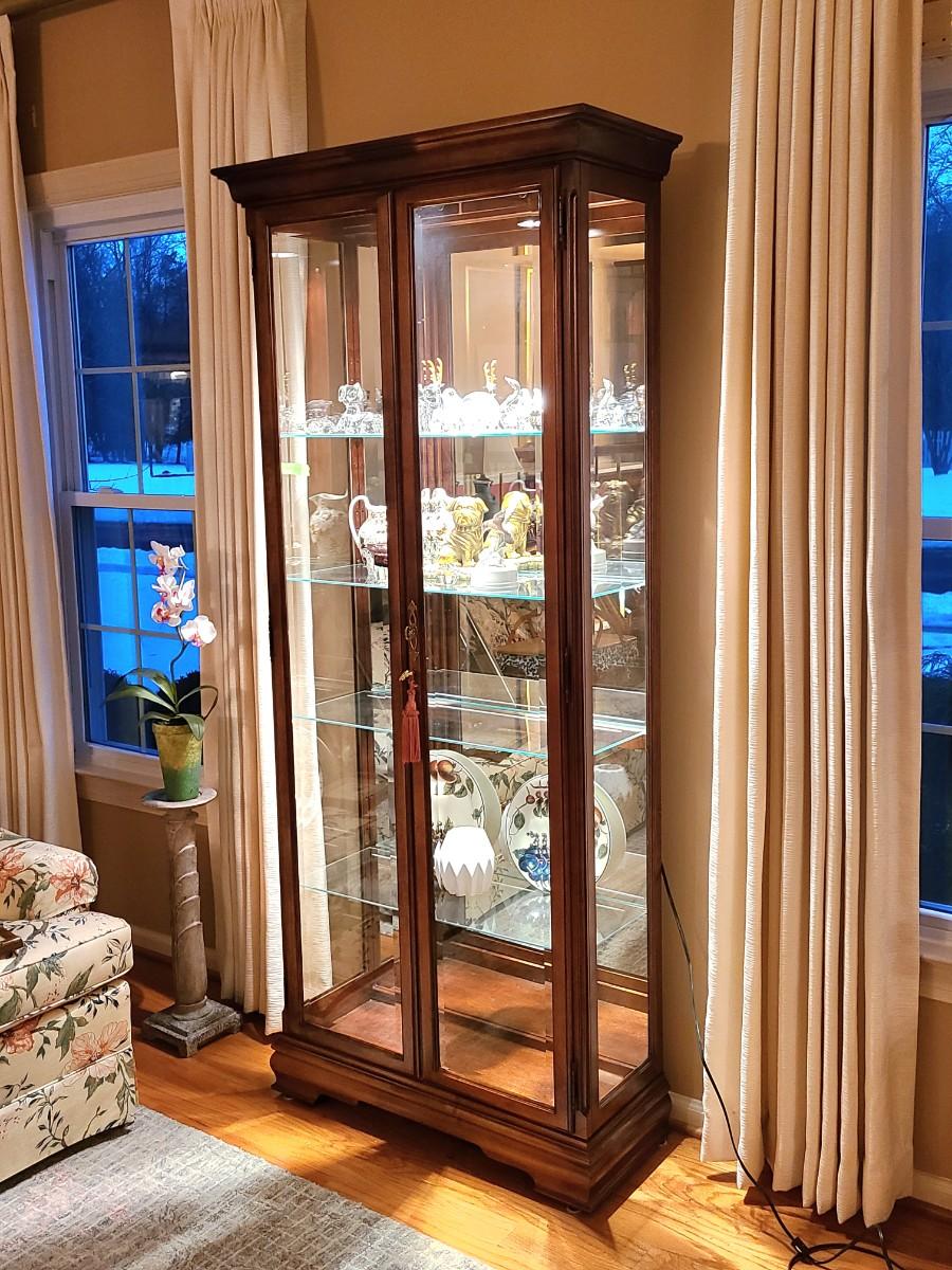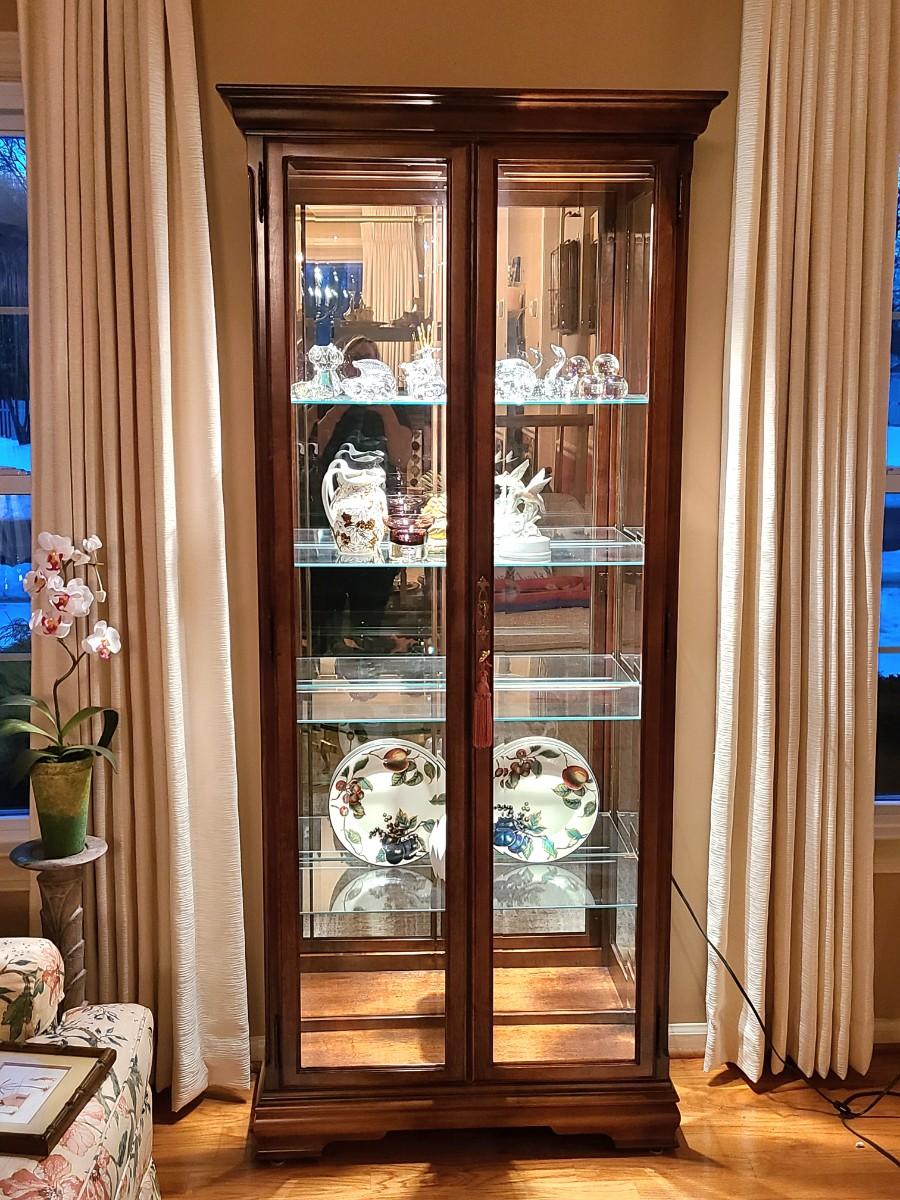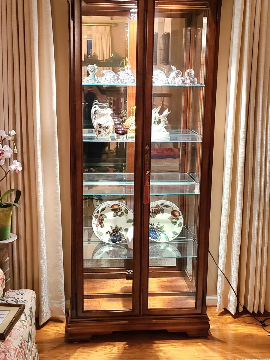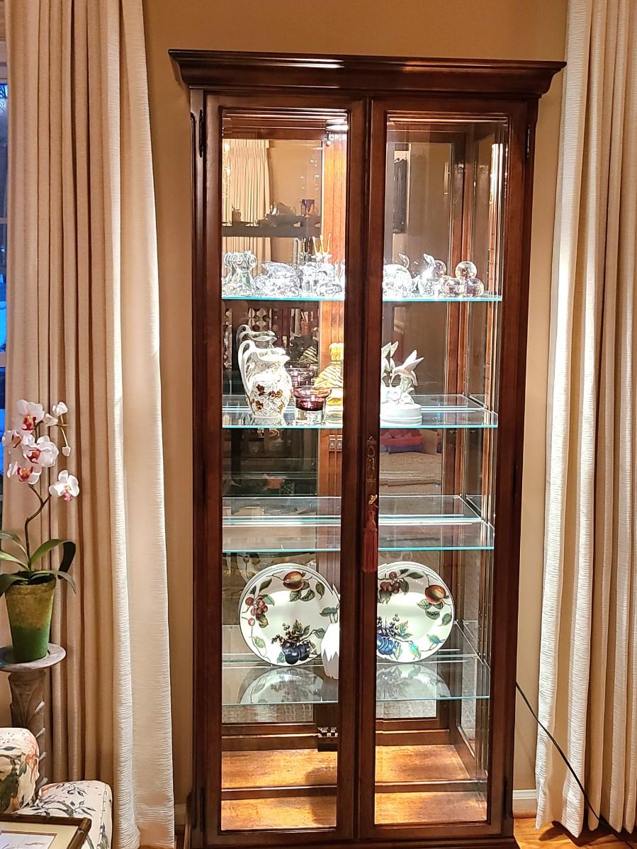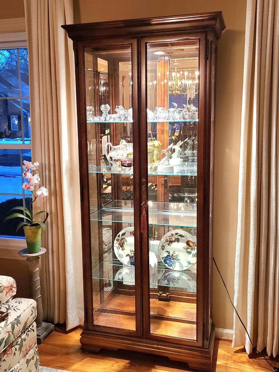 Cabinet is lighted, has glass on front and sides with 4 glass shelves (31 x 13 x 78) Please see all pictures as they are the best representation of the items. The pictures show condition, measurements if taken, and what is included in the lot. Due to the large amount that we photograph and the time frame, we are not always able to take measurements. All items unless noted, are pre-owned and have been used. If you purchased furniture, you must bring help. We do not allow one person to carry large furniture out on their own. Bring help, tools and a truck for the safety of our client’s homes, and your personal safety. Any damages that result to the property including walls, and floors due to moving of the furniture will be charged to the buyer. Company policy. Thank you.