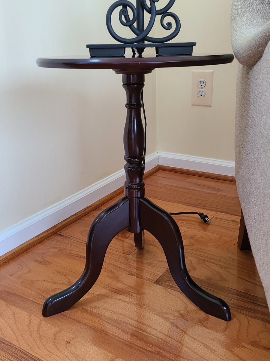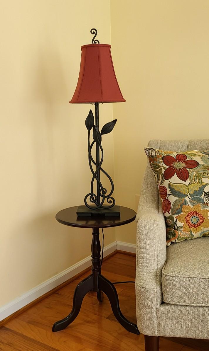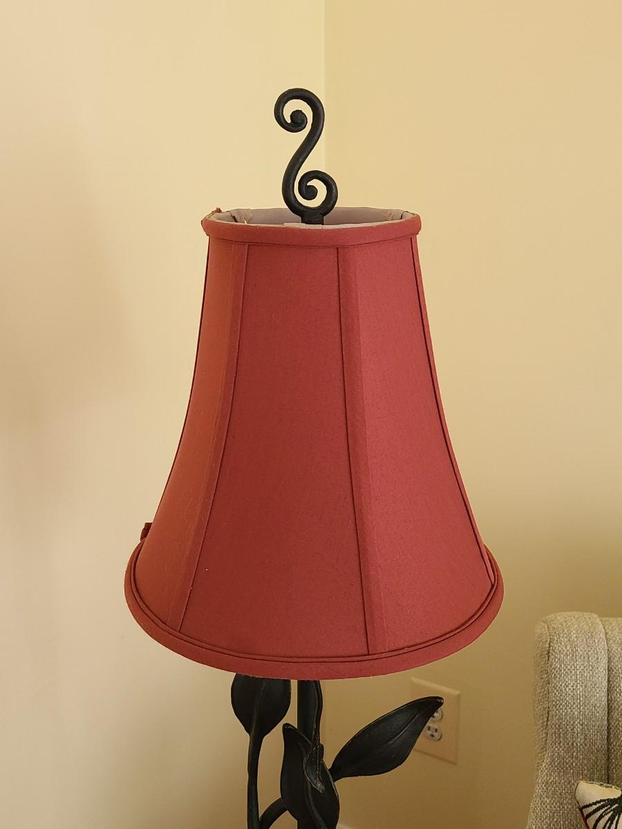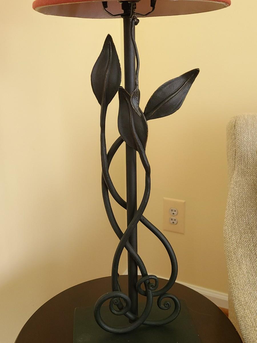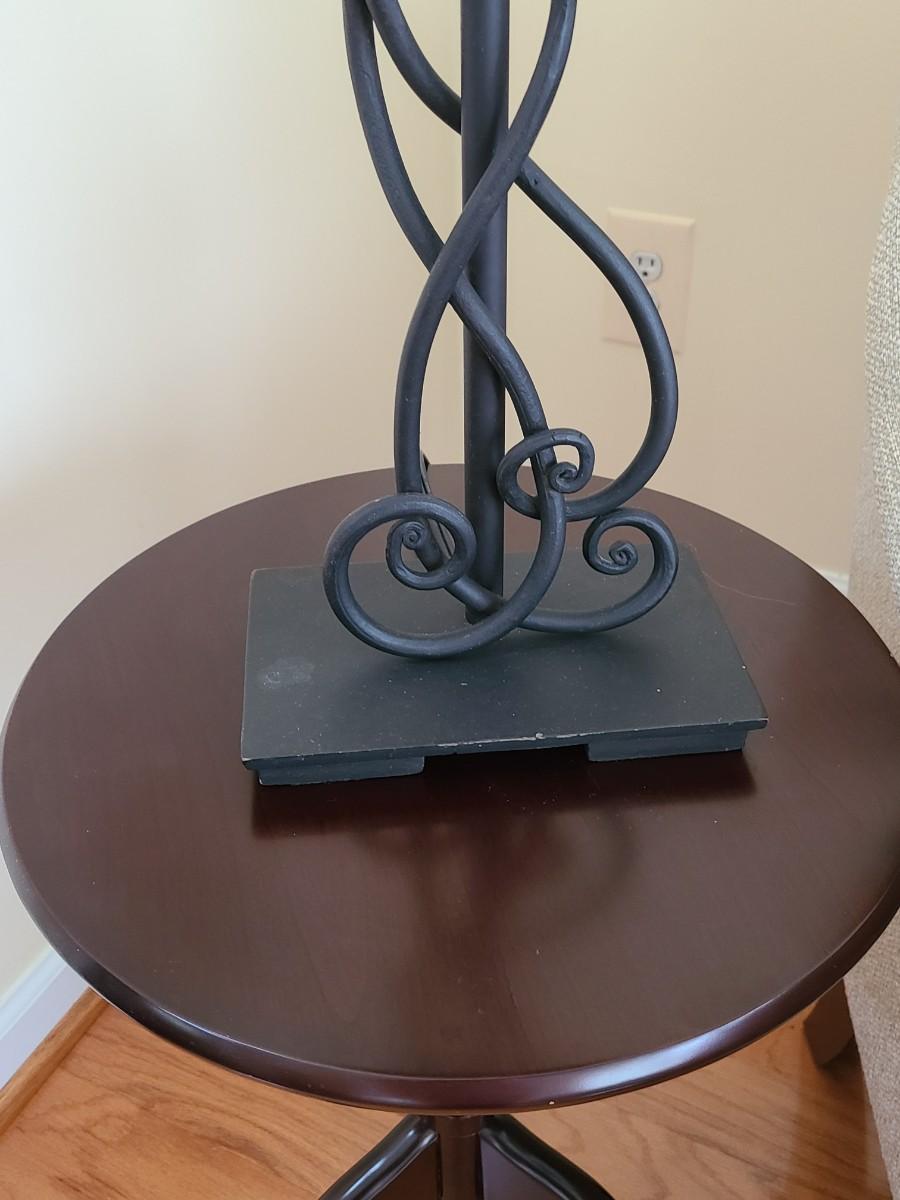 Lovely black metal lamp with leaf details (32 inches tall), and small Bombay accent table (21 inches tall, and 15 across). Please see all pictures as they are the best representation of the items. The pictures show condition, measurements if taken, and what is included in the lot. Due to the large amount that we photograph and the time frame, we are not always able to take measurements. All items unless noted, are pre-owned and have been used. If you purchased furniture, you must bring help. We do not allow one person to carry large furniture out on their own. Bring help, tools and a truck for the safety of our client’s homes, and your personal safety. Any damages that result to the property including walls, and floors due to moving of the furniture will be charged to the buyer. Company policy. Thank you.