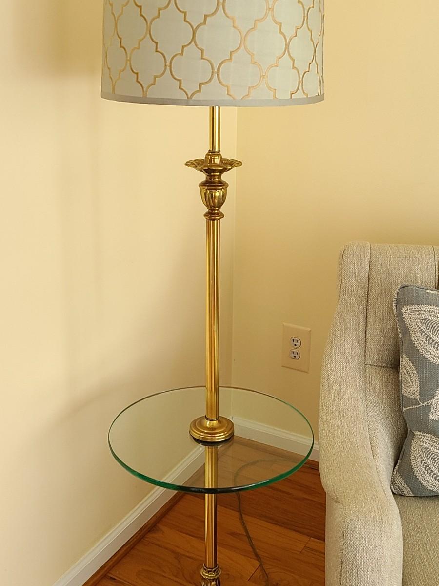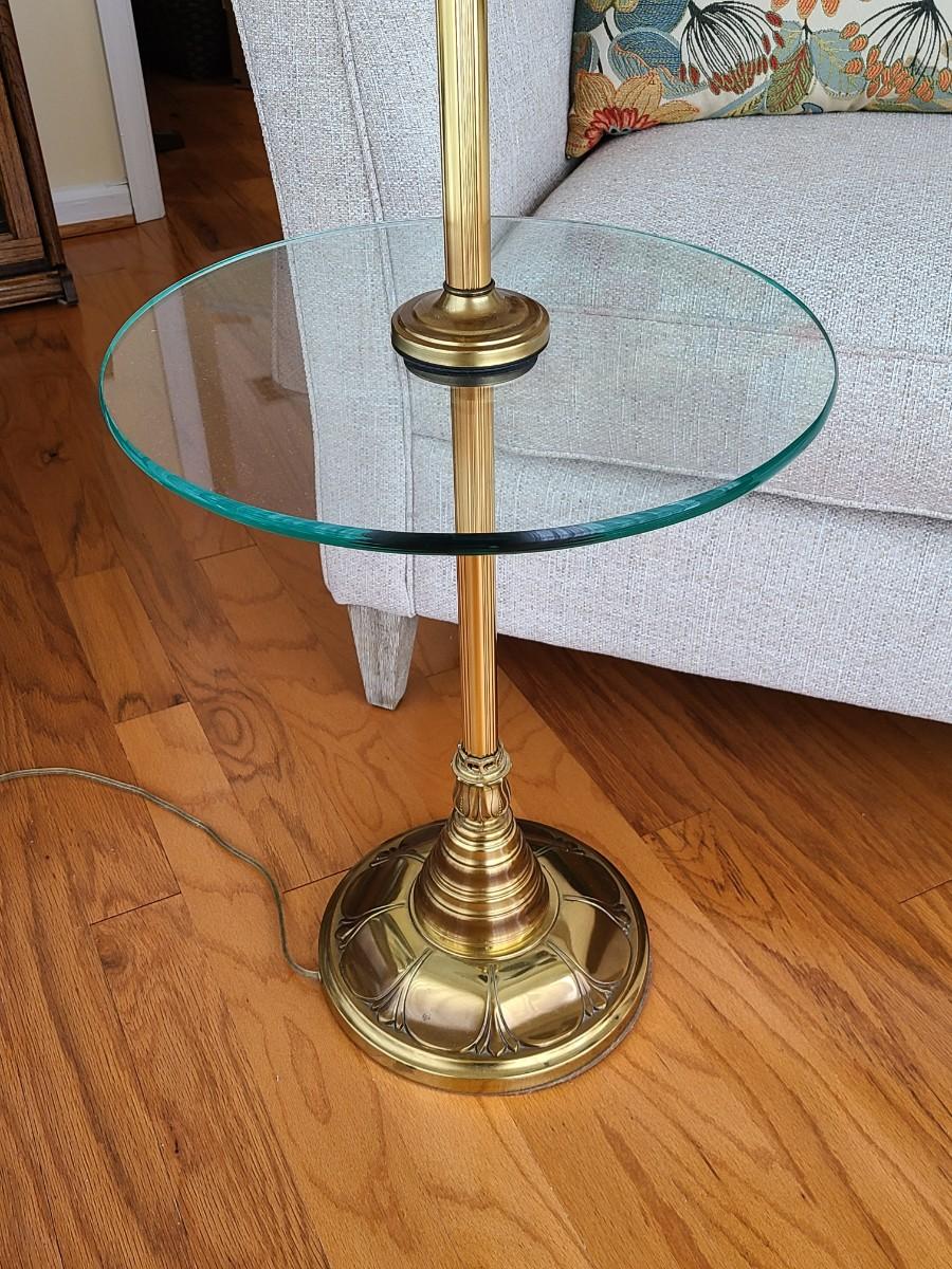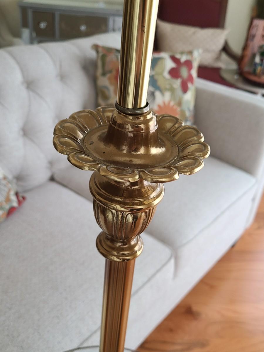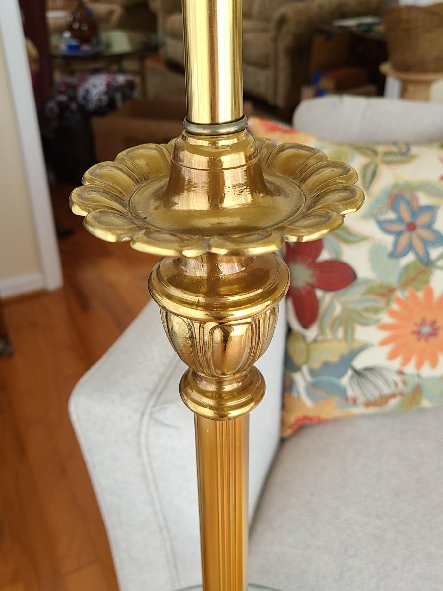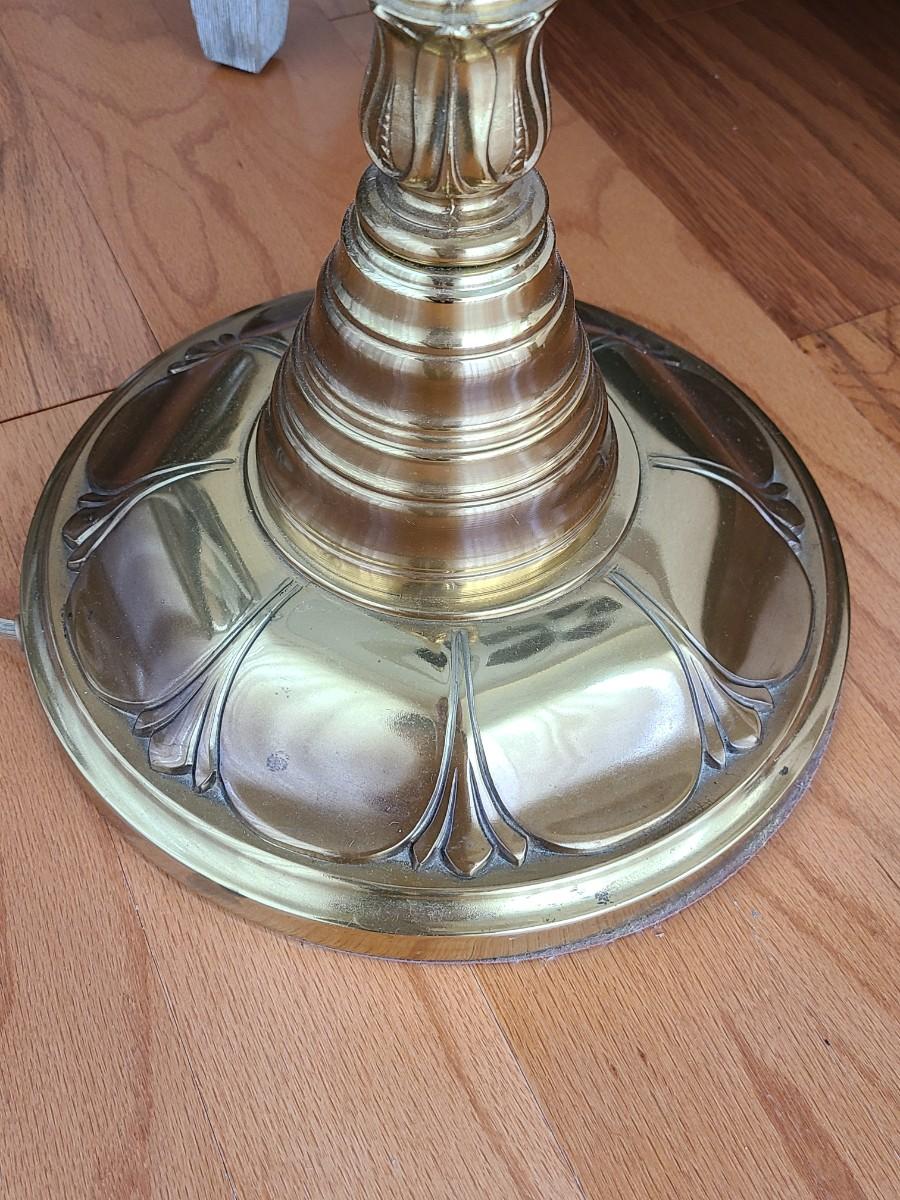 5 feet tall, and glass is 16 inches across. This is heavy like brass, but is not marked. This lamp is gorgeous! Please see all pictures as they are the best representation of the items. The pictures show condition, measurements if taken, and what is included in the lot. Due to the large amount that we photograph and the time frame, we are not always able to take measurements. All items unless noted, are pre-owned and have been used. If you purchased furniture, you must bring help. We do not allow one person to carry large furniture out on their own. Bring help, tools and a truck for the safety of our client’s homes, and your personal safety. Any damages that result to the property including walls, and floors due to moving of the furniture will be charged to the buyer. Company policy. Thank you.
