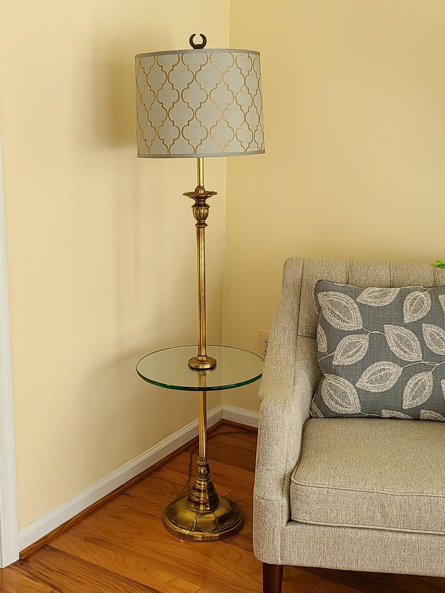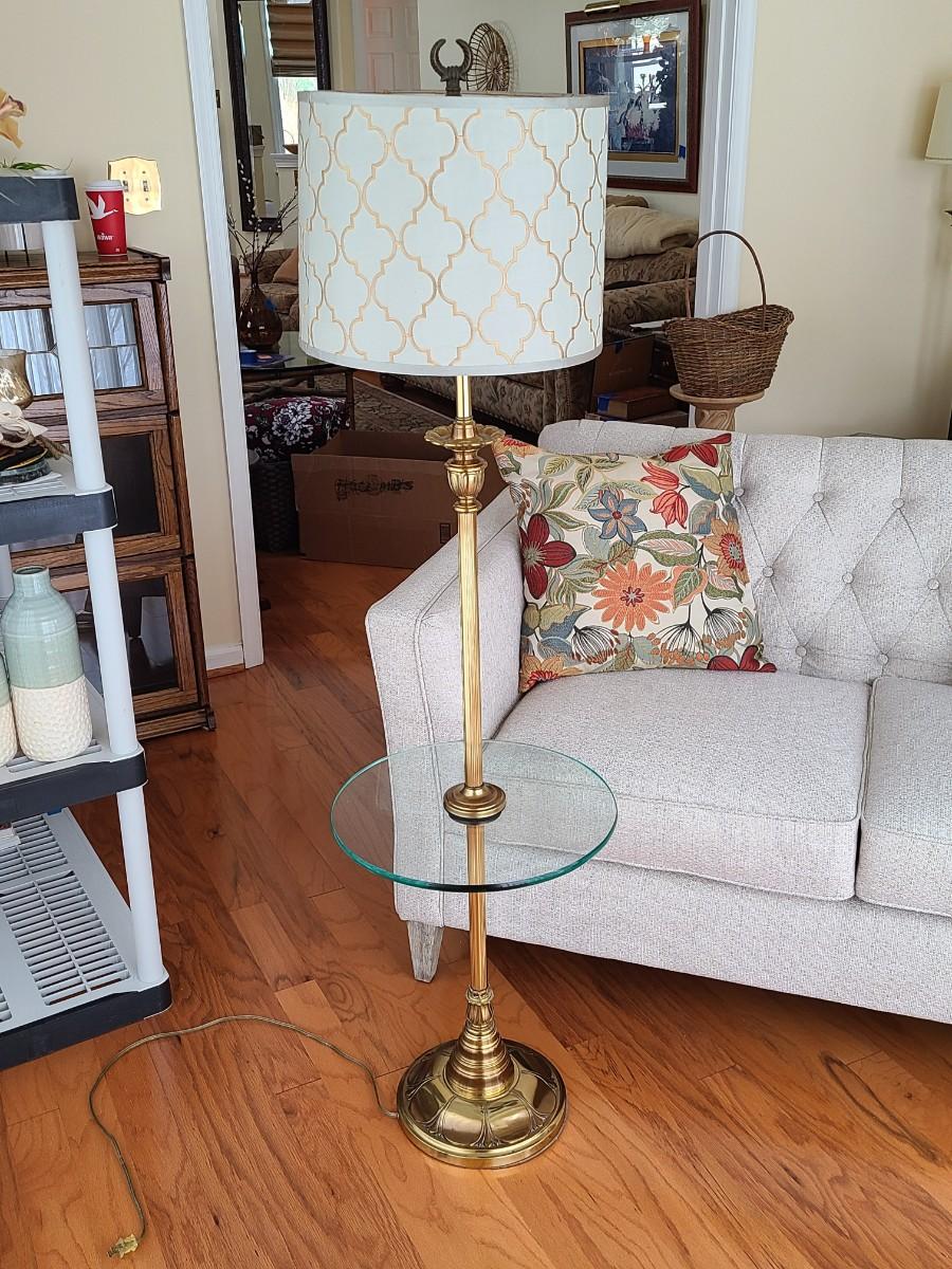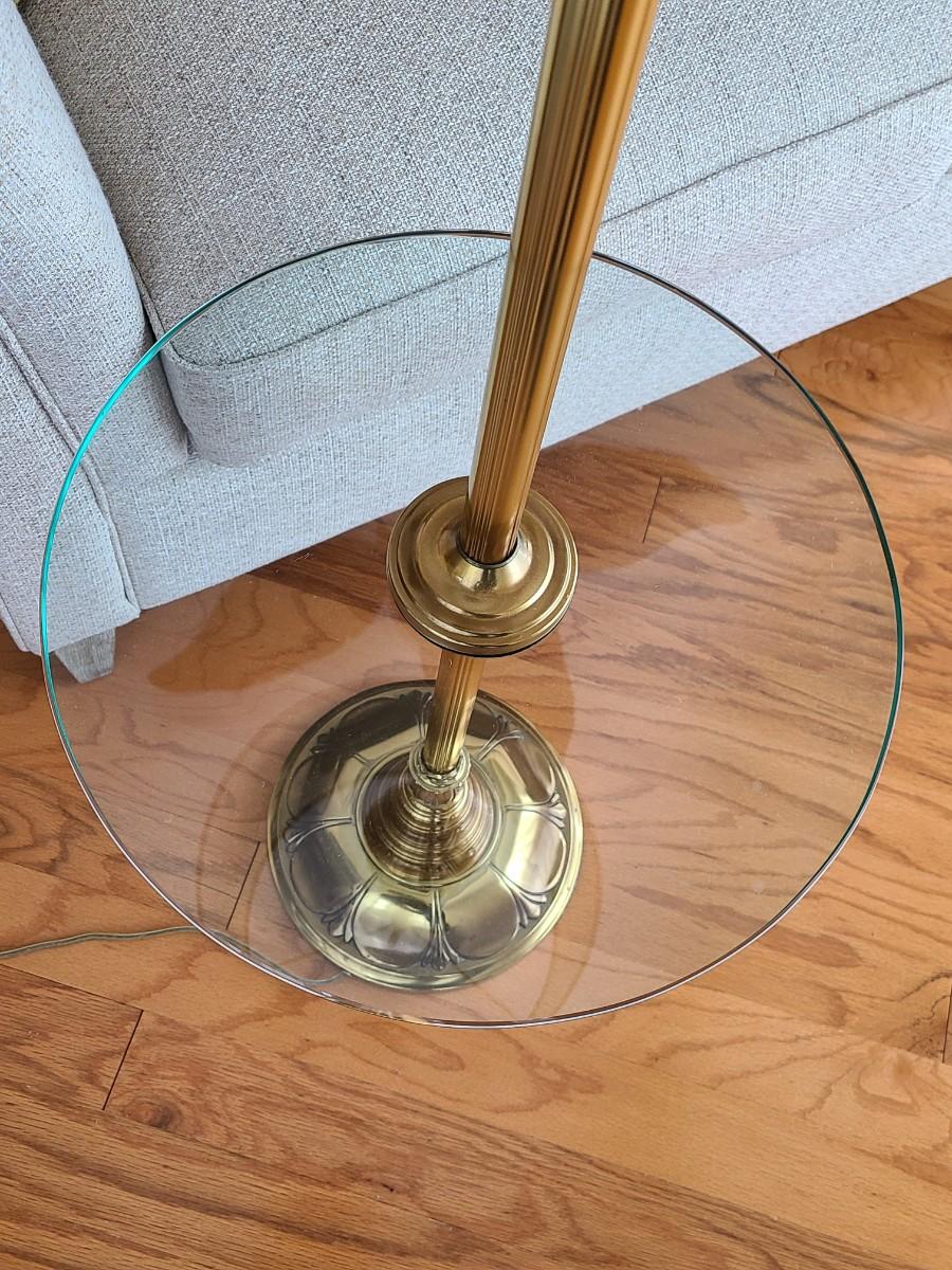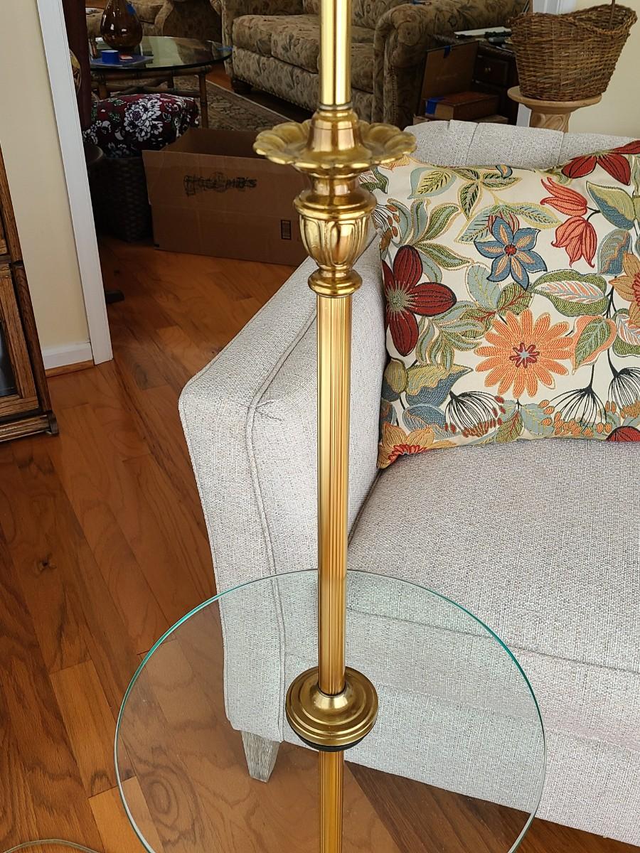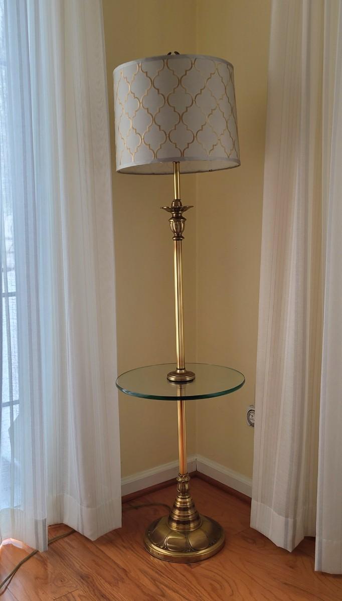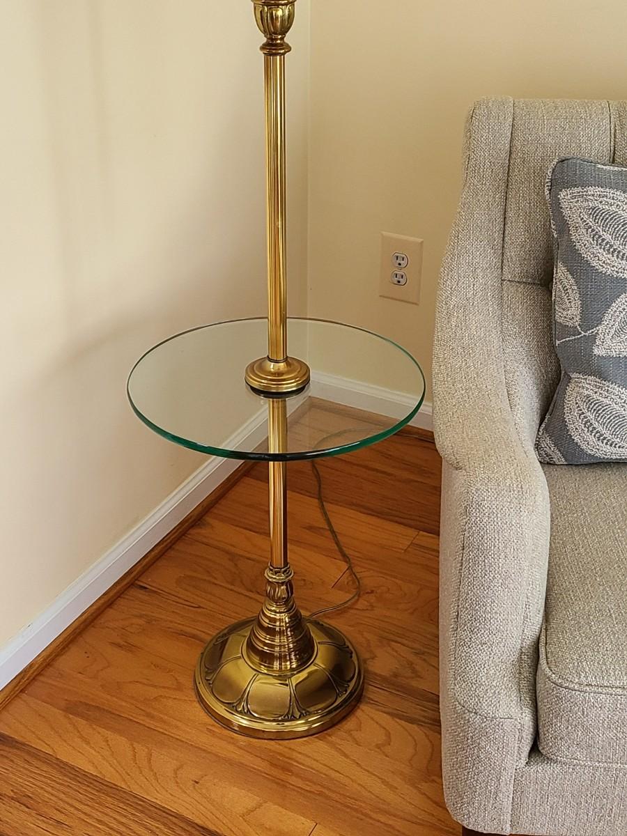 5 feet tall, and glass is 16 inches across. This is heavy like brass, but is not marked. This lamp is gorgeous! Please see all pictures as they are the best representation of the items. The pictures show condition, measurements if taken, and what is included in the lot. Due to the large amount that we photograph and the time frame, we are not always able to take measurements. All items unless noted, are pre-owned and have been used. If you purchased furniture, you must bring help. We do not allow one person to carry large furniture out on their own. Bring help, tools and a truck for the safety of our client’s homes, and your personal safety. Any damages that result to the property including walls, and floors due to moving of the furniture will be charged to the buyer. Company policy. Thank you.