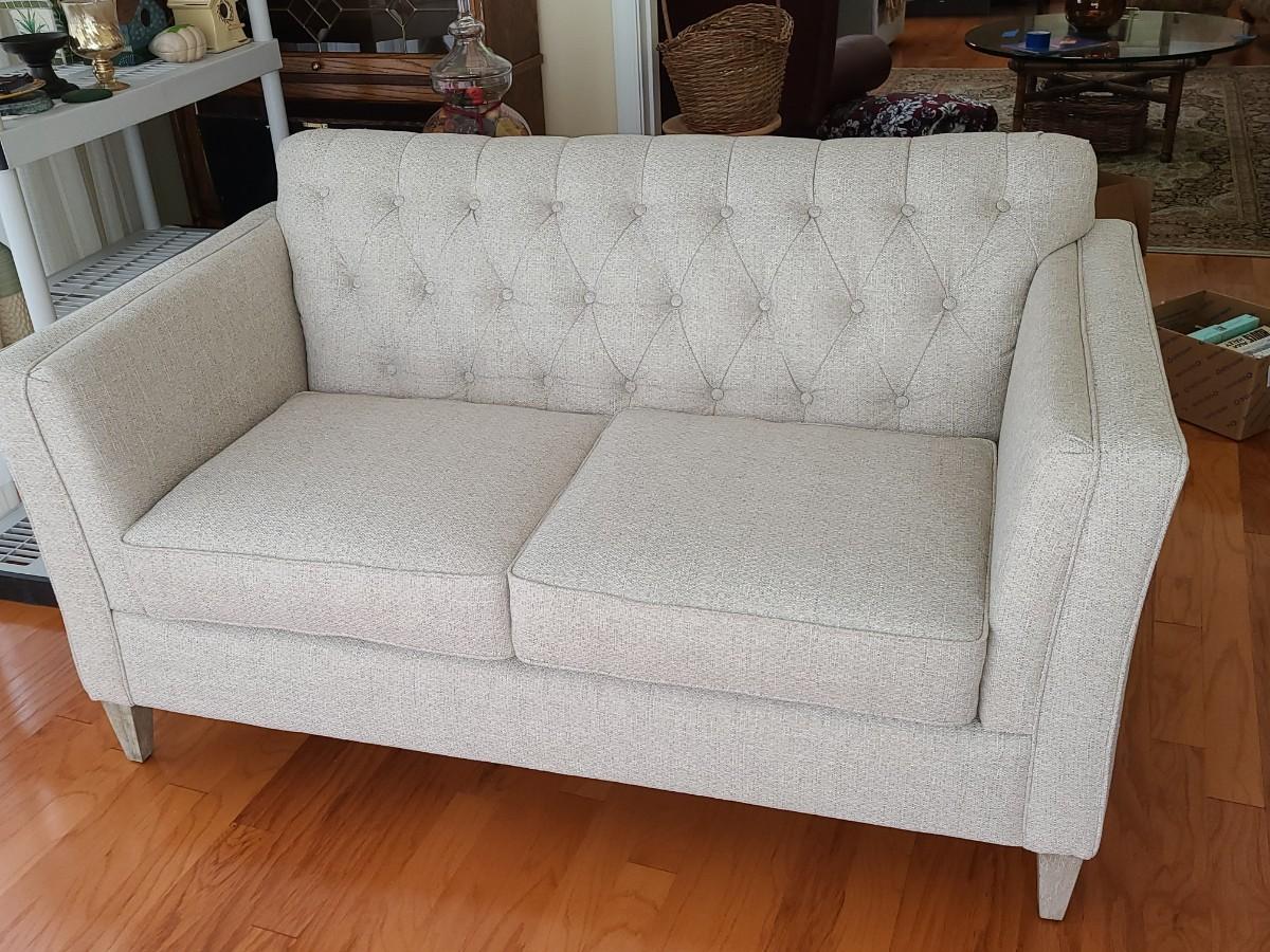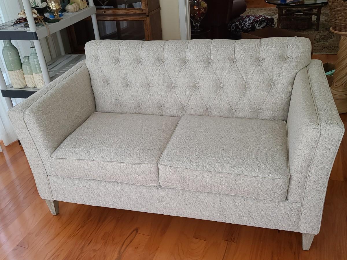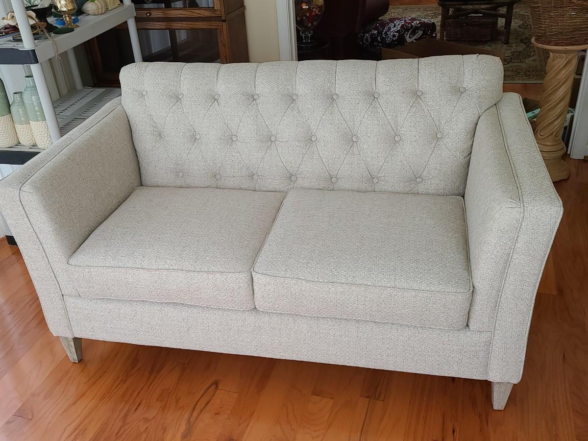 33 inches deep, 5 foot long, and 36 inches high. This piece is gorgeous. It has the weathered wood leg look with a soft beige. It can be changed to any decor or season with throw pillows. Was used in a side room for decor, and still looks new! Please see all pictures as they are the best representation of the items. The pictures show condition, measurements if taken, and what is included in the lot. Due to the large amount that we photograph and the time frame, we are not always able to take measurements. All items unless noted, are pre-owned and have been used. If you purchased furniture, you must bring help. We do not allow one person to carry large furniture out on their own. Bring help, tools and a truck for the safety of our client’s homes, and your personal safety. Any damages that result to the property including walls, and floors due to moving of the furniture will be charged to the buyer. Company policy. Thank you.