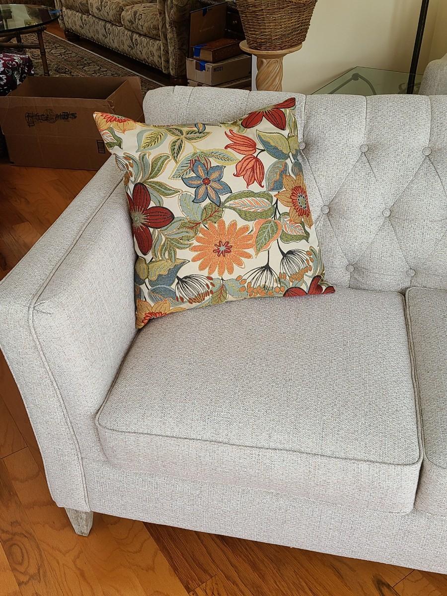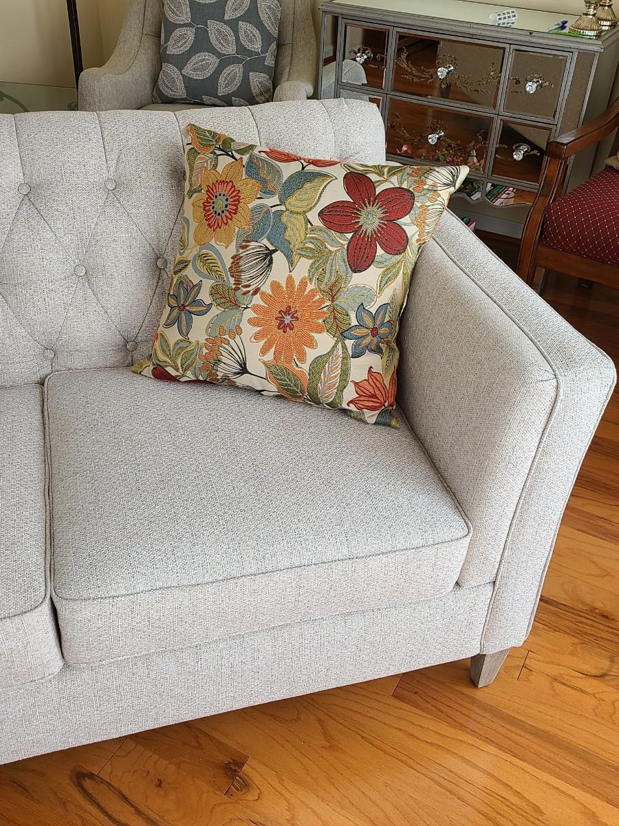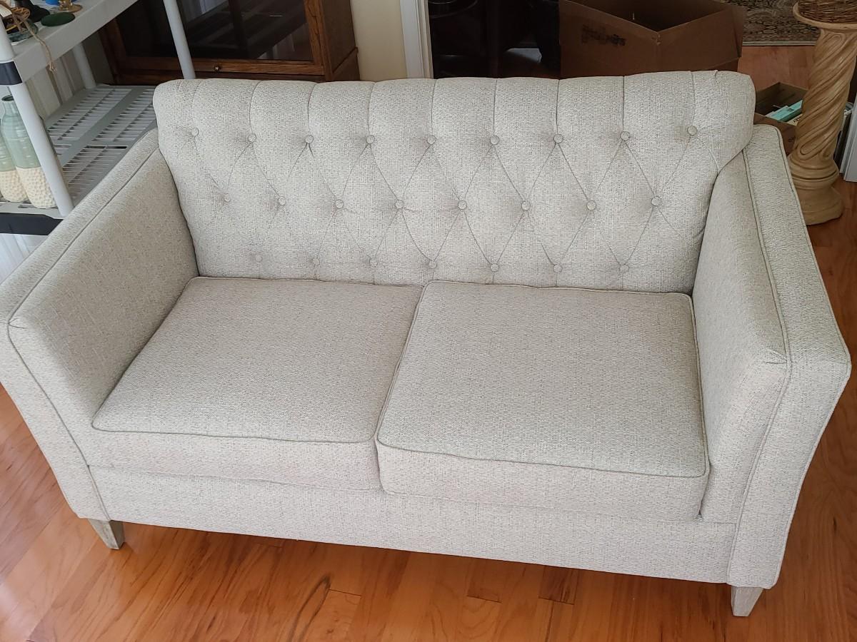 33 inches deep, 5 foot long, and 36 inches high. This piece is gorgeous. It has the weathered wood leg look with a soft beige. It can be changed to any decor or season with throw pillows. Was used in a side room for decor, and still looks new! Please see all pictures as they are the best representation of the items. The pictures show condition, measurements if taken, and what is included in the lot. Due to the large amount that we photograph and the time frame, we are not always able to take measurements. All items unless noted, are pre-owned and have been used. If you purchased furniture, you must bring help. We do not allow one person to carry large furniture out on their own. Bring help, tools and a truck for the safety of our client’s homes, and your personal safety. Any damages that result to the property including walls, and floors due to moving of the furniture will be charged to the buyer. Company policy. Thank you.