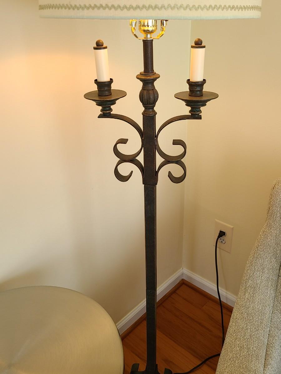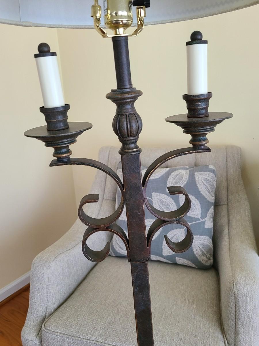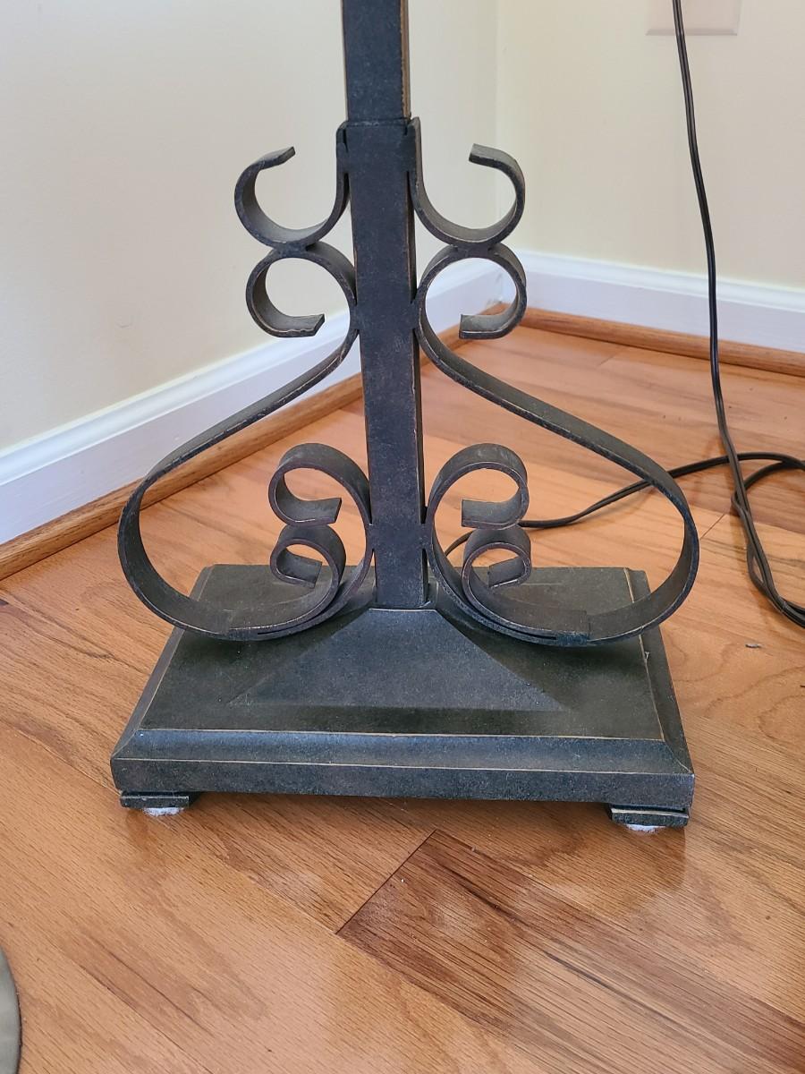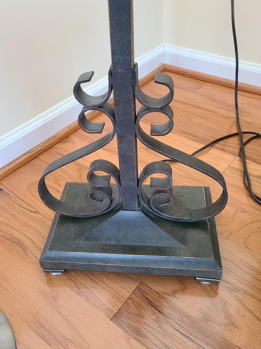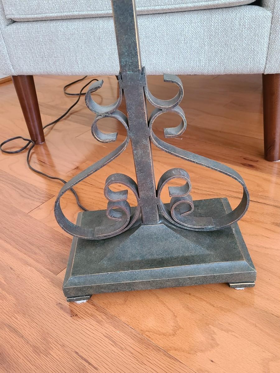 This lot is for the floor lamp only. Lovely metal floor lamp, bronze in color. This is a modern home piece designed to look older. Does have weight to it, but not cast iron. 63 inches tall. Please see all pictures as they are the best representation of the items. The pictures show condition, measurements if taken, and what is included in the lot. Due to the large amount that we photograph and the time frame, we are not always able to take measurements. All items unless noted, are pre-owned and have been used. If you purchased furniture, you must bring help. We do not allow one person to carry large furniture out on their own. Bring help, tools and a truck for the safety of our client’s homes, and your personal safety. Any damages that result to the property including walls, and floors due to moving of the furniture will be charged to the buyer. Company policy. Thank you.