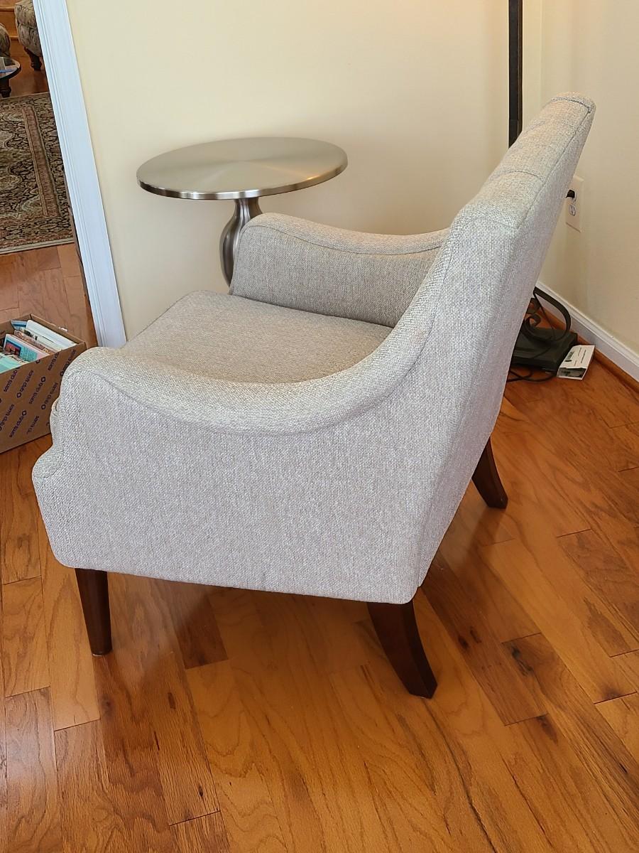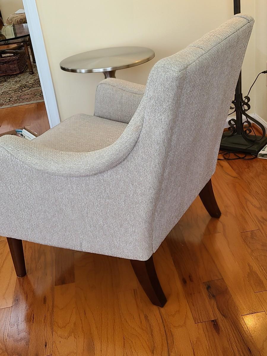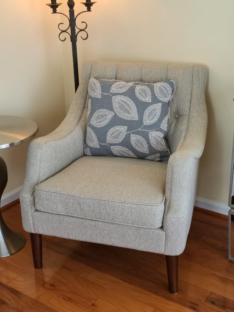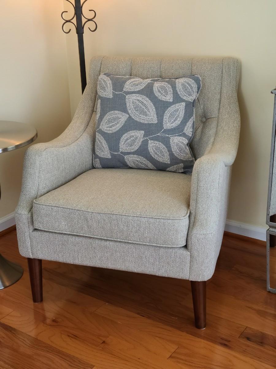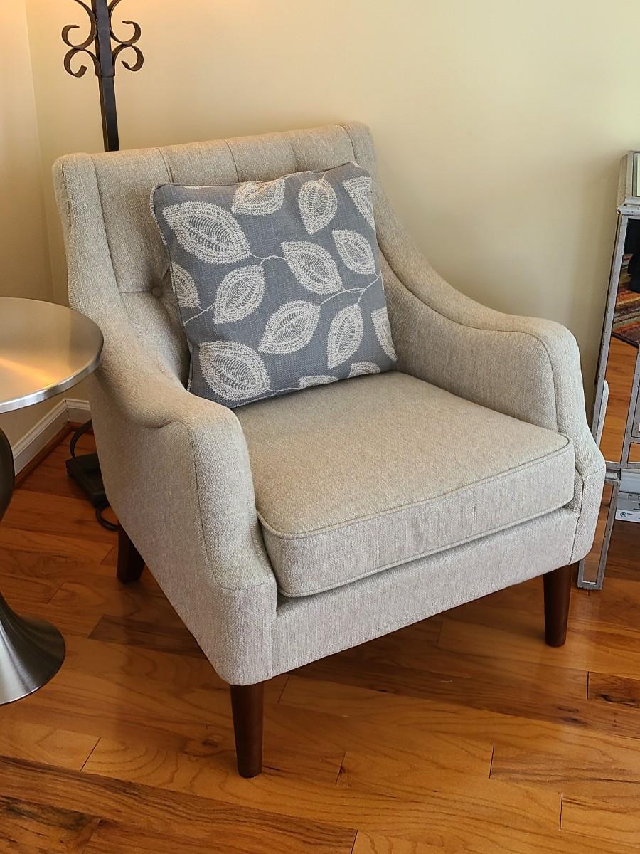 29.5x32x34.5 inches tall. This chair still looks new as it was only used in a sitting room. Modern home piece, with accent pillow included. This is online now for $350 with shipping. Please see all pictures as they are the best representation of the items. The pictures show condition, measurements if taken, and what is included in the lot. Due to the large amount that we photograph and the time frame, we are not always able to take measurements. All items unless noted, are pre-owned and have been used. If you purchased furniture, you must bring help. We do not allow one person to carry large furniture out on their own. Bring help, tools and a truck for the safety of our client’s homes, and your personal safety. Any damages that result to the property including walls, and floors due to moving of the furniture will be charged to the buyer. Company policy. Thank you.
