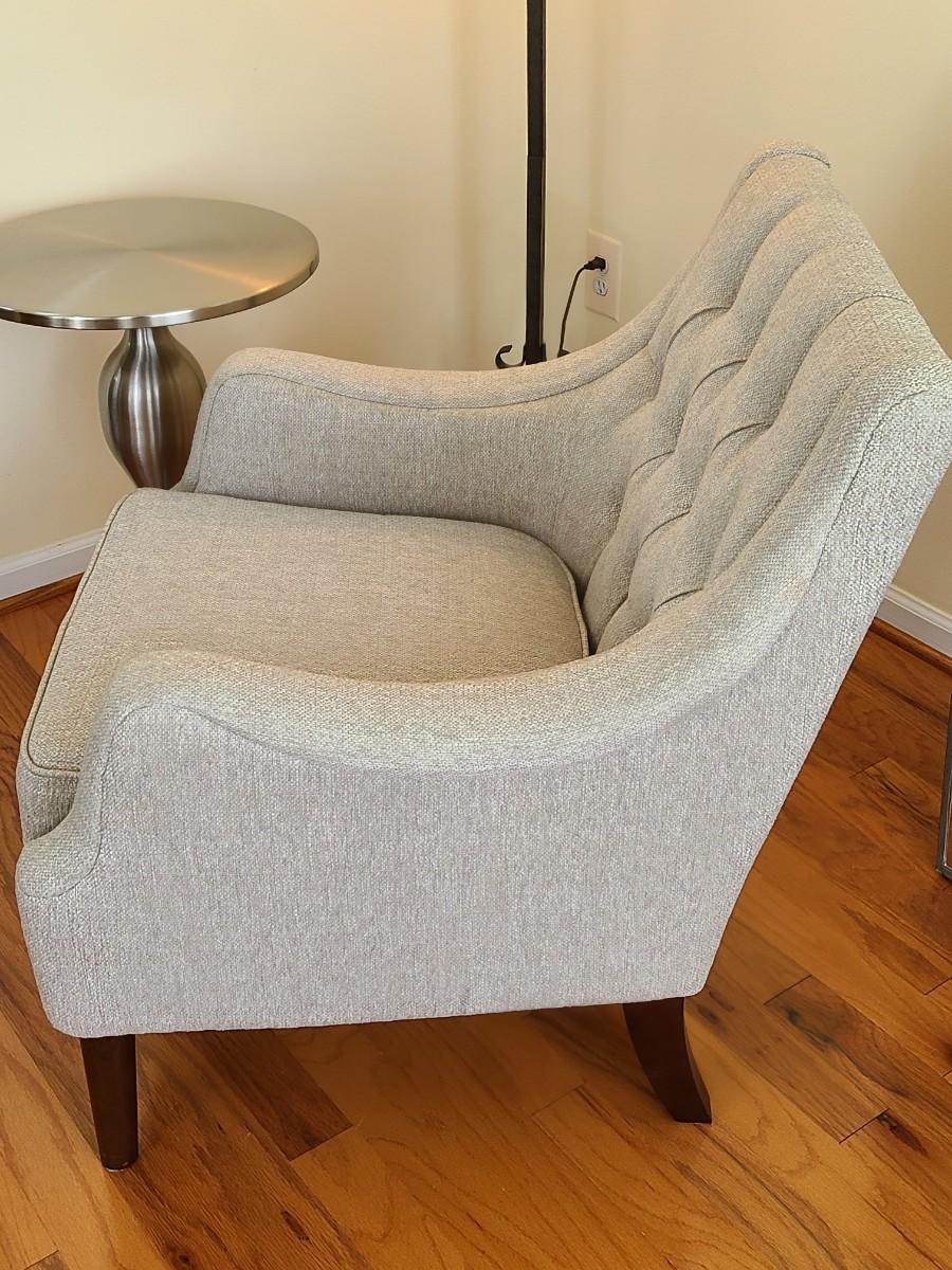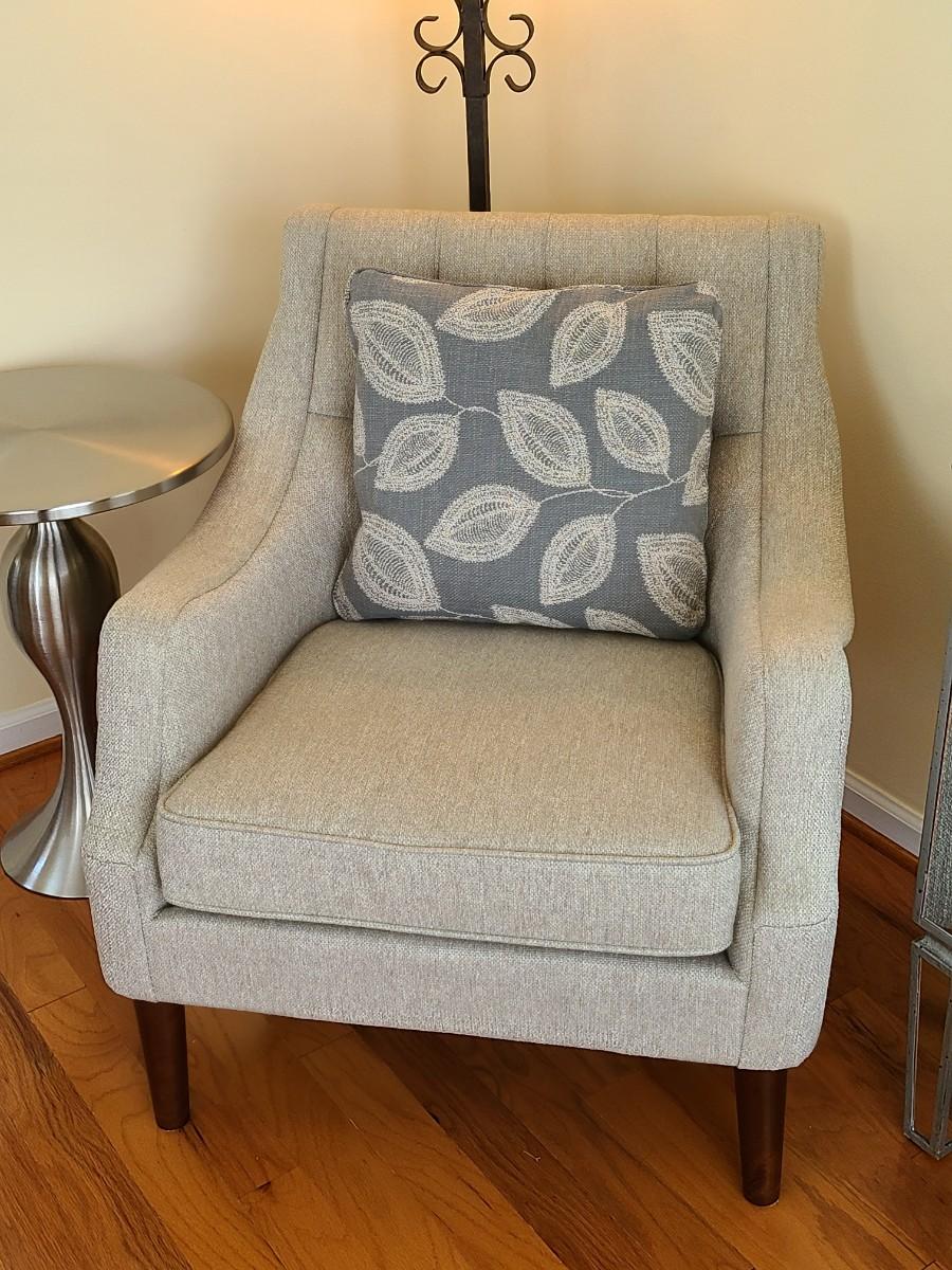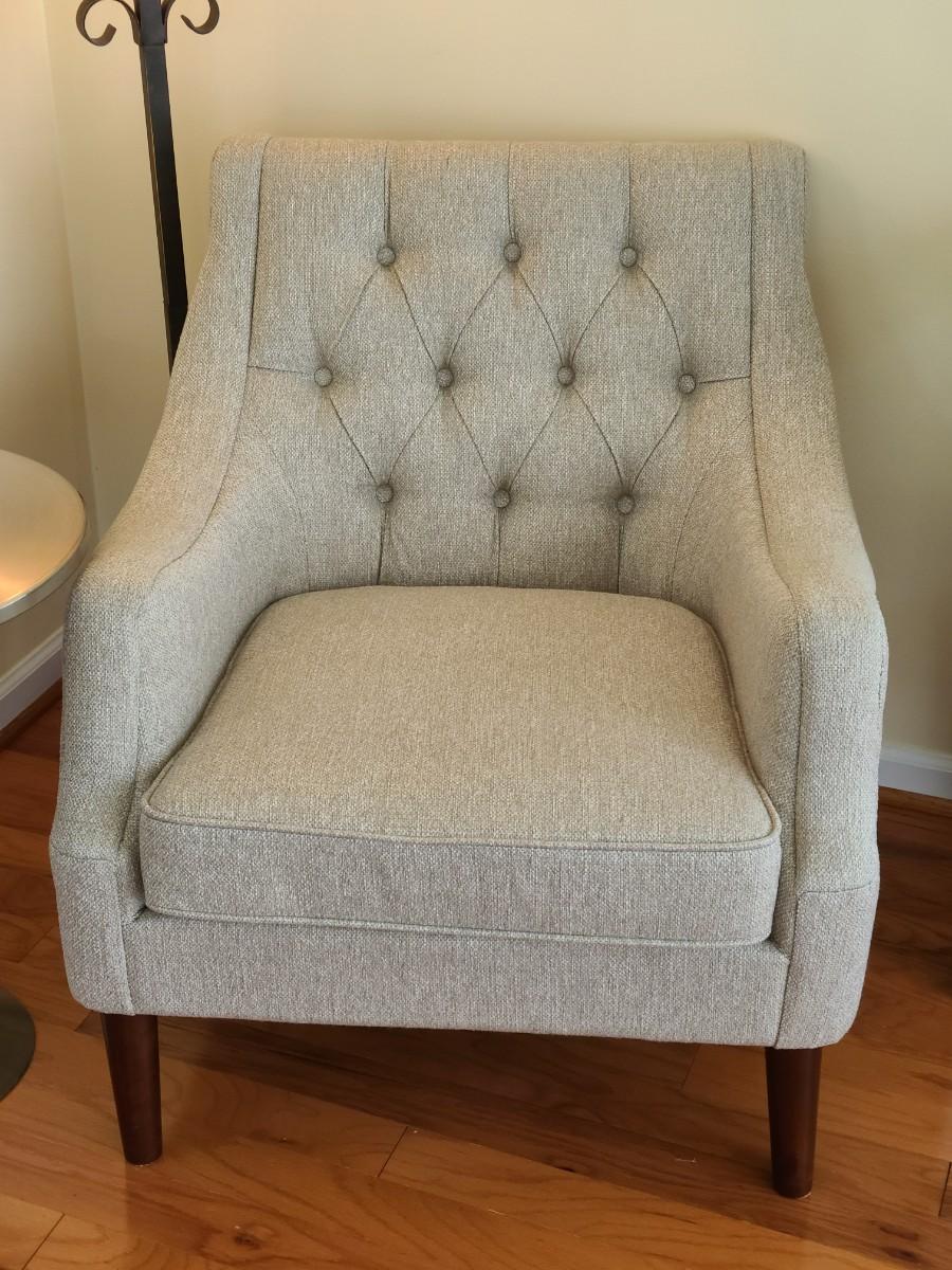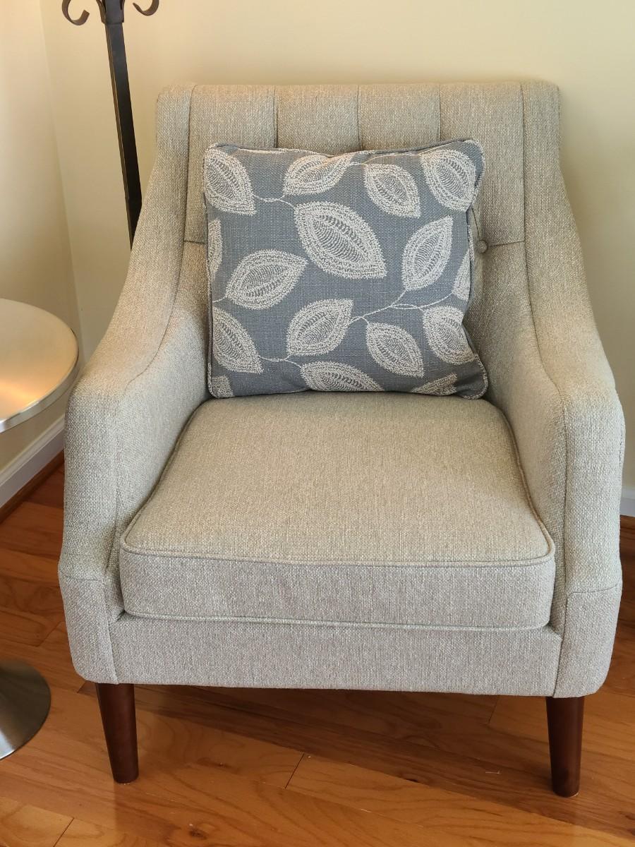 29.5x32x34.5 inches tall. This chair still looks new as it was only used in a sitting room. Modern home piece, with accent pillow included. This is online now for $350 with shipping. Please see all pictures as they are the best representation of the items. The pictures show condition, measurements if taken, and what is included in the lot. Due to the large amount that we photograph and the time frame, we are not always able to take measurements. All items unless noted, are pre-owned and have been used. If you purchased furniture, you must bring help. We do not allow one person to carry large furniture out on their own. Bring help, tools and a truck for the safety of our client’s homes, and your personal safety. Any damages that result to the property including walls, and floors due to moving of the furniture will be charged to the buyer. Company policy. Thank you.