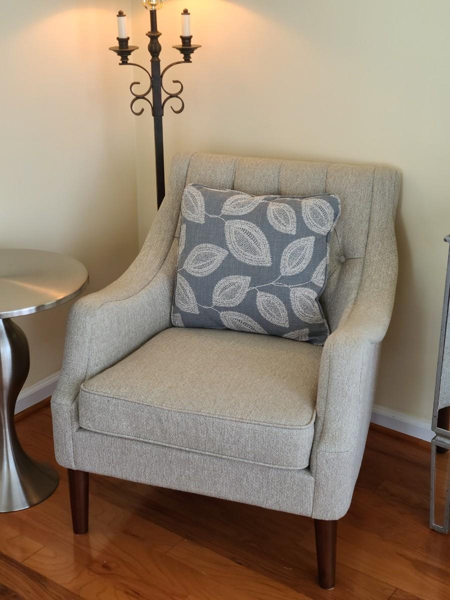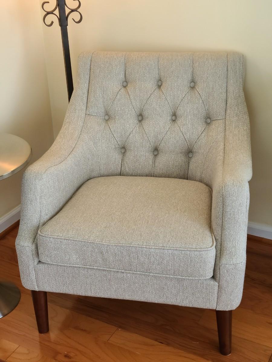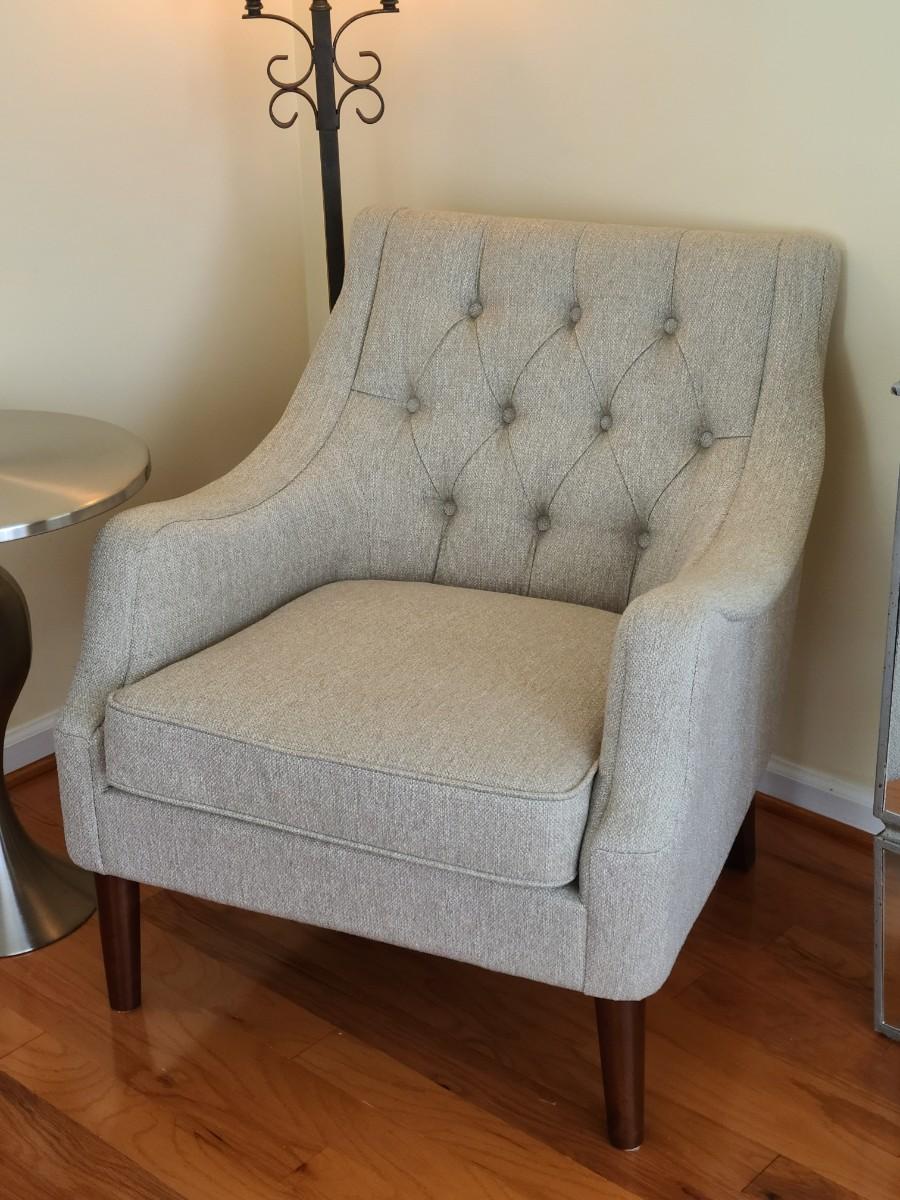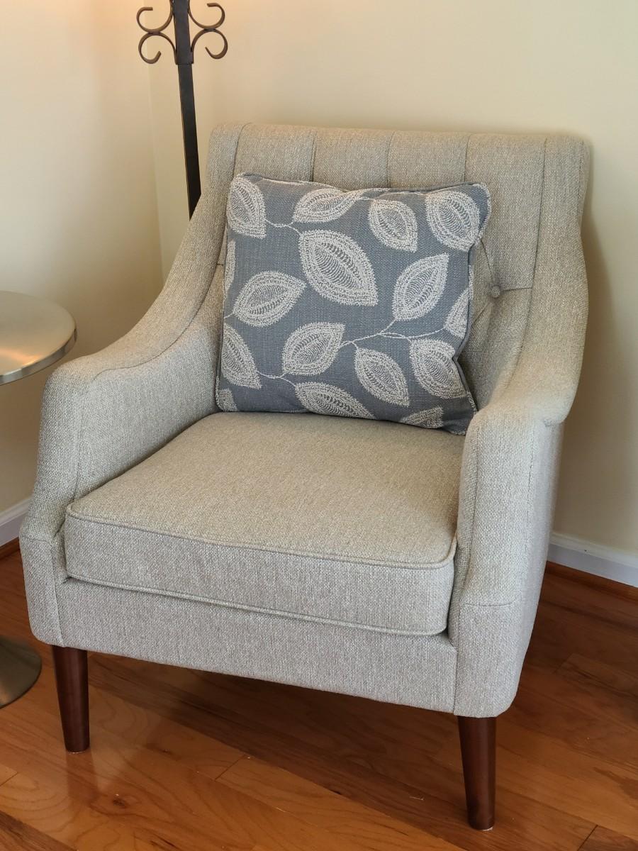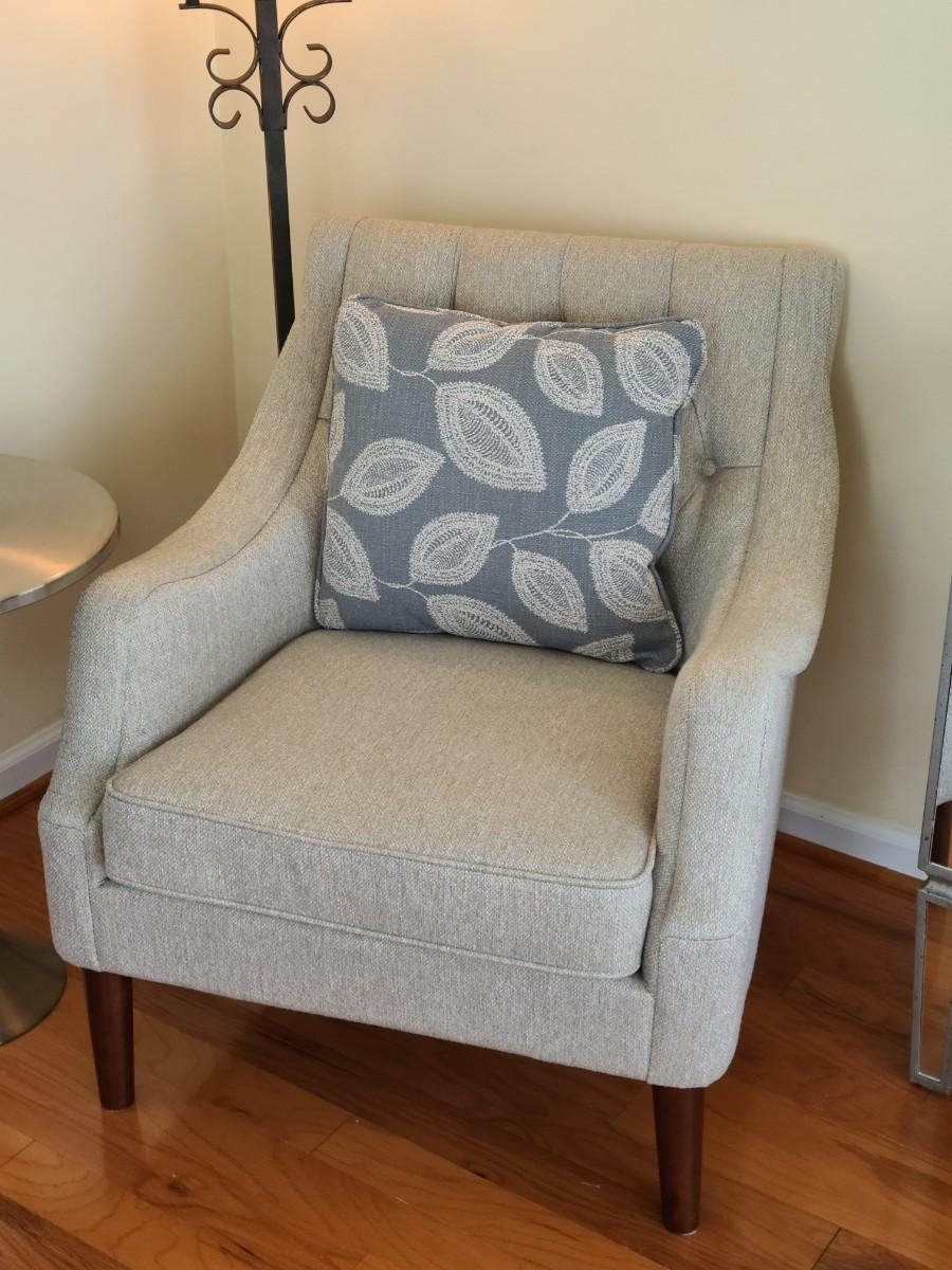 29.5x32x34.5 inches tall. This chair still looks new as it was only used in a sitting room. Modern home piece, with accent pillow included. This is online now for $350 with shipping. Please see all pictures as they are the best representation of the items. The pictures show condition, measurements if taken, and what is included in the lot. Due to the large amount that we photograph and the time frame, we are not always able to take measurements. All items unless noted, are pre-owned and have been used. If you purchased furniture, you must bring help. We do not allow one person to carry large furniture out on their own. Bring help, tools and a truck for the safety of our client’s homes, and your personal safety. Any damages that result to the property including walls, and floors due to moving of the furniture will be charged to the buyer. Company policy. Thank you.