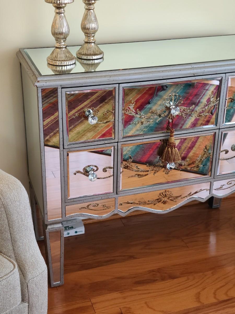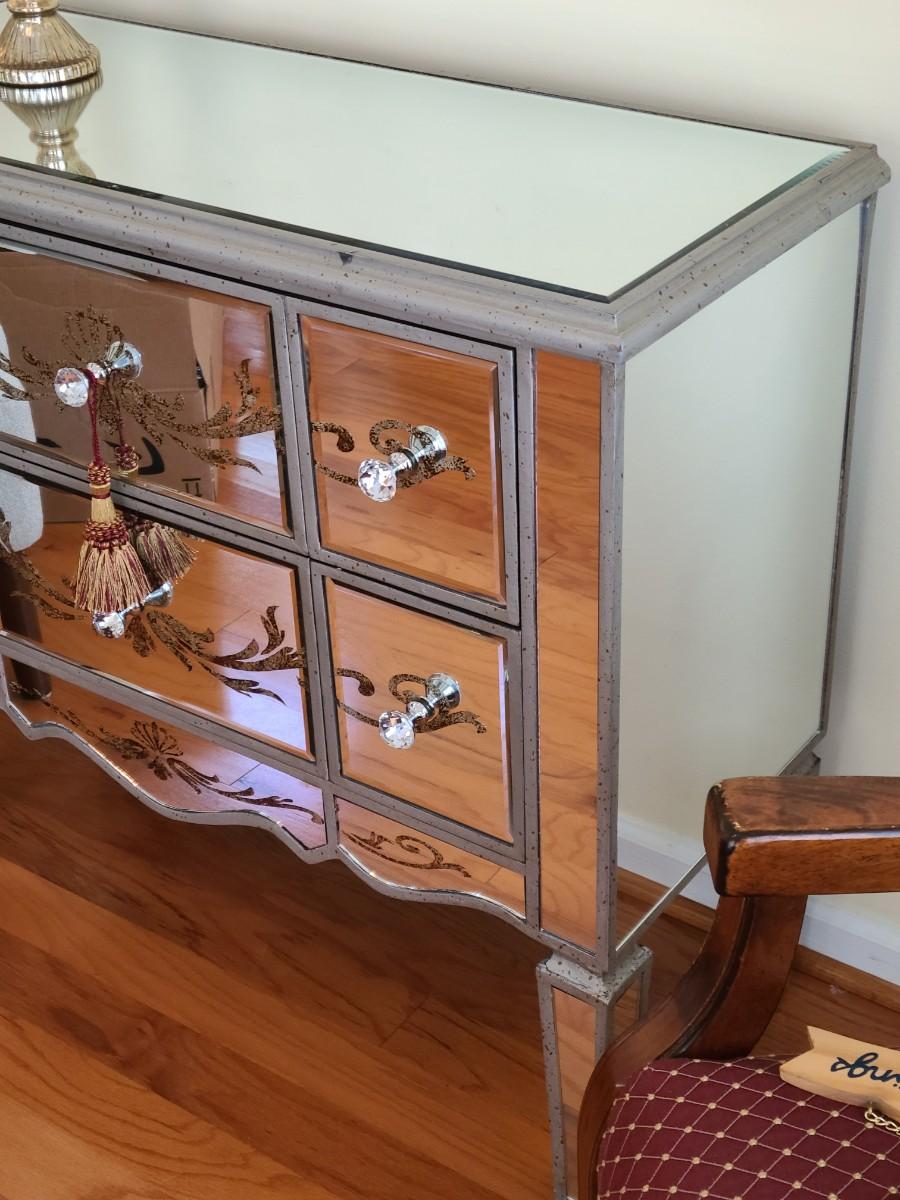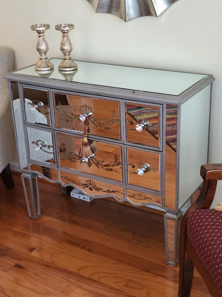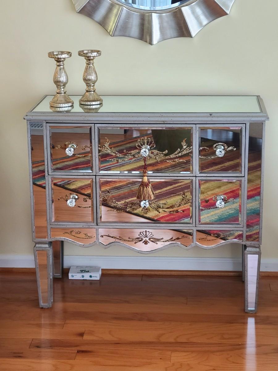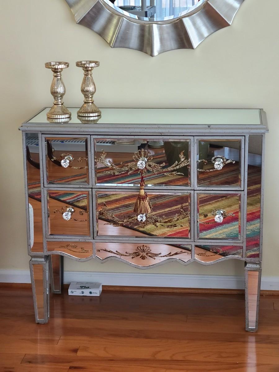 36x14.5x32 inches tall. Lovely small mirrored chest perfect as entryway table or accent table in any room! Comes with the two mercury glass candlesticks. Please see all pictures as they are the best representation of the items. The pictures show condition, measurements if taken, and what is included in the lot. Due to the large amount that we photograph and the time frame, we are not always able to take measurements. All items unless noted, are pre-owned and have been used. If you purchased furniture, you must bring help. We do not allow one person to carry large furniture out on their own. Bring help, tools and a truck for the safety of our client’s homes, and your personal safety. Any damages that result to the property including walls, and floors due to moving of the furniture will be charged to the buyer. Company policy. Thank you.