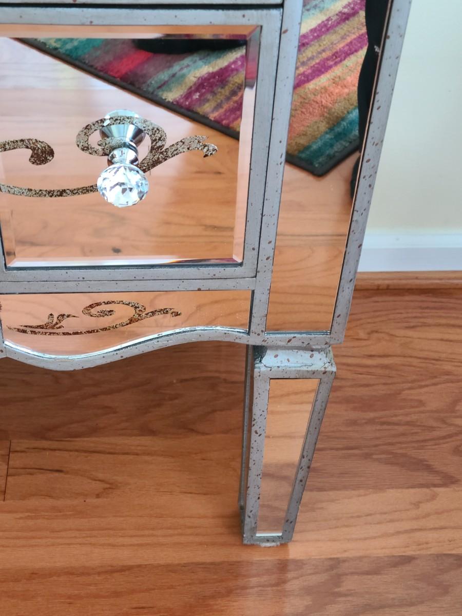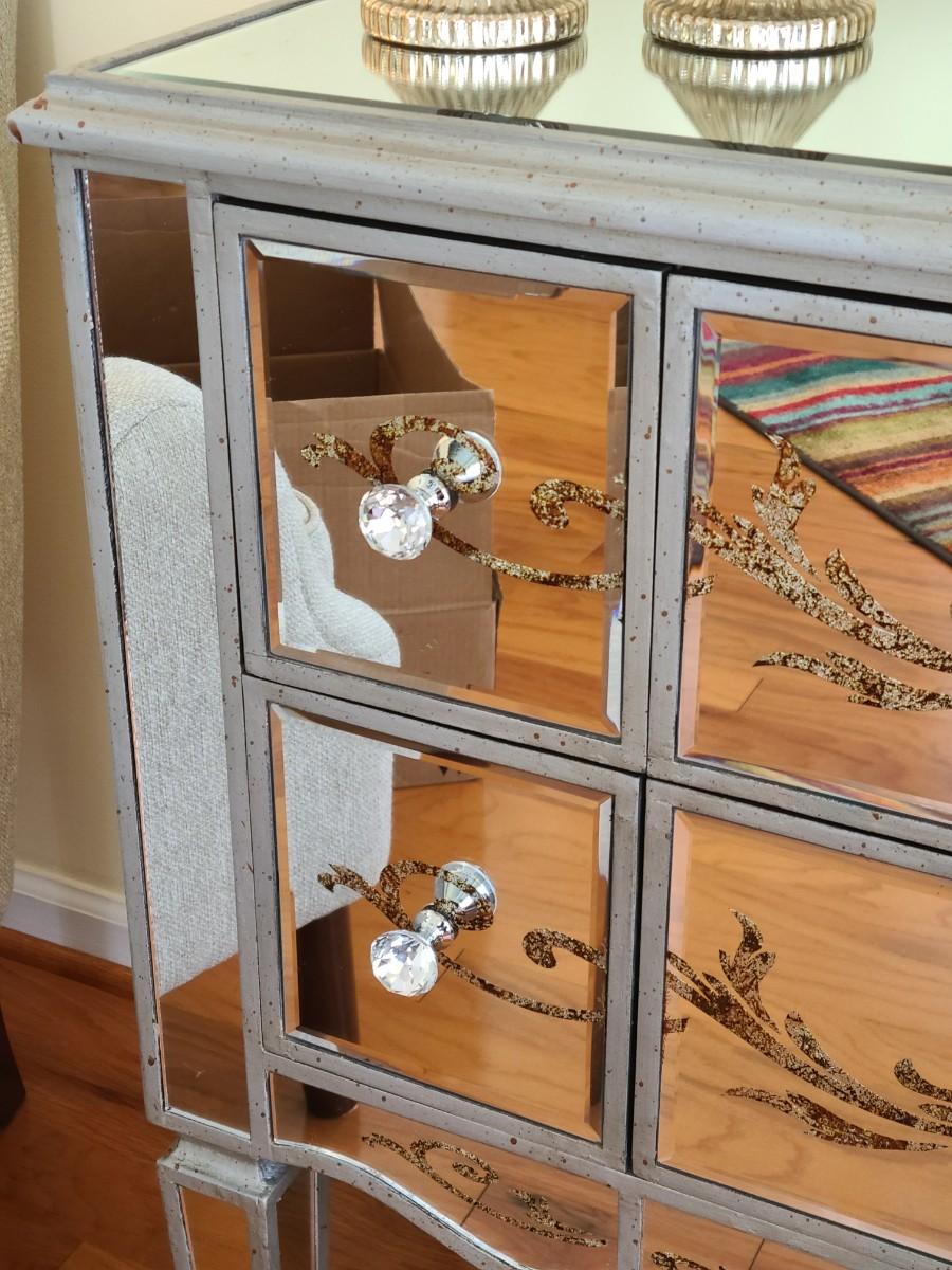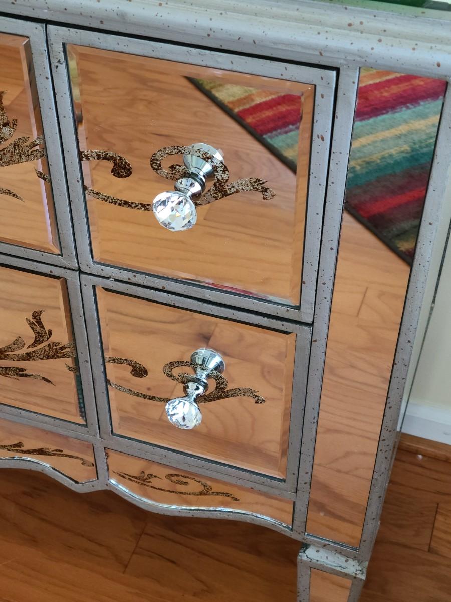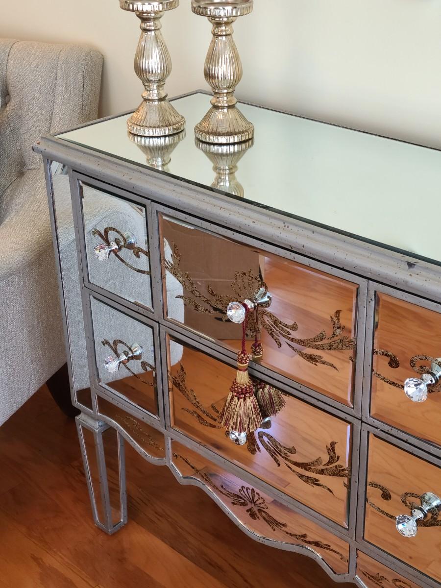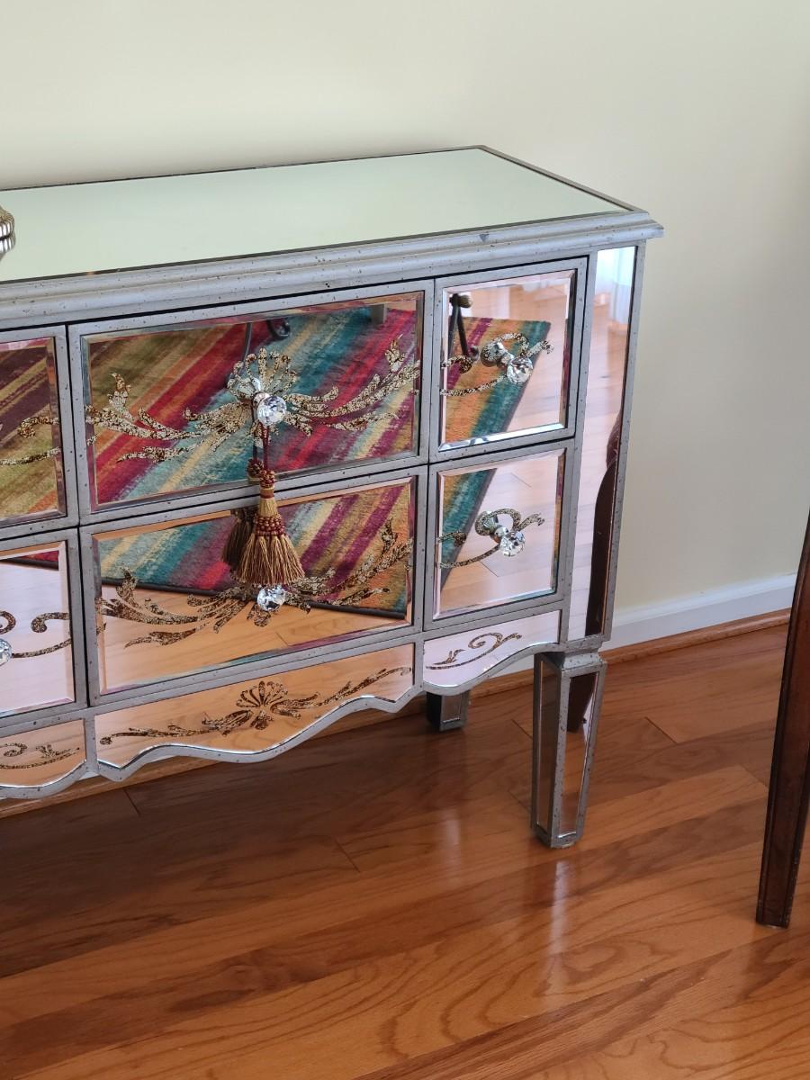 36x14.5x32 inches tall. Lovely small mirrored chest perfect as entryway table or accent table in any room! Comes with the two mercury glass candlesticks. Please see all pictures as they are the best representation of the items. The pictures show condition, measurements if taken, and what is included in the lot. Due to the large amount that we photograph and the time frame, we are not always able to take measurements. All items unless noted, are pre-owned and have been used. If you purchased furniture, you must bring help. We do not allow one person to carry large furniture out on their own. Bring help, tools and a truck for the safety of our client’s homes, and your personal safety. Any damages that result to the property including walls, and floors due to moving of the furniture will be charged to the buyer. Company policy. Thank you.