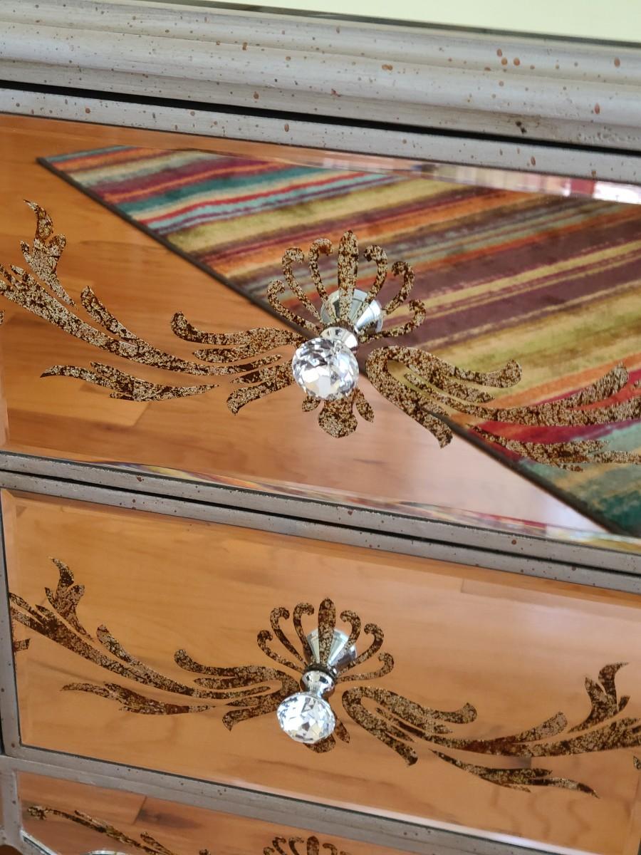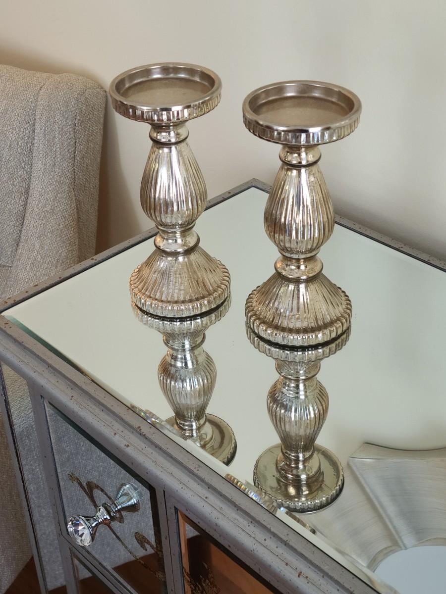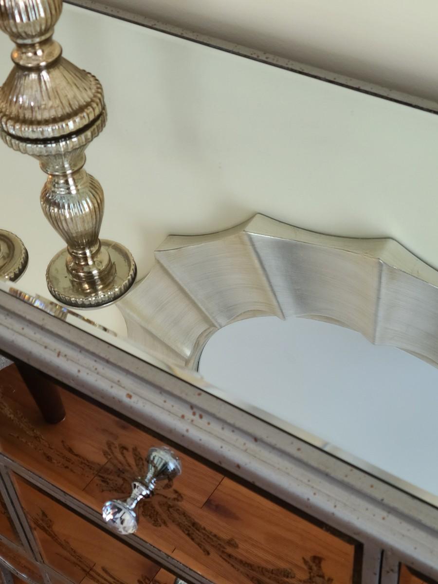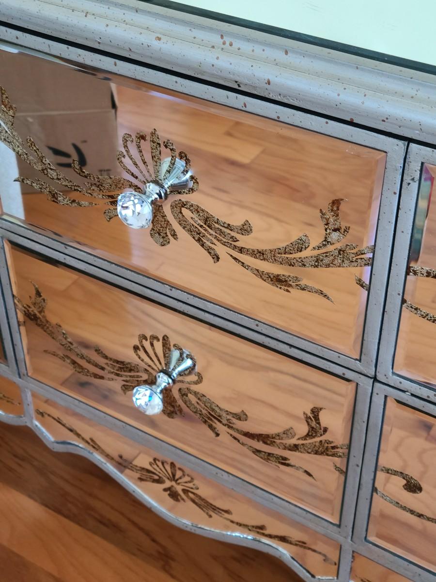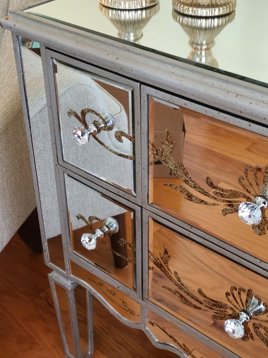 36x14.5x32 inches tall. Lovely small mirrored chest perfect as entryway table or accent table in any room! Comes with the two mercury glass candlesticks. Please see all pictures as they are the best representation of the items. The pictures show condition, measurements if taken, and what is included in the lot. Due to the large amount that we photograph and the time frame, we are not always able to take measurements. All items unless noted, are pre-owned and have been used. If you purchased furniture, you must bring help. We do not allow one person to carry large furniture out on their own. Bring help, tools and a truck for the safety of our client’s homes, and your personal safety. Any damages that result to the property including walls, and floors due to moving of the furniture will be charged to the buyer. Company policy. Thank you.