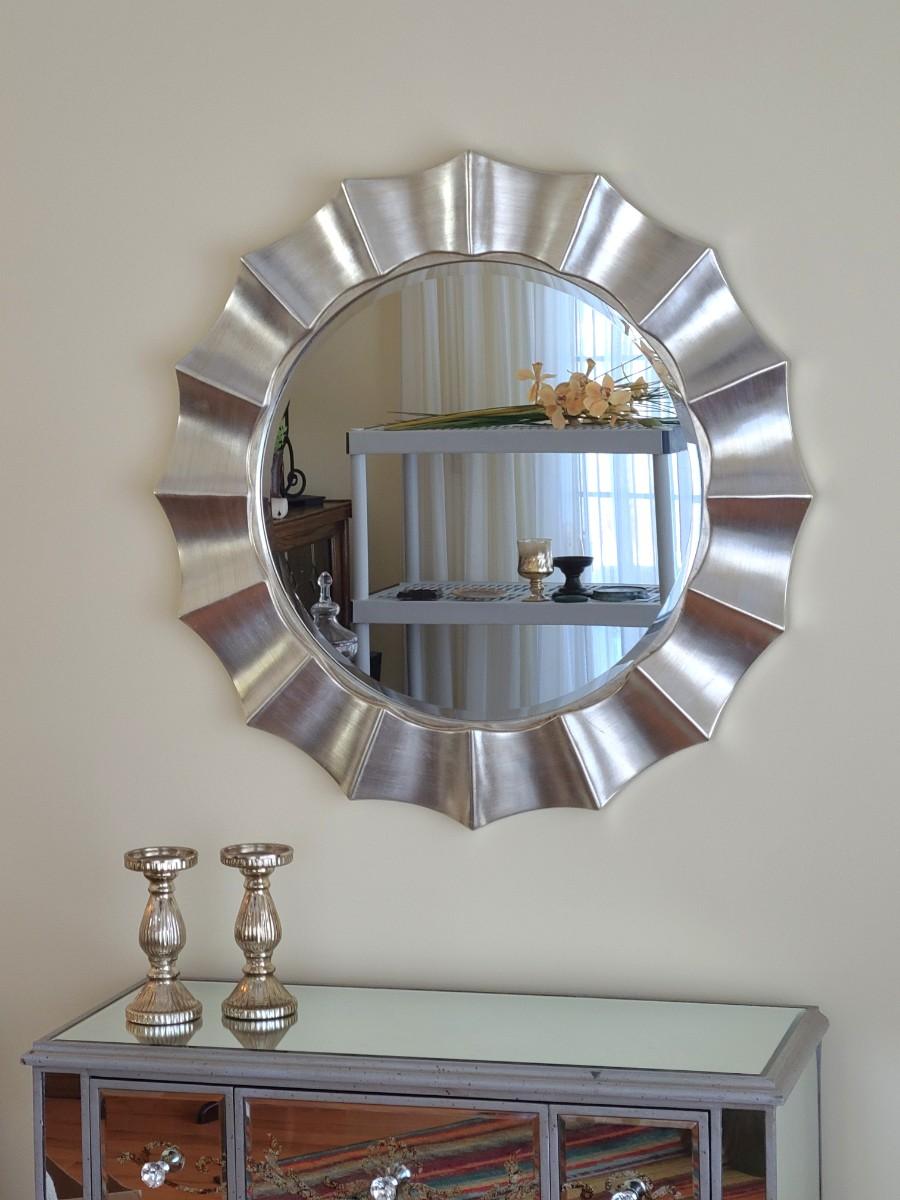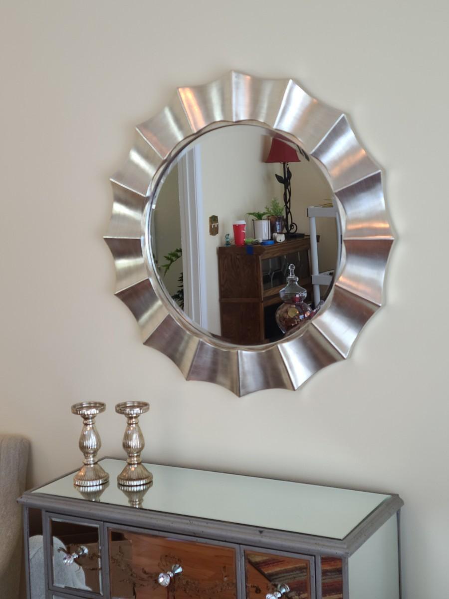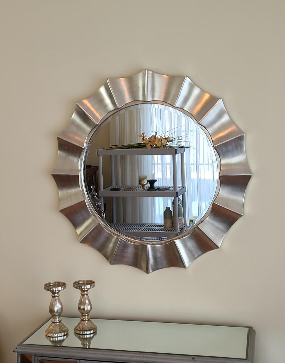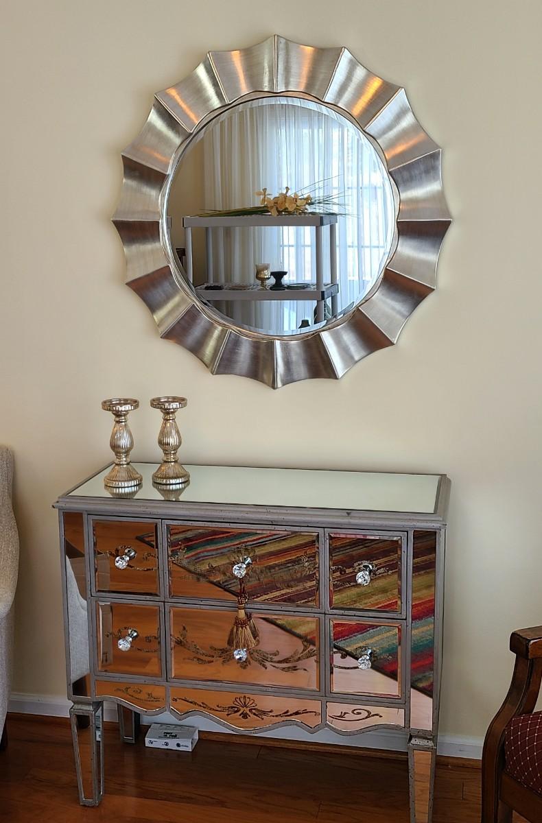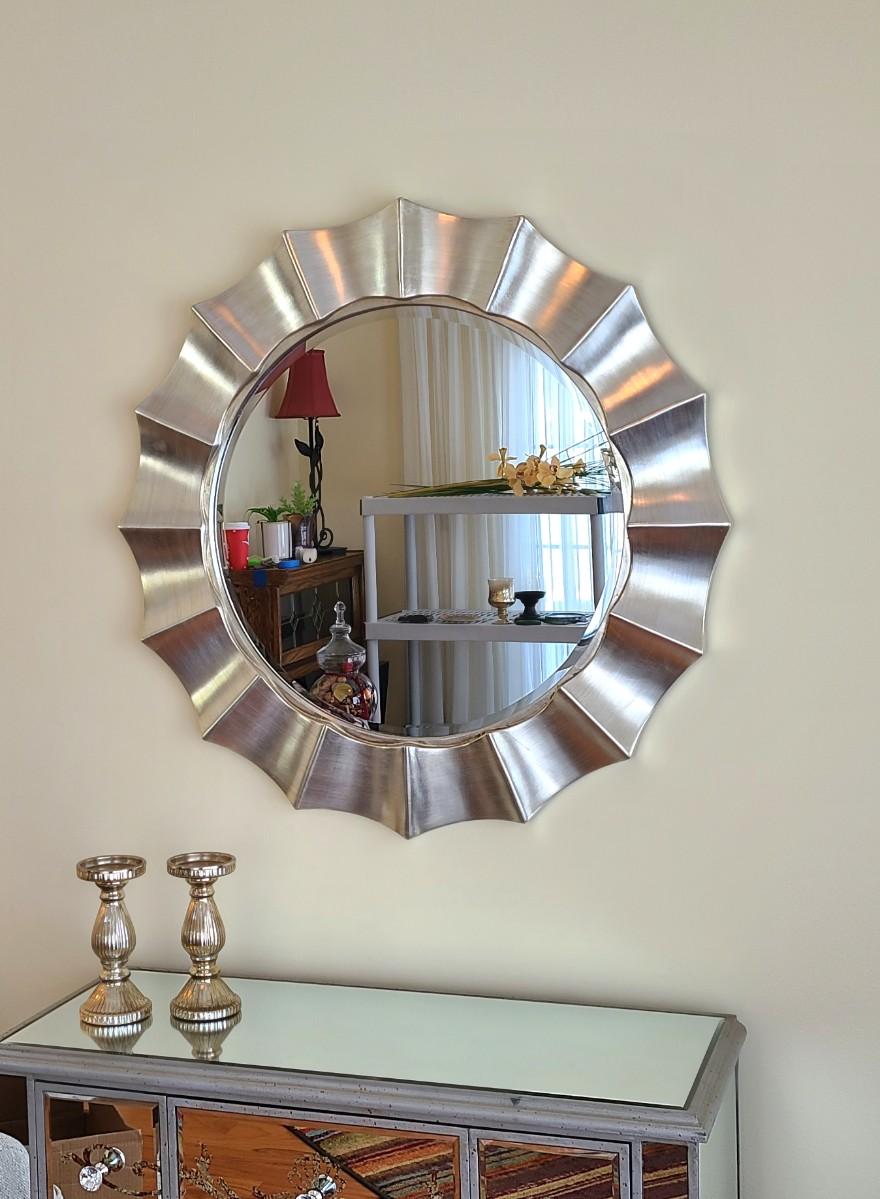 34x34 inches across. Nice lightweight modern mirror. Perfect in any room of the home! Please see all pictures as they are the best representation of the items. The pictures show condition, measurements if taken, and what is included in the lot. Due to the large amount that we photograph and the time frame, we are not always able to take measurements. All items unless noted, are pre-owned and have been used. If you purchased furniture, you must bring help. We do not allow one person to carry large furniture out on their own. Bring help, tools and a truck for the safety of our client’s homes, and your personal safety. Any damages that result to the property including walls, and floors due to moving of the furniture will be charged to the buyer. Company policy. Thank you.