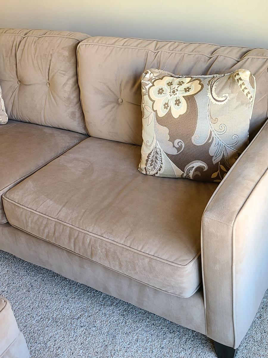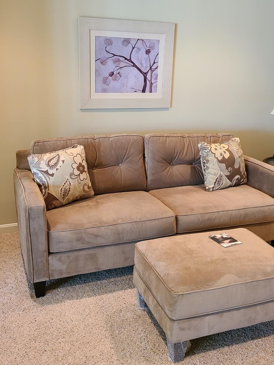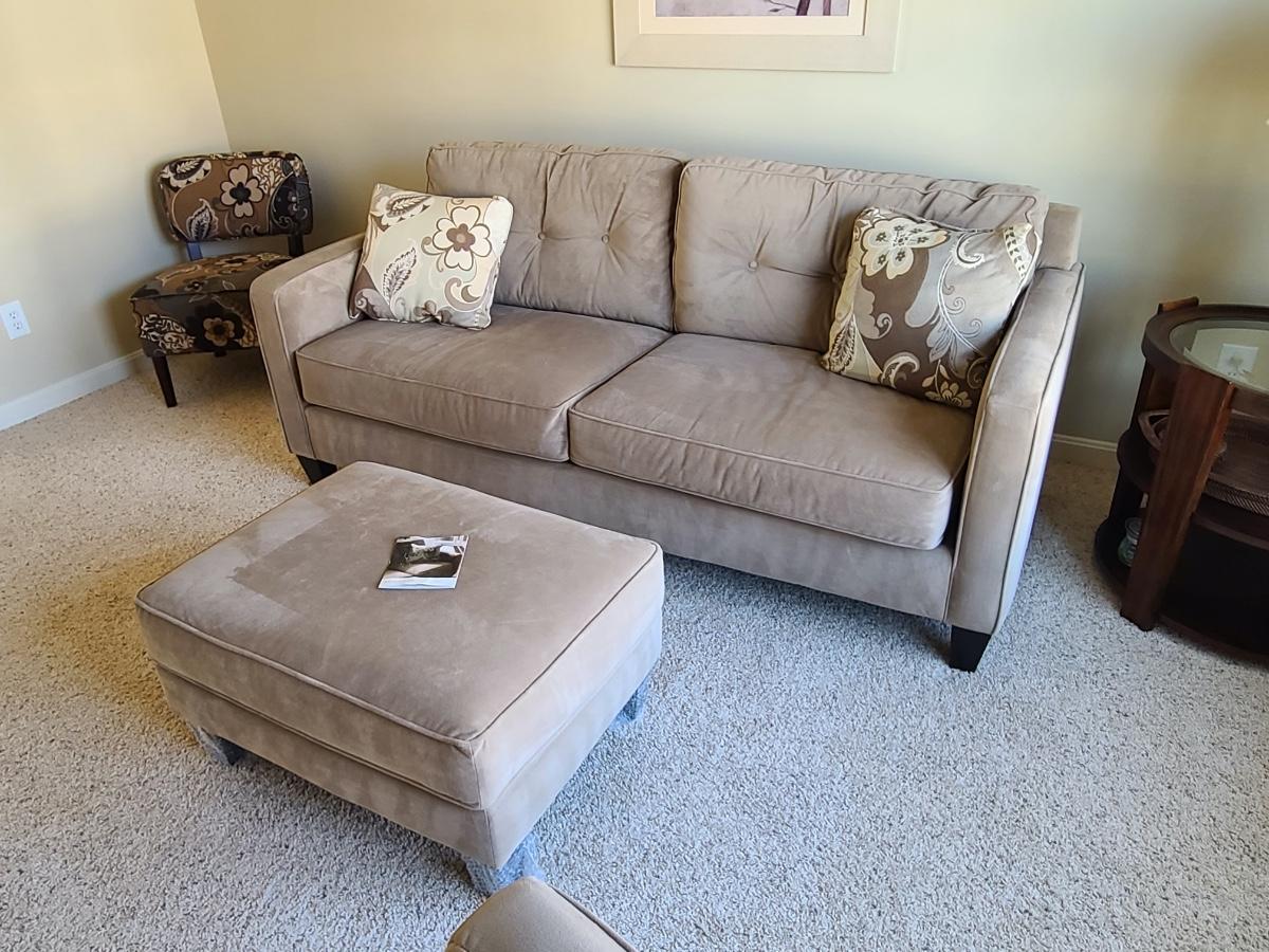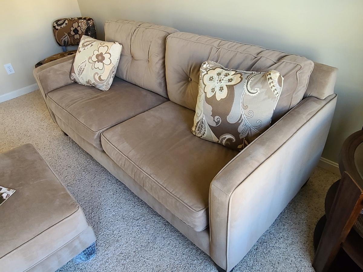 This set is still like new. It was displayed in a loft of a single person's home. Still has original card from purchase with details. This is a soft brown coffee color microfiber (easy to clean) couch. So soft and comfortable! Excellent chance to refurnish at a fraction of the cost! This is for the couch/pillows and matching ottoman only. The pictures show condition, measurements if taken, and what is included in the lot. Due to the large amount that we photograph and the time frame, we are not always able to take measurements. All items unless noted, are pre-owned and have been used. If you purchased furniture, you must bring help. We do not allow one person to carry large furniture out on their own. Bring help, tools and a truck for the safety of our client’s homes, and your personal safety. Any damages that result to the property including walls, and floors due to moving of the furniture will be charged to the buyer. Company policy. Thank you.