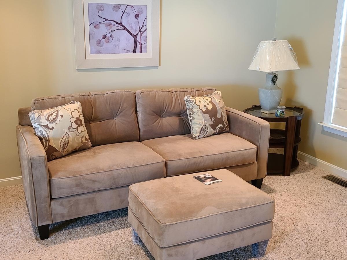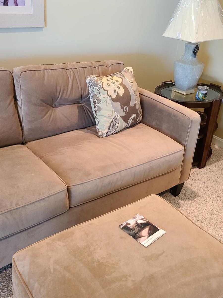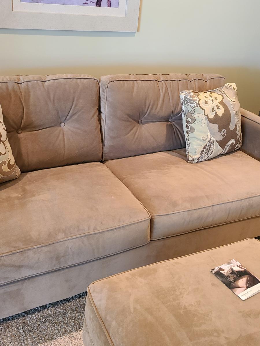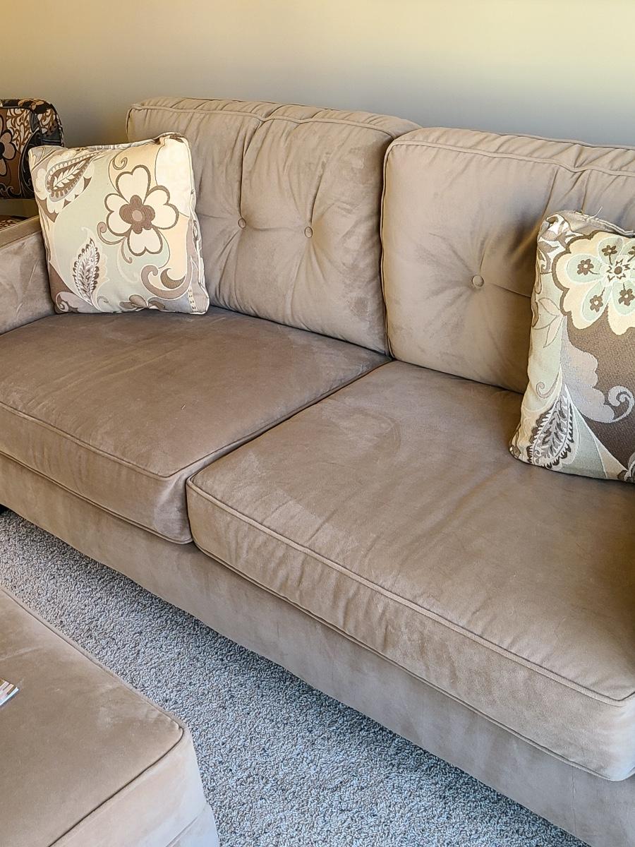 This set is still like new. It was displayed in a loft of a single person's home. Still has original card from purchase with details. This is a soft brown coffee color microfiber (easy to clean) couch. So soft and comfortable! Excellent chance to refurnish at a fraction of the cost! This is for the couch/pillows and matching ottoman only. The pictures show condition, measurements if taken, and what is included in the lot. Due to the large amount that we photograph and the time frame, we are not always able to take measurements. All items unless noted, are pre-owned and have been used. If you purchased furniture, you must bring help. We do not allow one person to carry large furniture out on their own. Bring help, tools and a truck for the safety of our client’s homes, and your personal safety. Any damages that result to the property including walls, and floors due to moving of the furniture will be charged to the buyer. Company policy. Thank you.