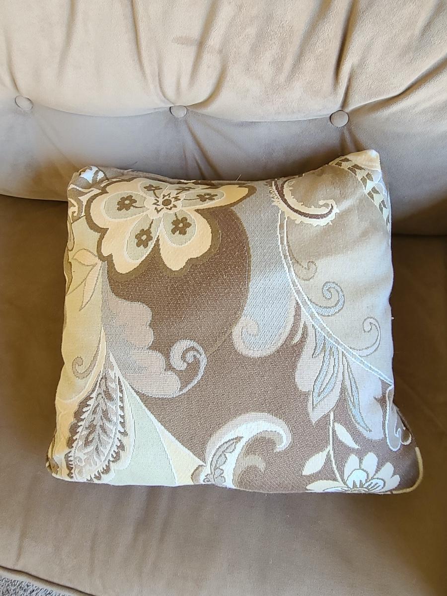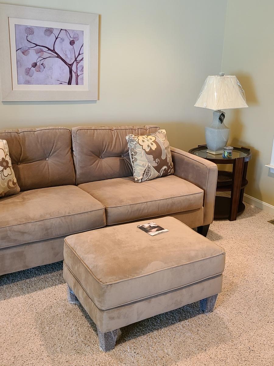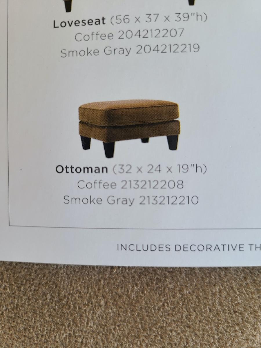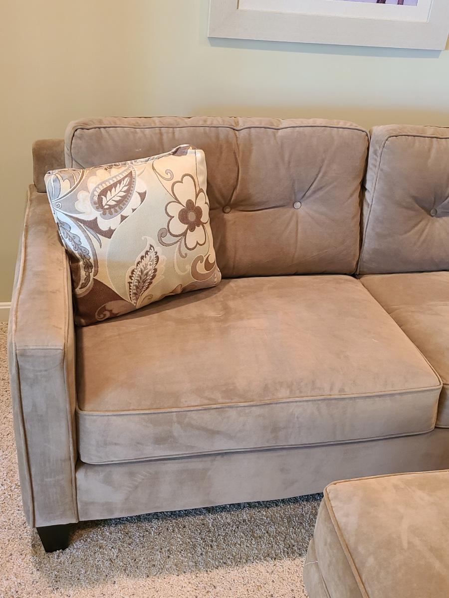 This set is still like new. It was displayed in a loft of a single person's home. Still has original card from purchase with details. This is a soft brown coffee color microfiber (easy to clean) couch. So soft and comfortable! Excellent chance to refurnish at a fraction of the cost! This is for the couch/pillows and matching ottoman only. The pictures show condition, measurements if taken, and what is included in the lot. Due to the large amount that we photograph and the time frame, we are not always able to take measurements. All items unless noted, are pre-owned and have been used. If you purchased furniture, you must bring help. We do not allow one person to carry large furniture out on their own. Bring help, tools and a truck for the safety of our client’s homes, and your personal safety. Any damages that result to the property including walls, and floors due to moving of the furniture will be charged to the buyer. Company policy. Thank you.